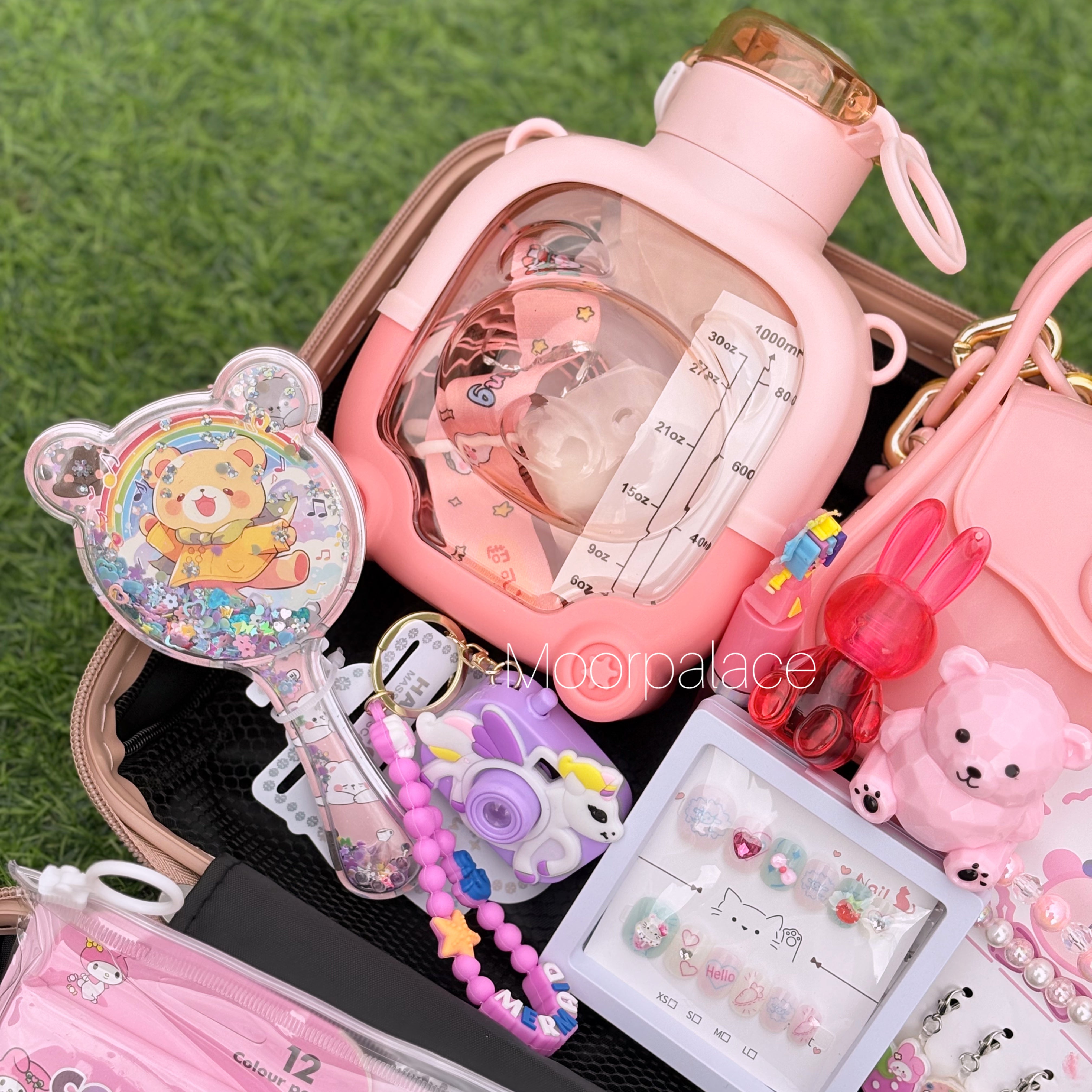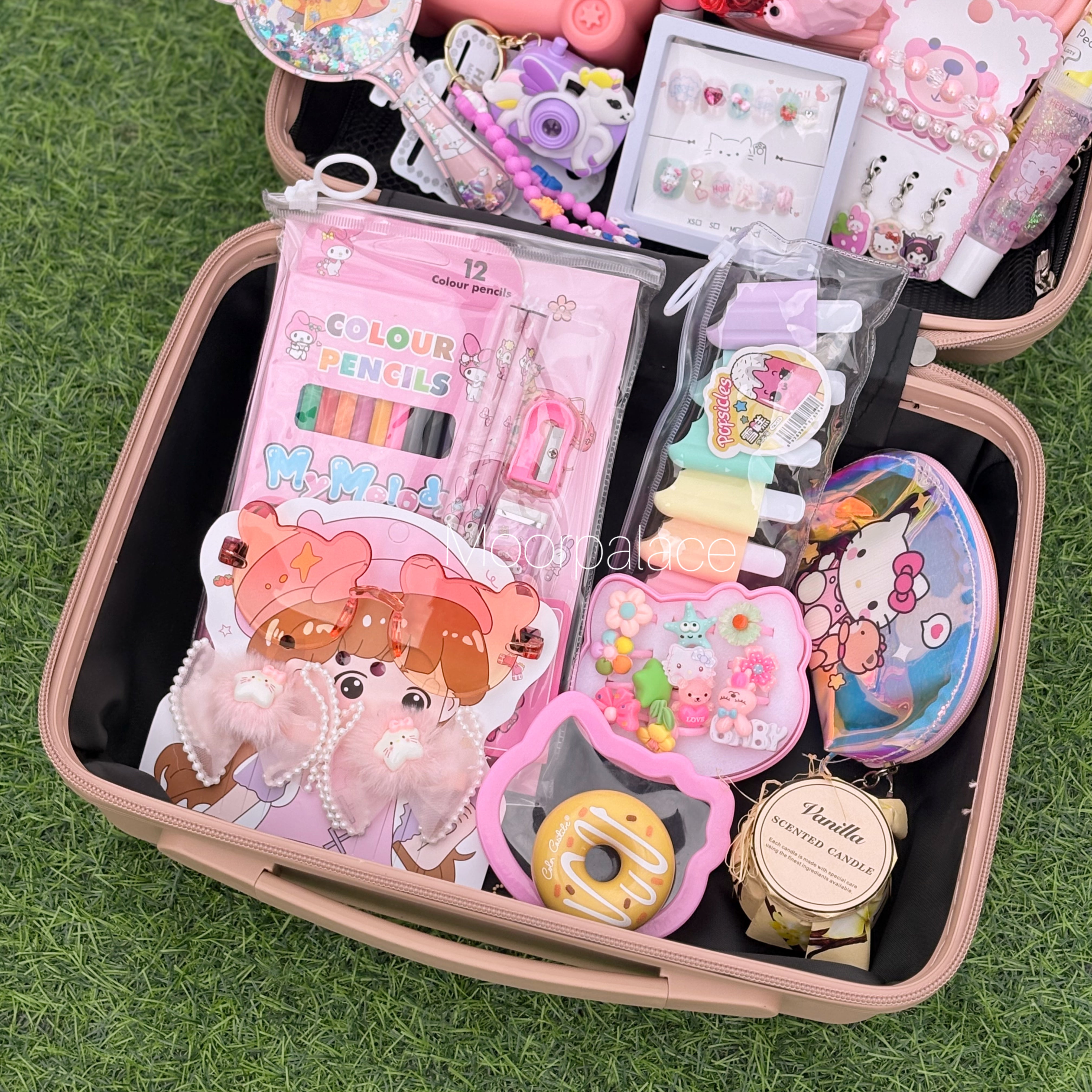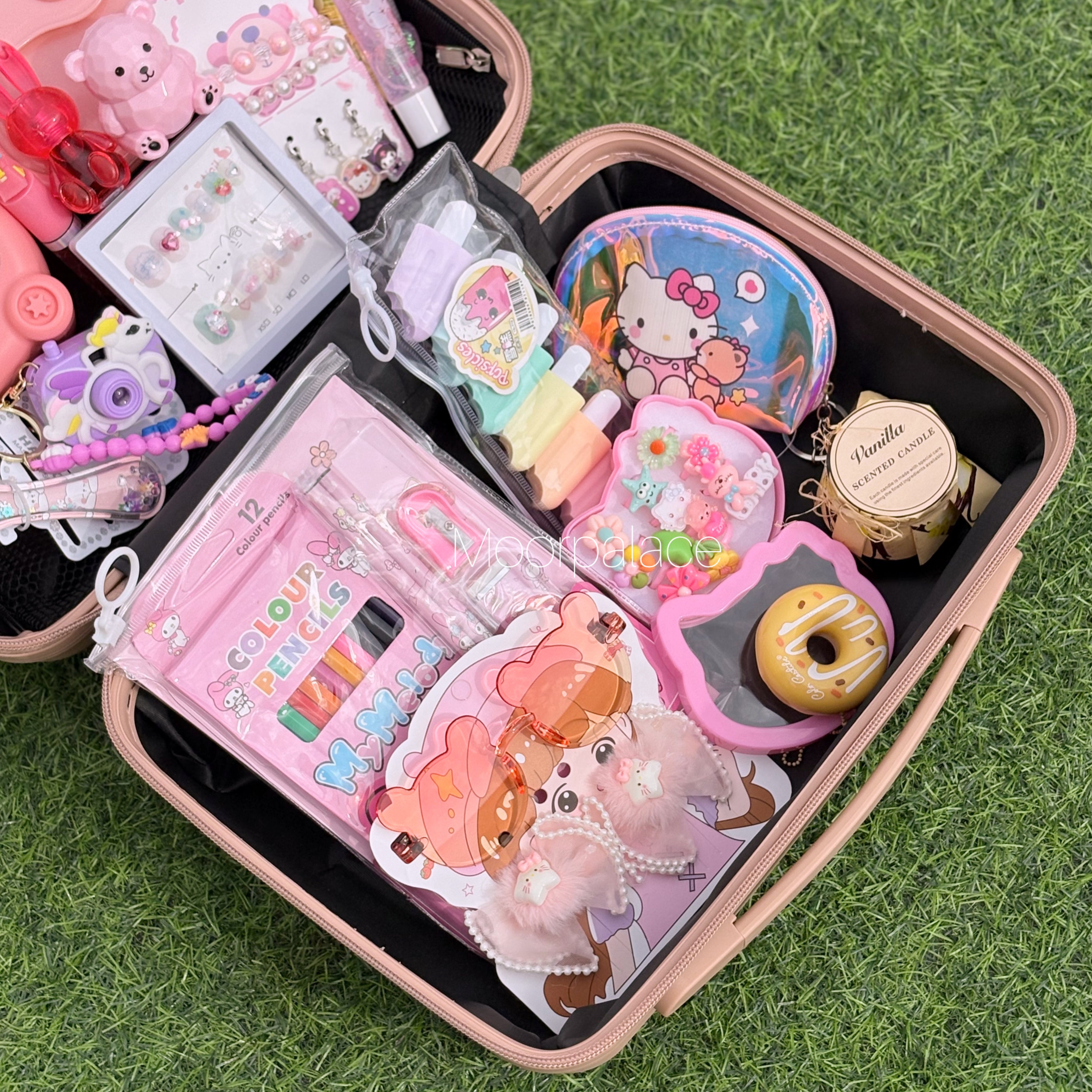 This cutest deal is specially customised for your little one. This suitcase has all the cutest products including hair accessories, ring box which has almost 7 to 8 rings, a cutest water bottle, gloss, tint, balm, key-chain, stationery kit, cute mini coin pouch, bag, nail box, bracelet, glasses and hair clip set, hair comb and paper soap.