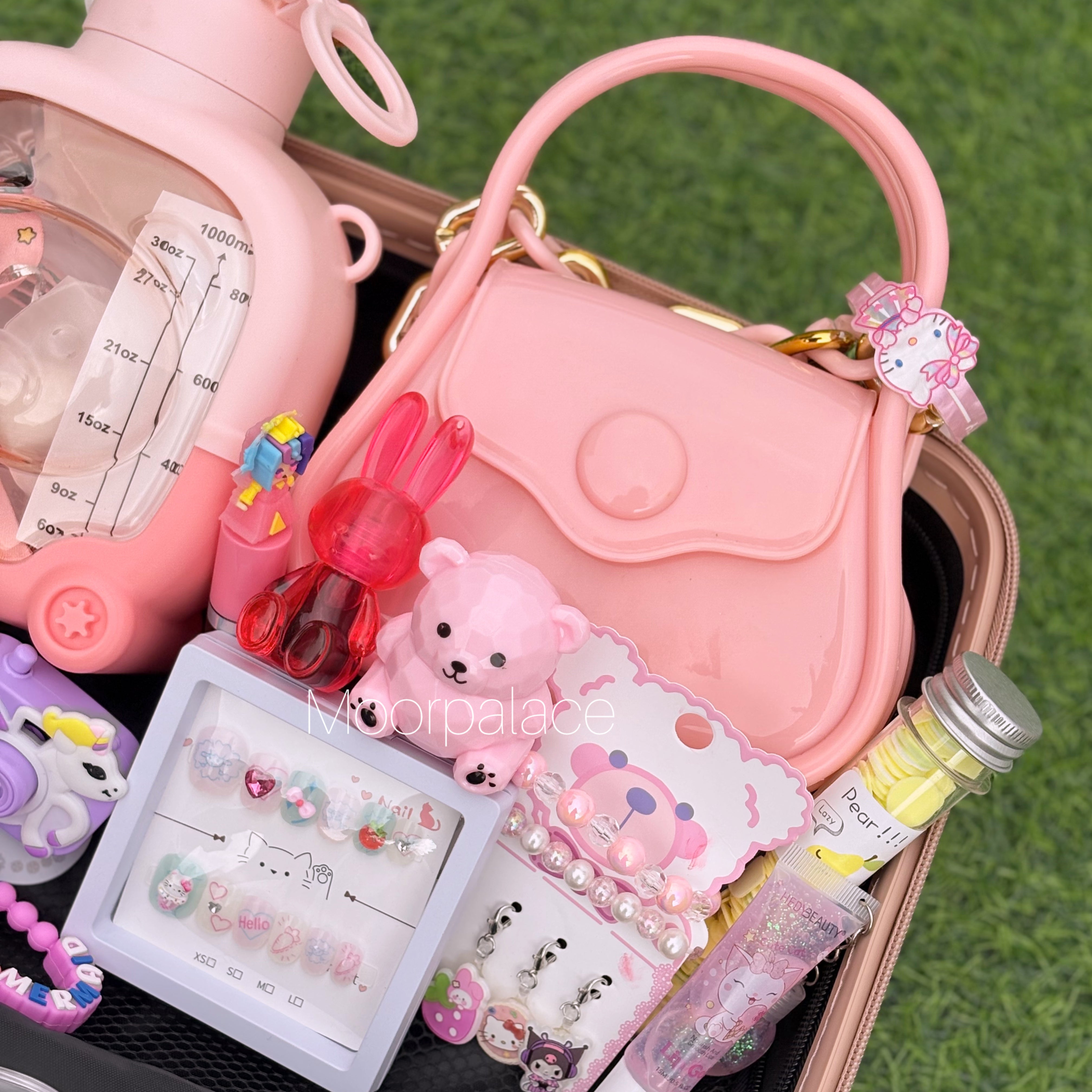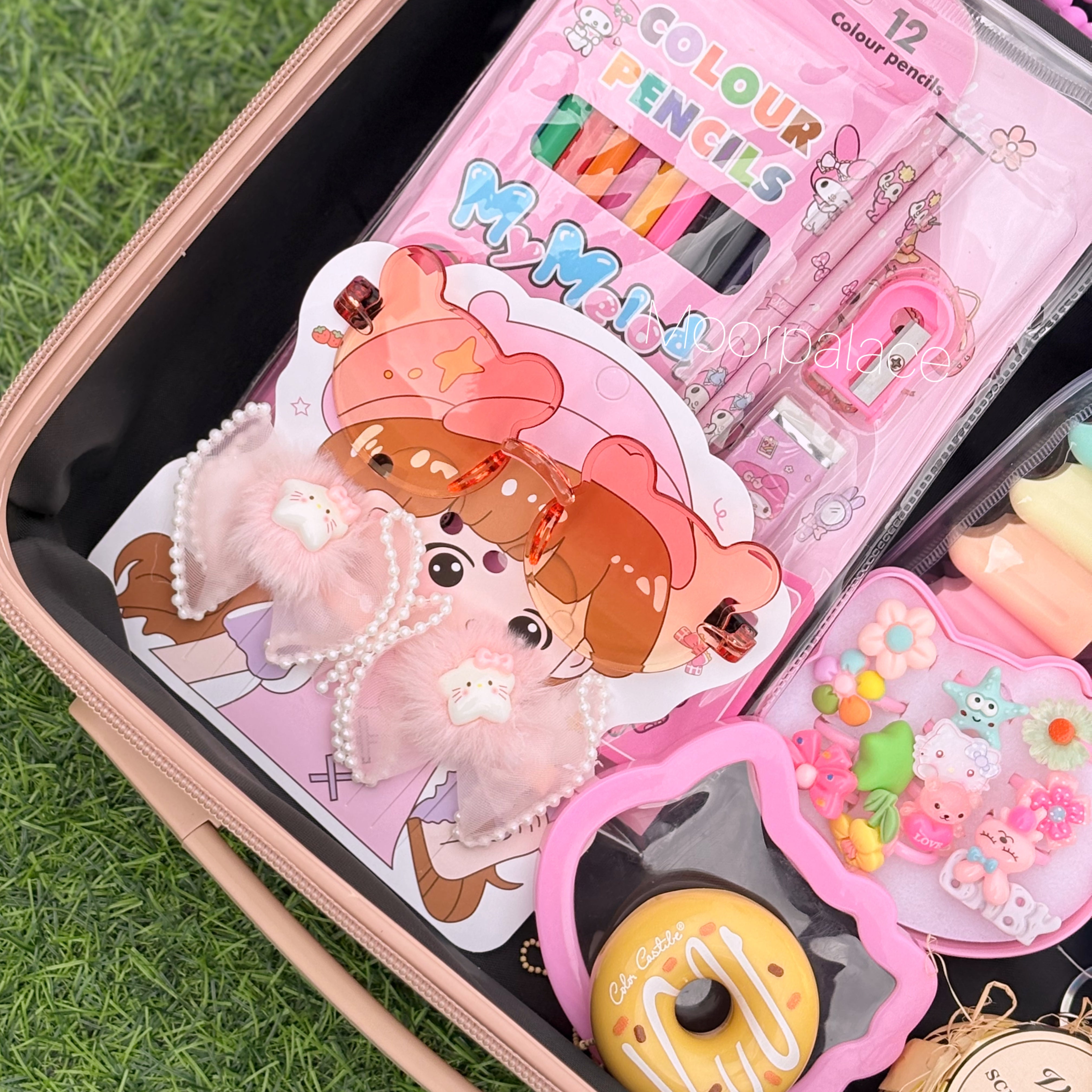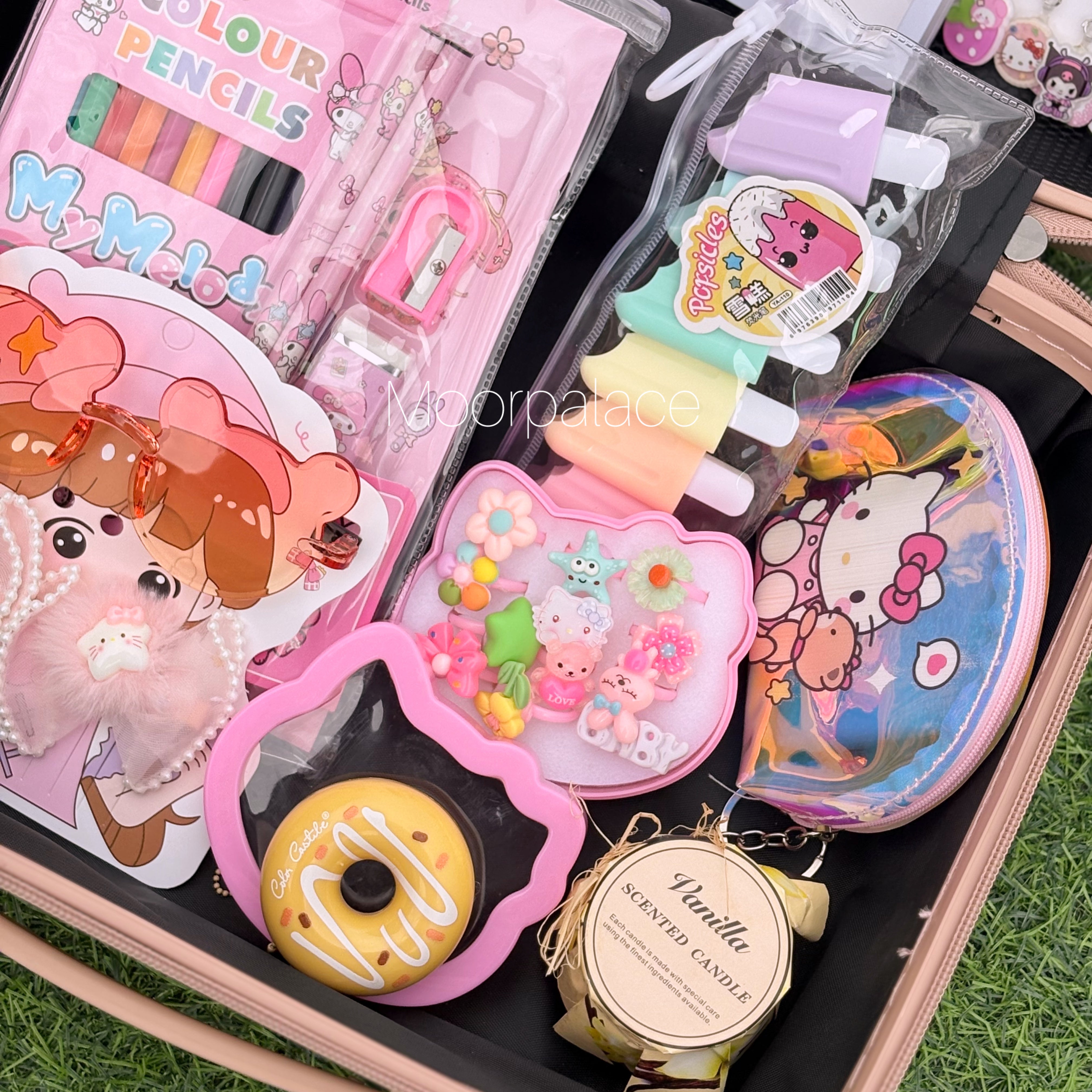 This cutest deal is specially customised for your little one. This suitcase has all the cutest products including hair accessories, ring box which has almost 7 to 8 rings, a cutest water bottle, gloss, tint, balm, key-chain, stationery kit, cute mini coin pouch, bag, nail box, bracelet, glasses and hair clip set, hair comb and paper soap.