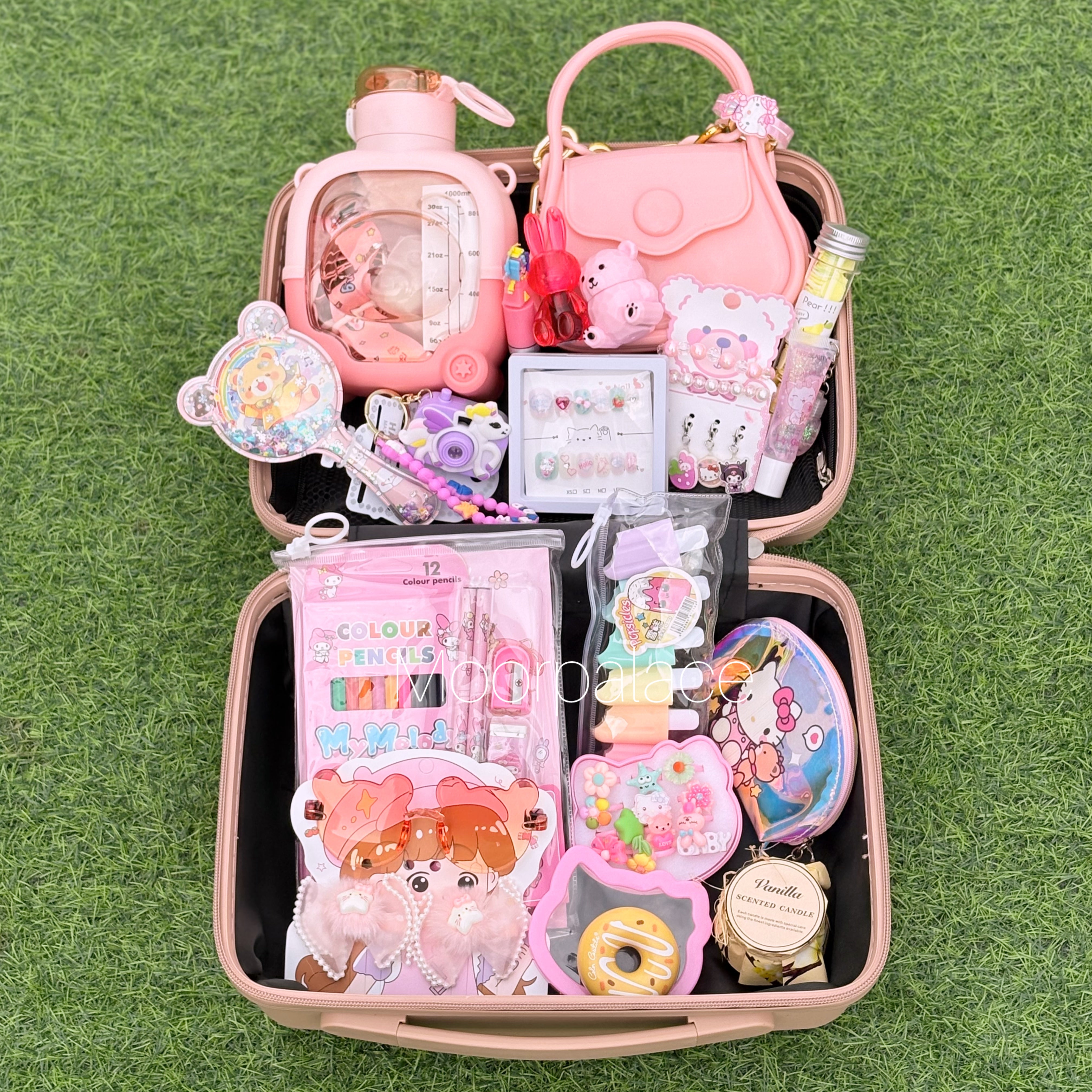 This cutest deal is specially customised for your little one. This suitcase has all the cutest products including hair accessories, ring box which has almost 7 to 8 rings, a cutest water bottle, gloss, tint, balm, keychain, stationery kit, cute mini coin pouch, bag, nail box, bracelet, glasses and hair clip set, hair comb and paper soap.