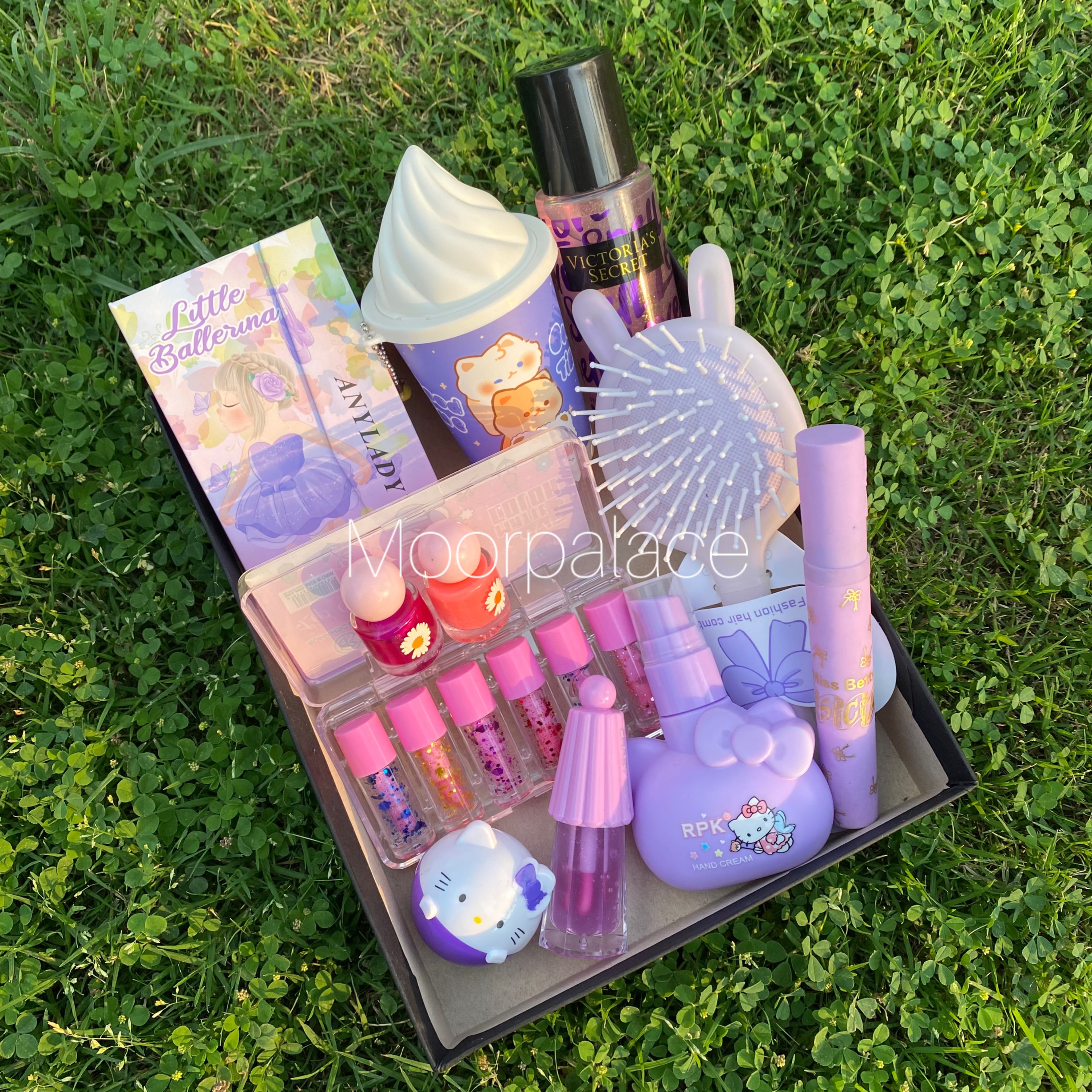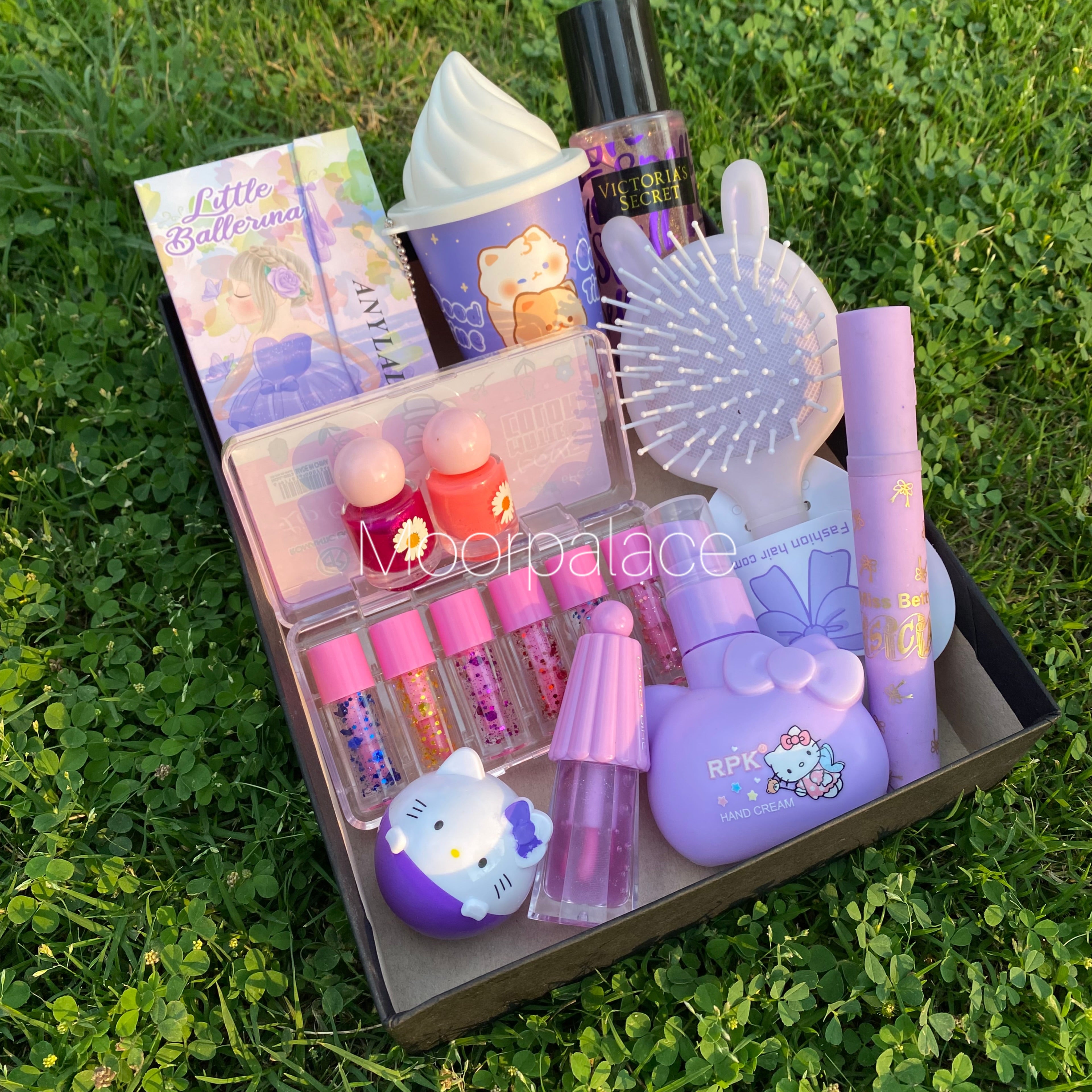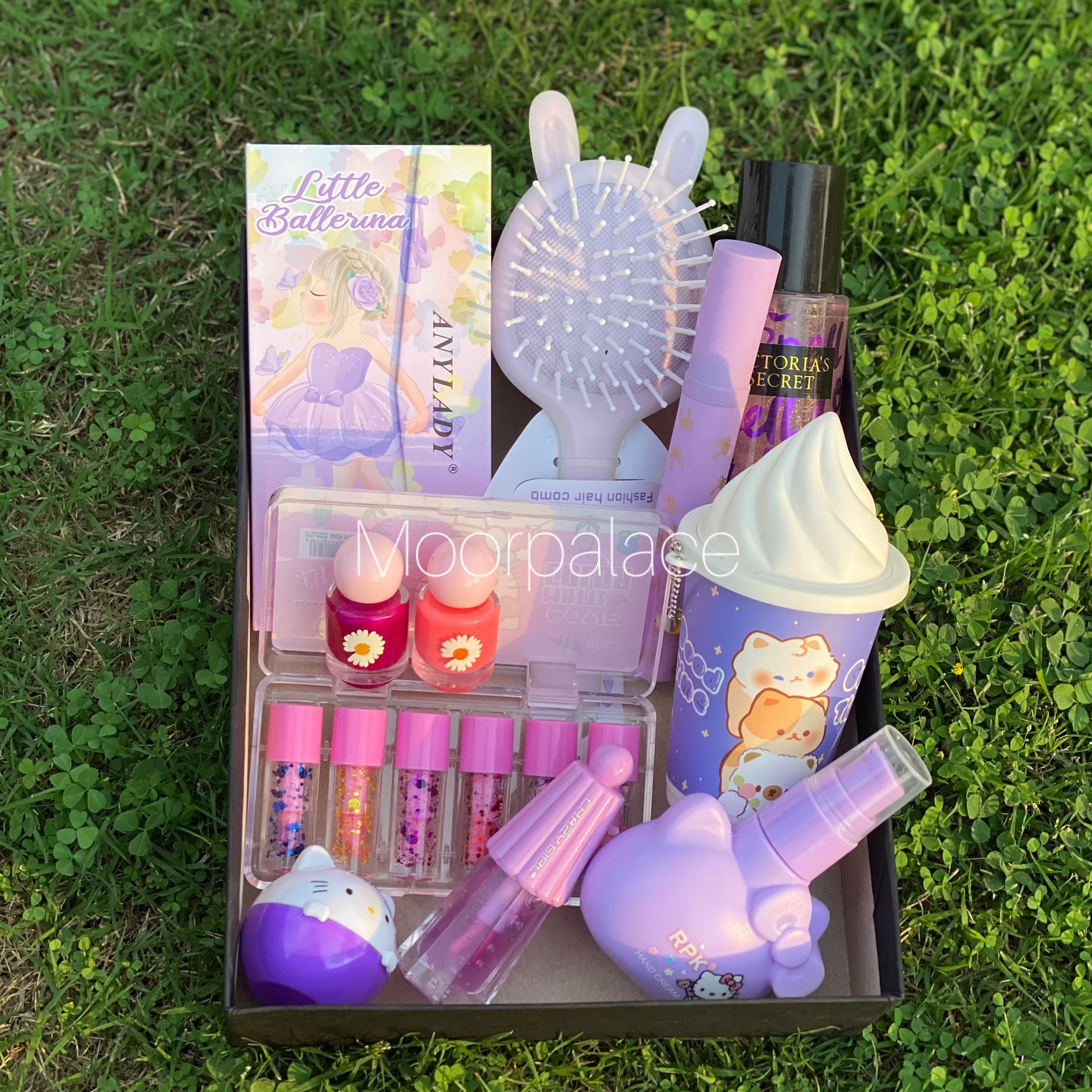 Cutest deal of all time, it includes a cute hair comb, 6 glossy gloss box, kitty hand-cream, eye shadow pallet, lip gloss, lip balm, can wipes, mascara, mist and 2 nail paints.