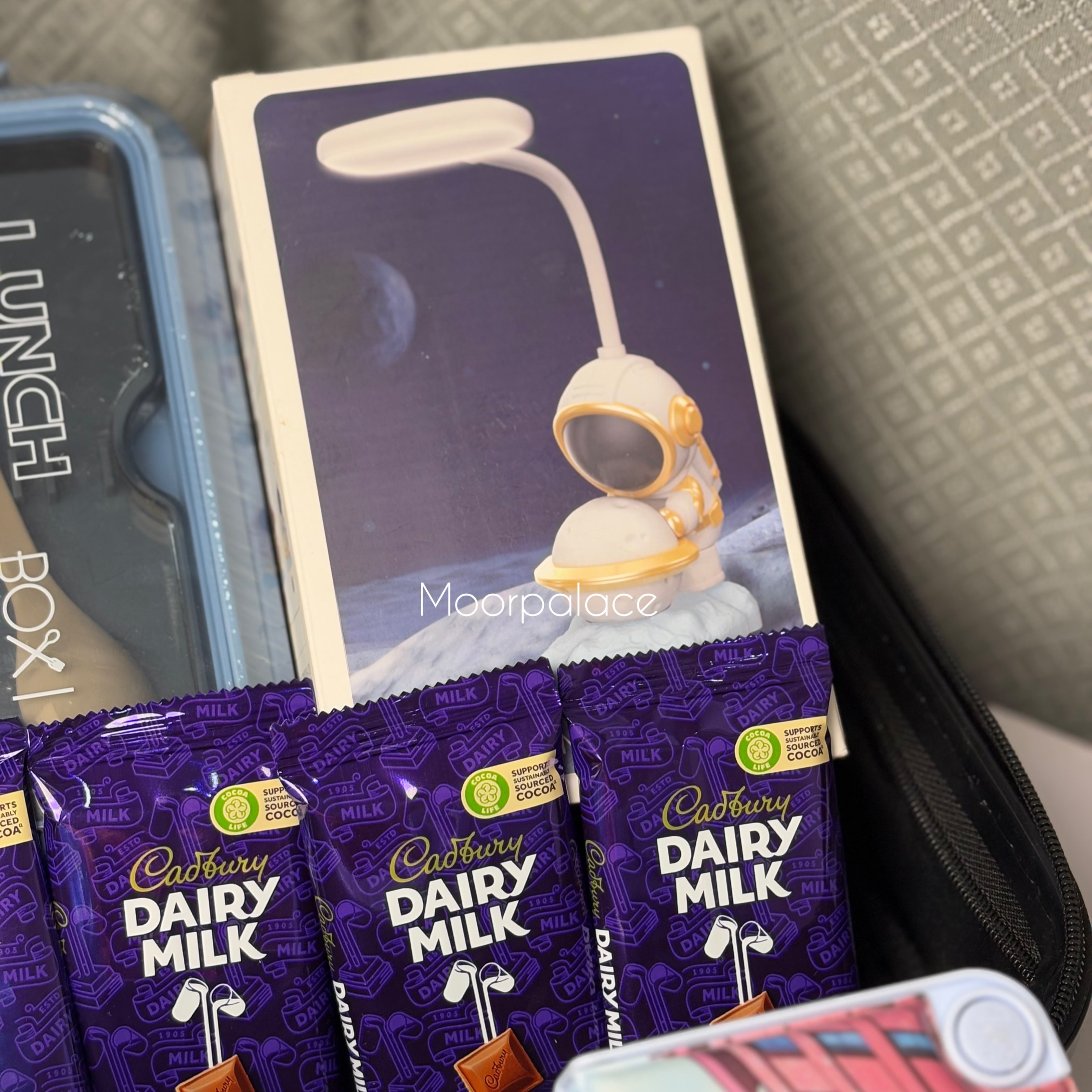 This space theme deal has stationary box, table lamp, markers, bottle, 5in1 pen, lunch box, watch, can wipes, color box, water bottle, paper soap, mix chocolates along with the suitcase.
