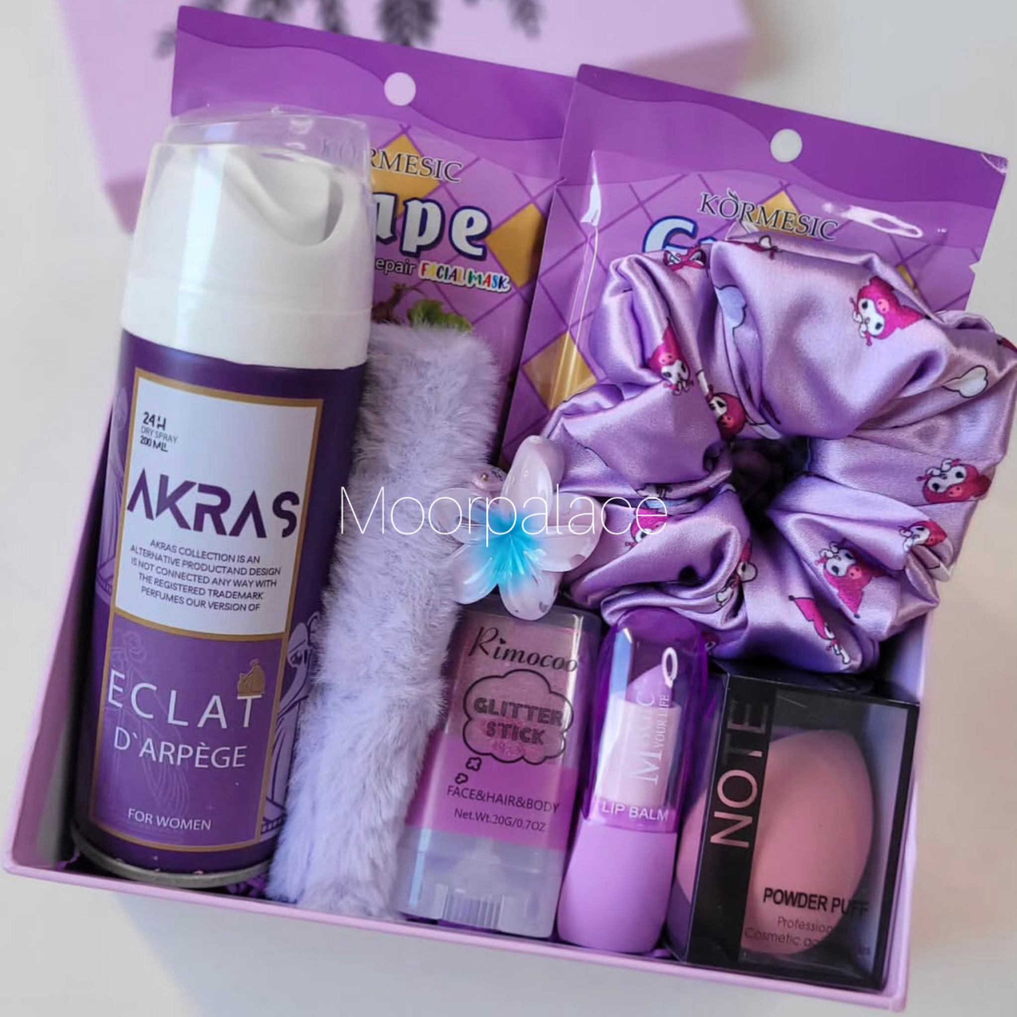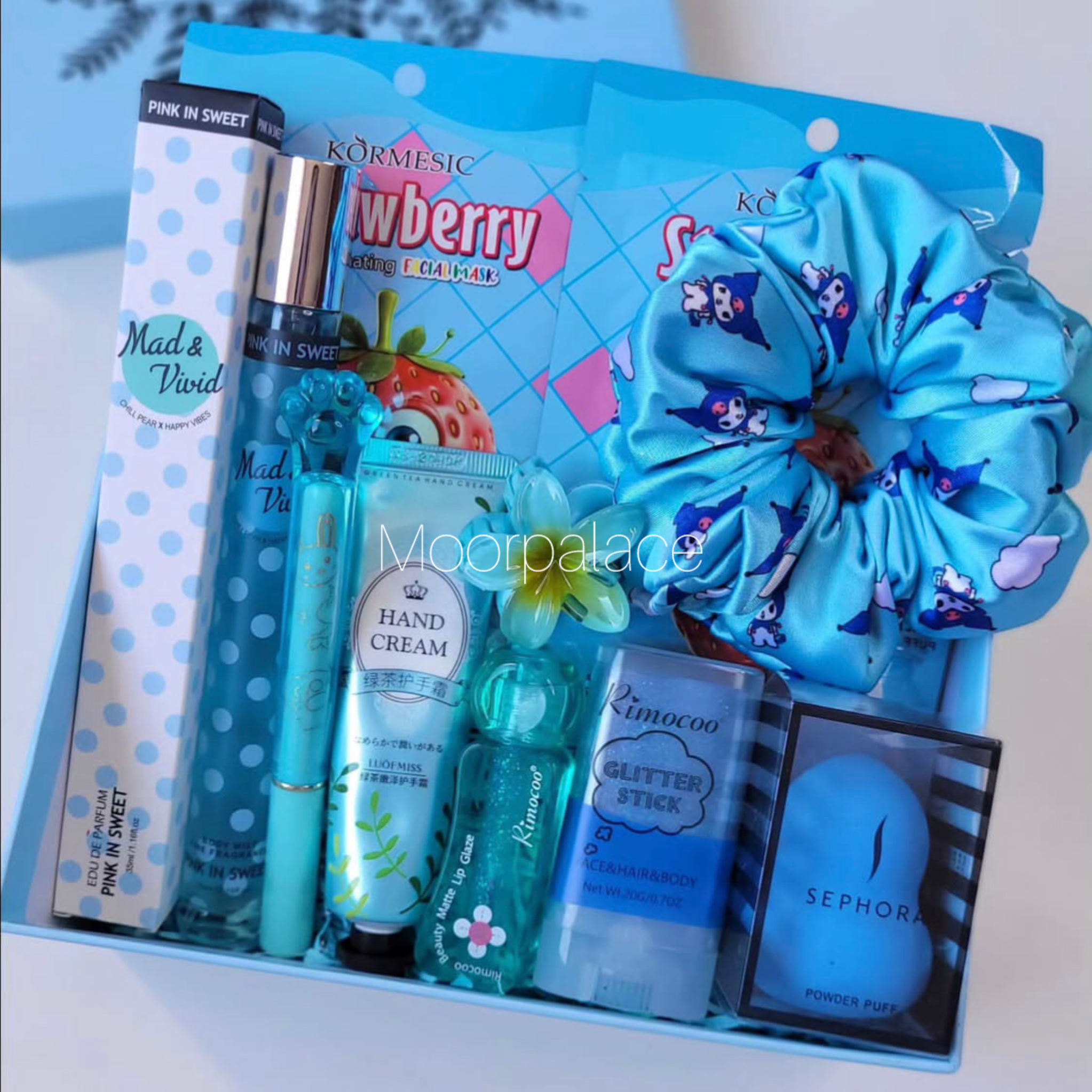 10 products are included in this amazing and super reasonable deal.This deal has 2 sheet masks, balm, gloss, pen perfume, blender, claw catcher, Scrunchie and Glitter stick.