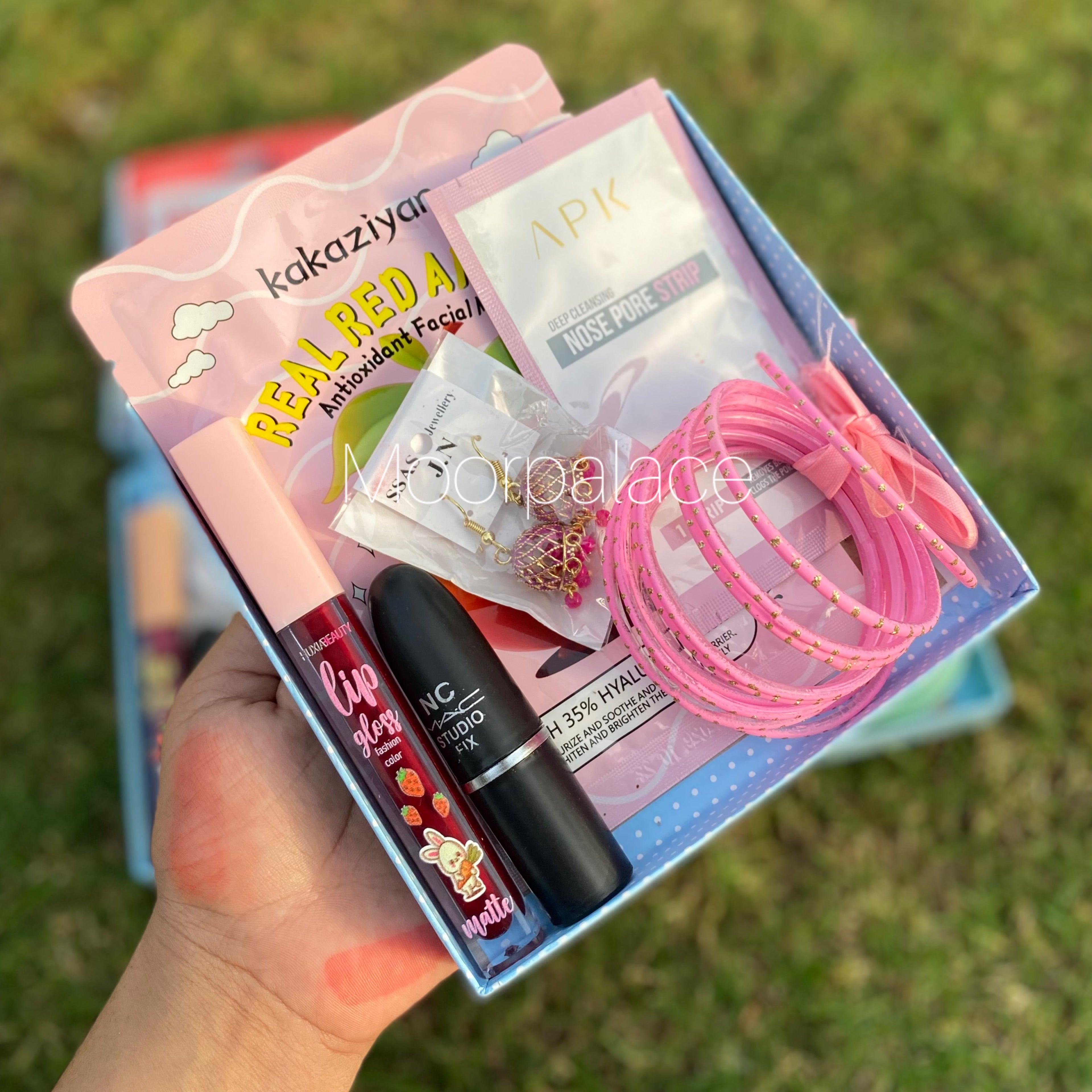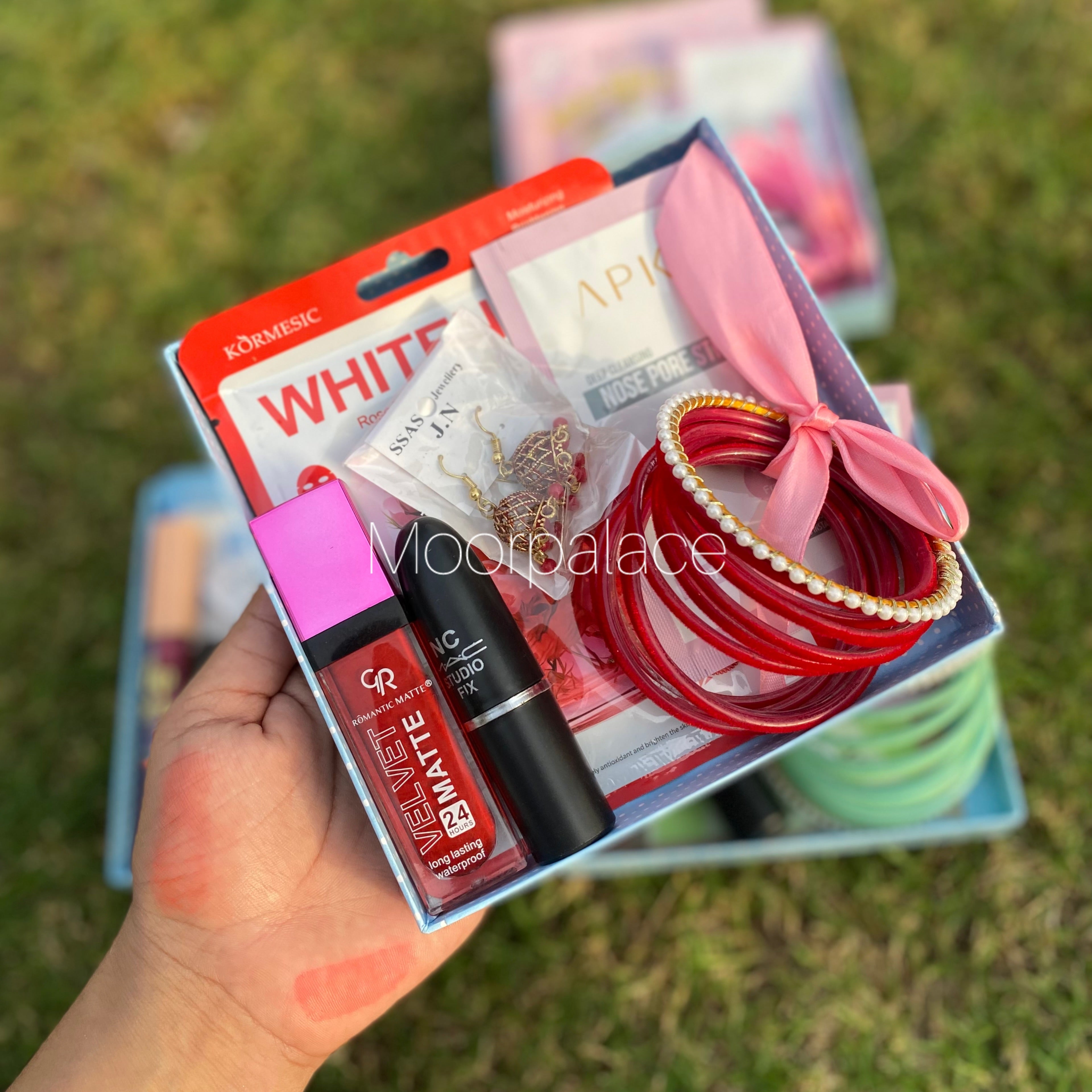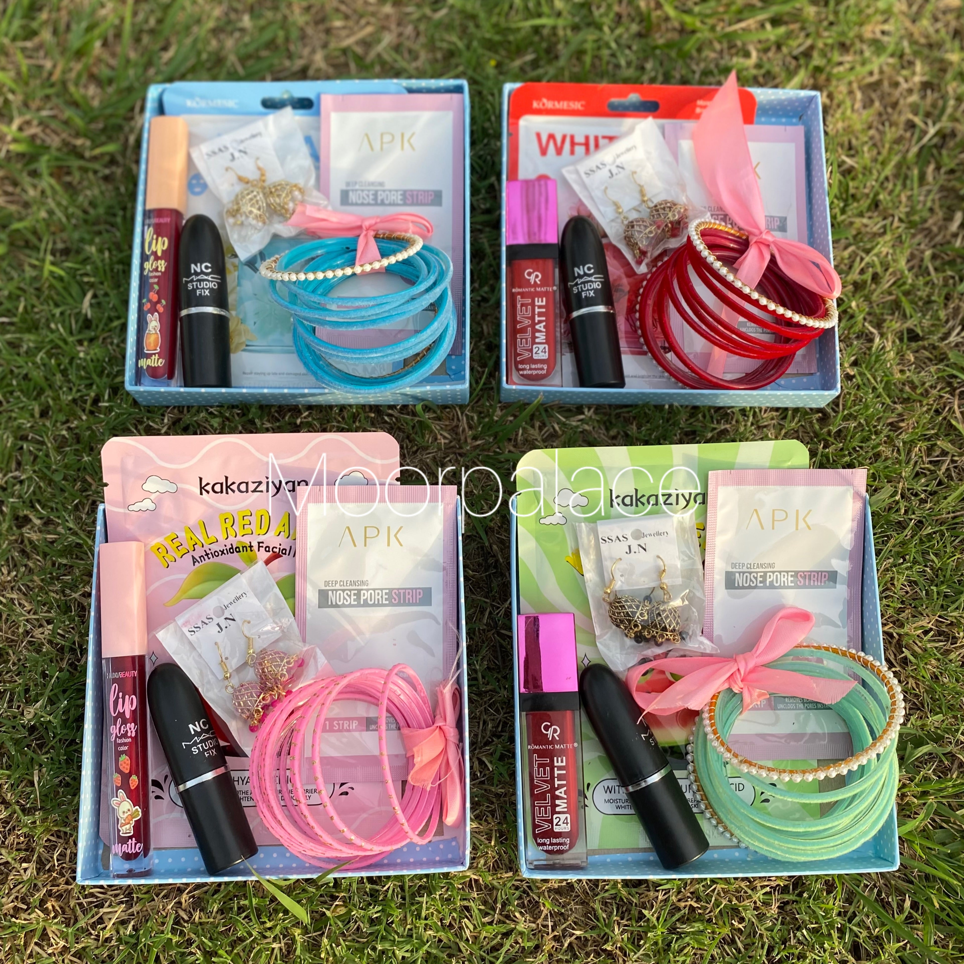 This deal is made for everyone so you all can have something from us. It has sheet mask, jhumka, bangles set of your choice, nose strip, matte gloss and lipstick.