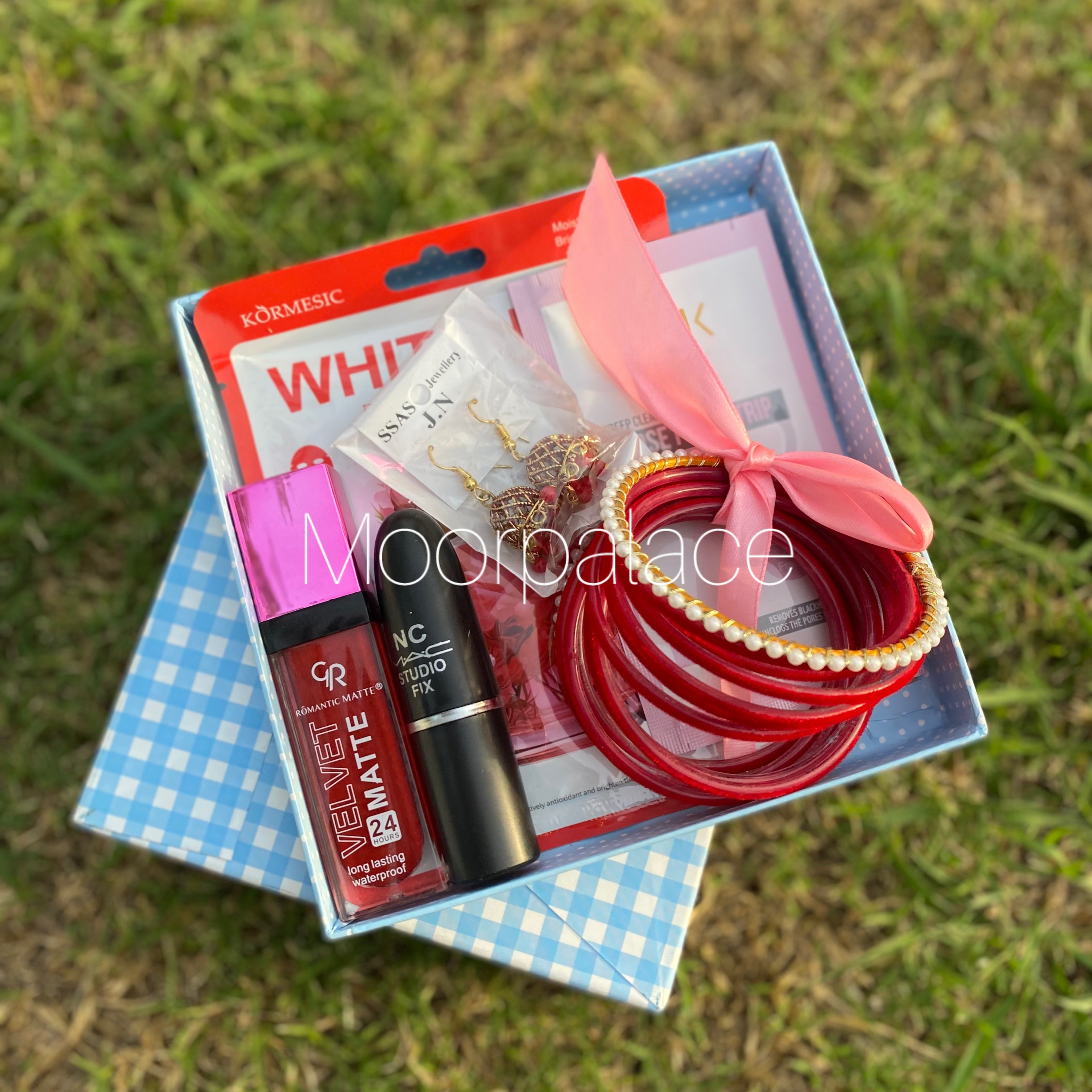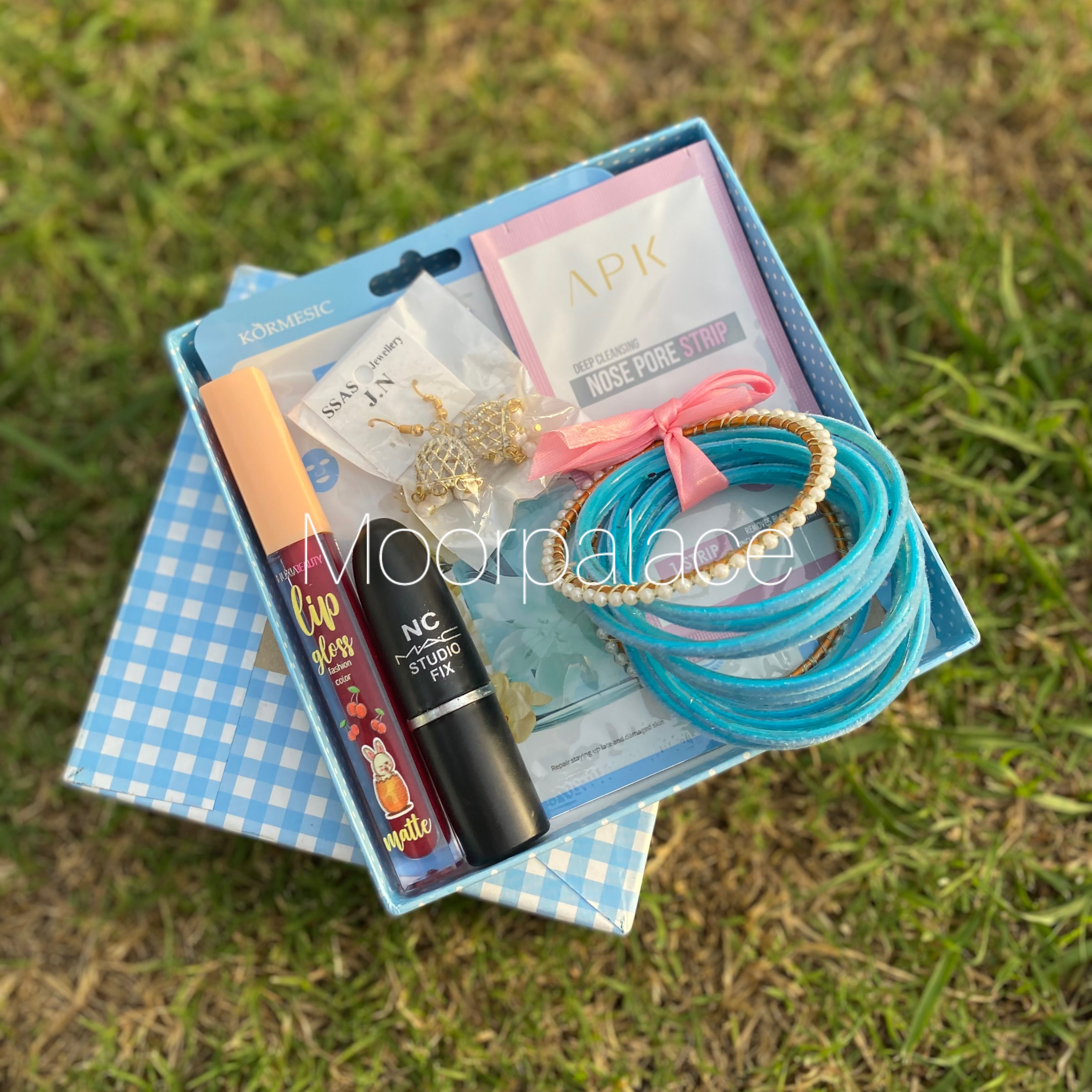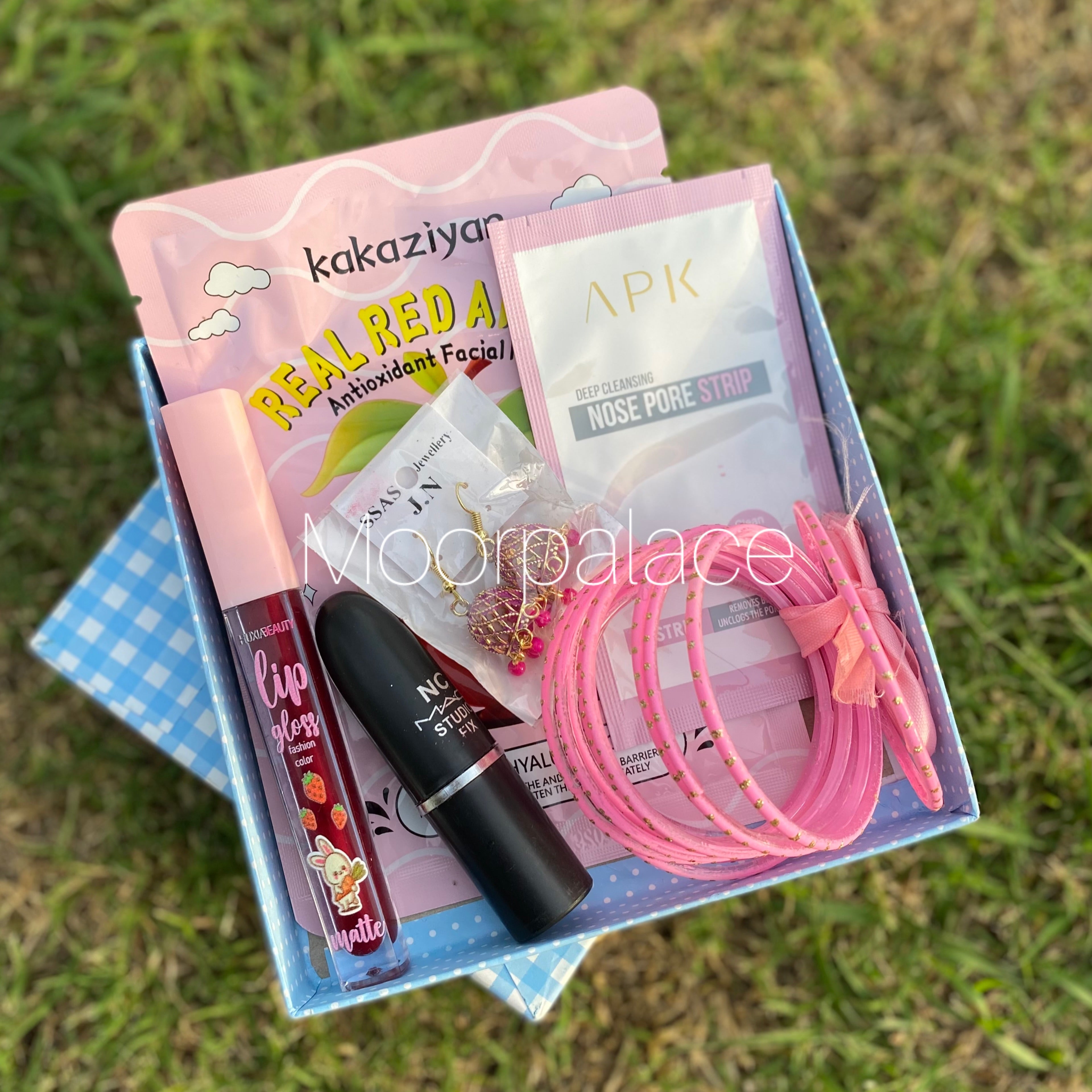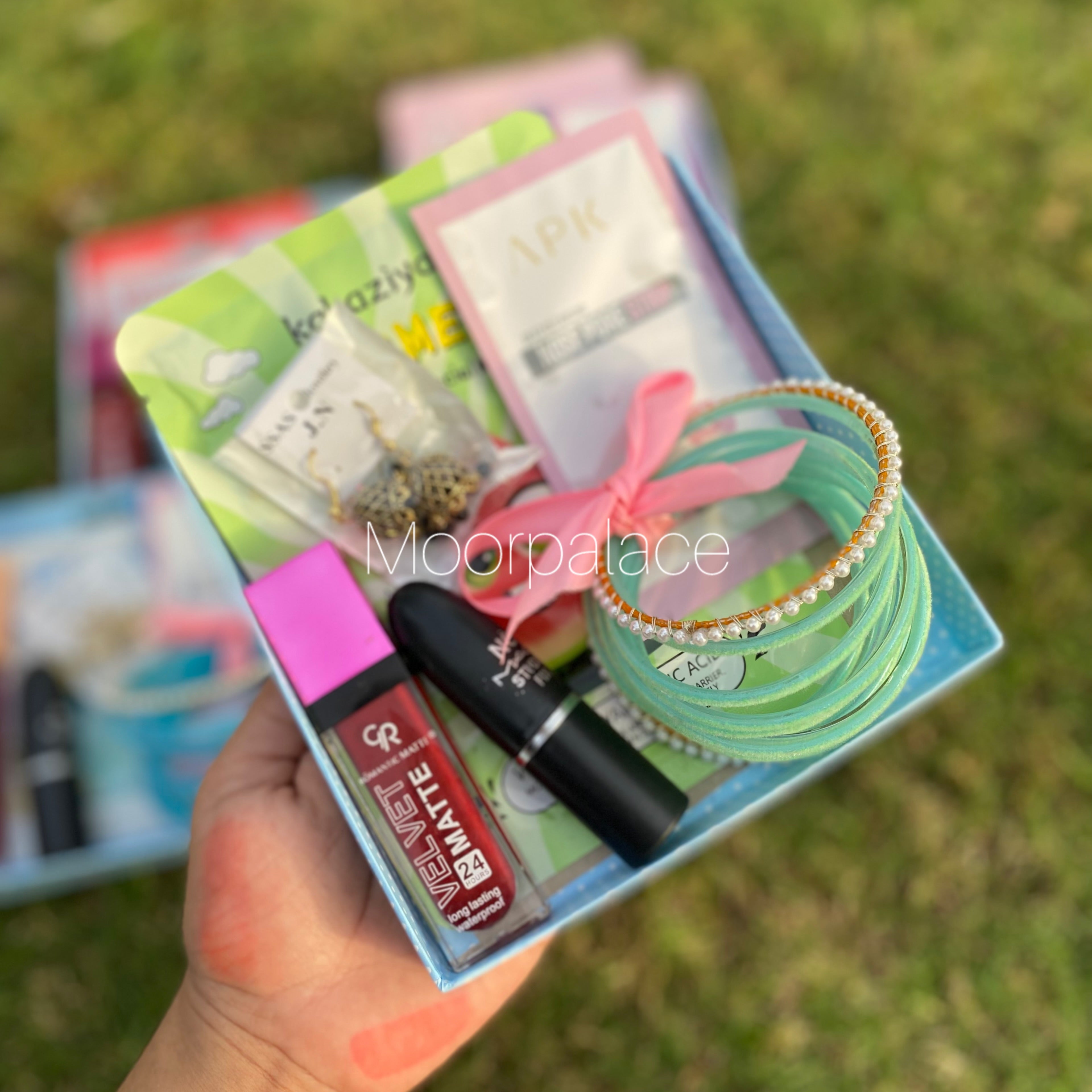 This deal is made for everyone so you all can have something from us. It has sheet mask, jhumka, bangles set of your choice, nose strip, matte gloss and lipstick.