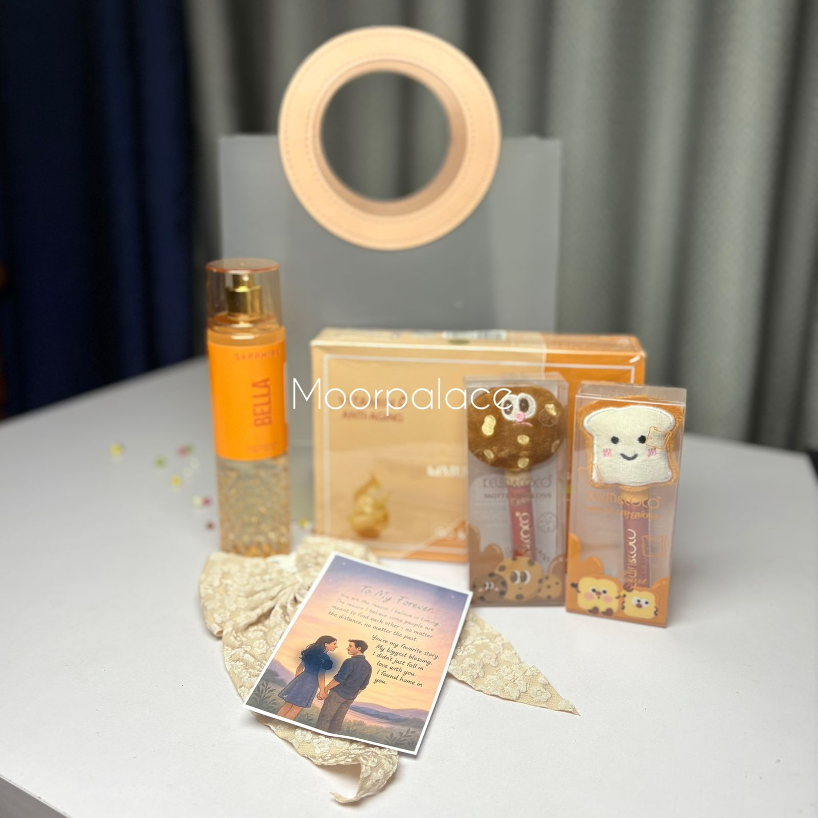 It has a beautiful stylish bag with cute plushie, facial kit, sapphire mist, a cute bow along with card.