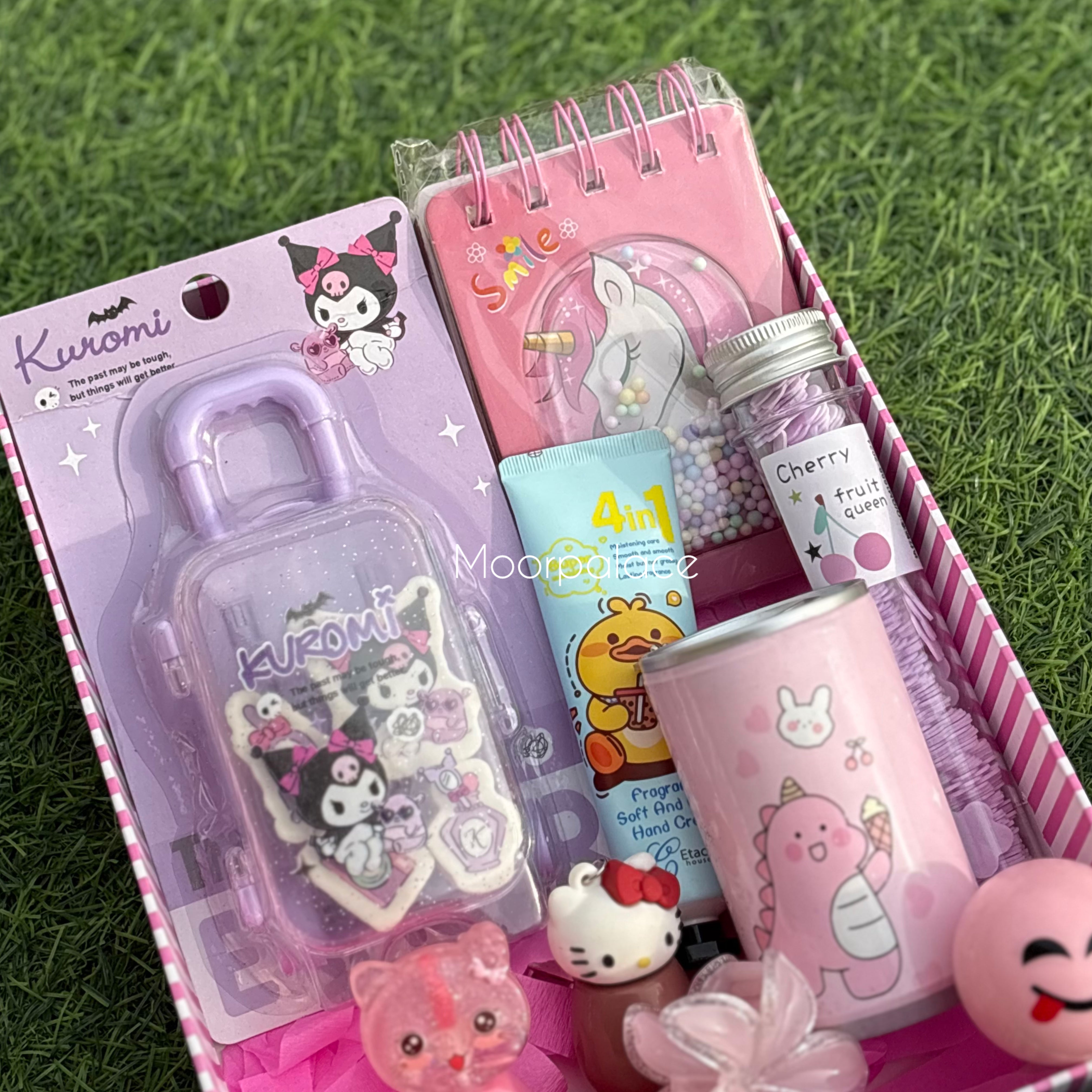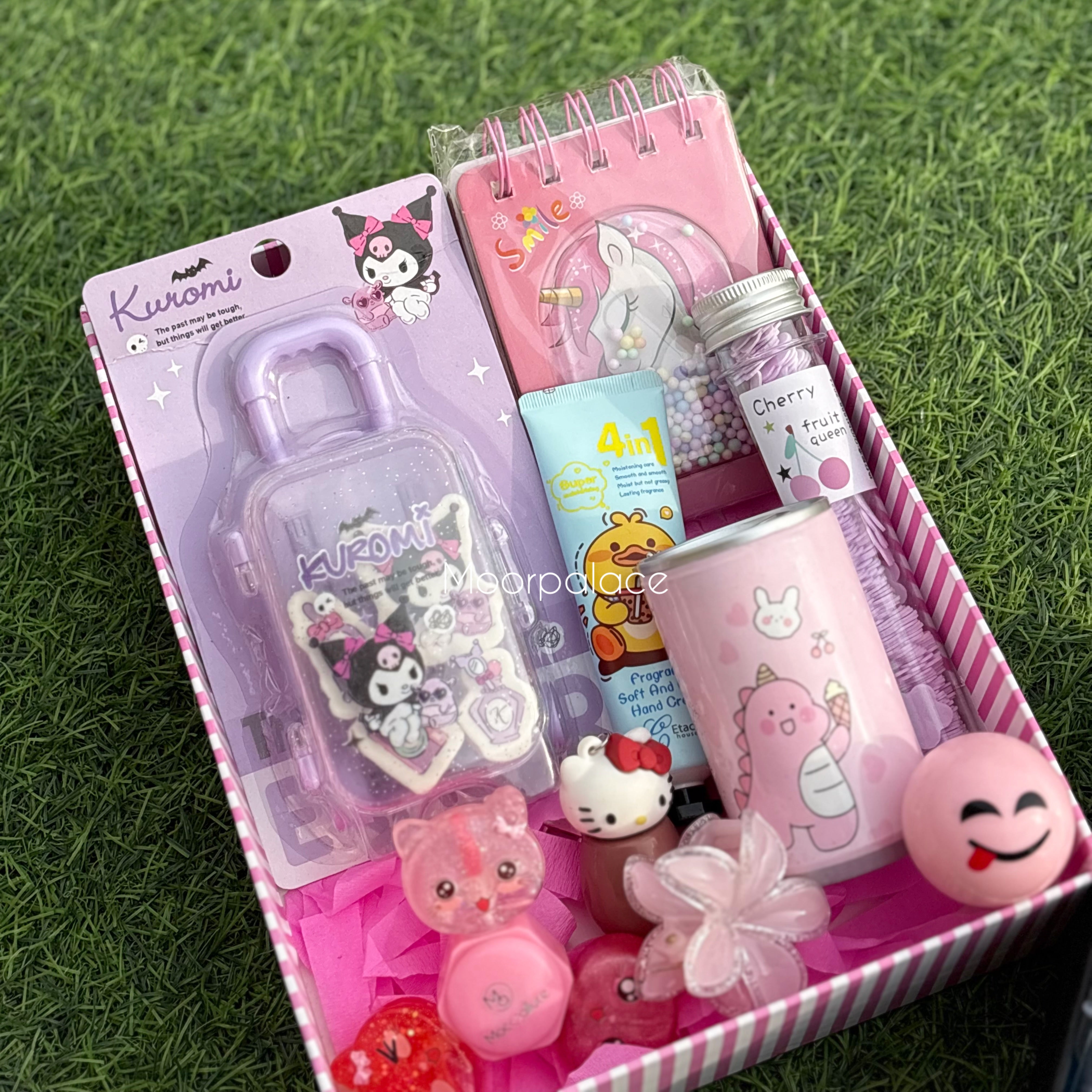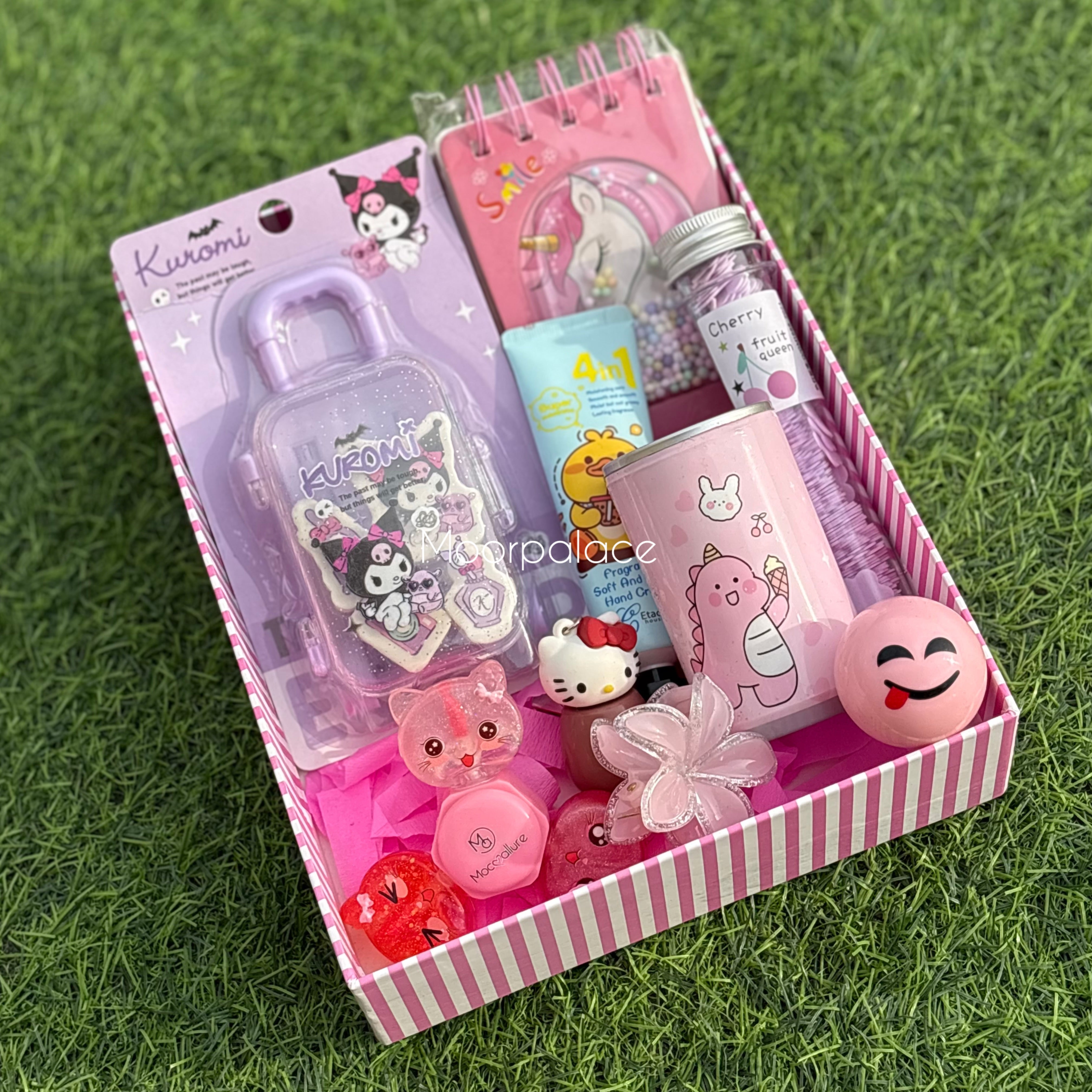 Introducing the Duo Deal Box - the perfect customizable gift for any boy or girl! The girl box includes lip gloss, eraser, wipes, paper soap, diary, balm, and hair catcher while the boy box features a marker set, pen, keychain, eraser box, wipes, and paper soap. Both boxes offer practical and fun items for your loved ones.