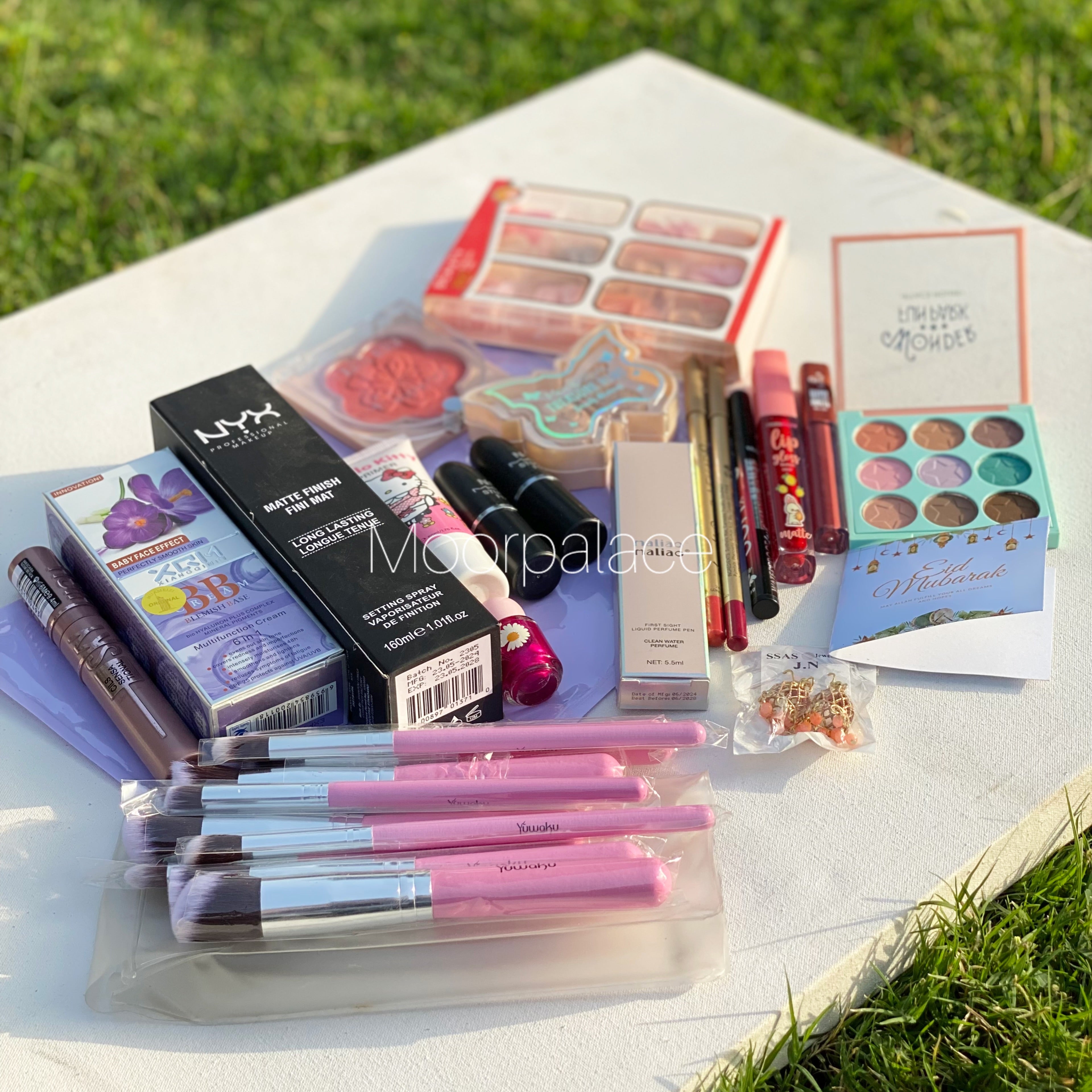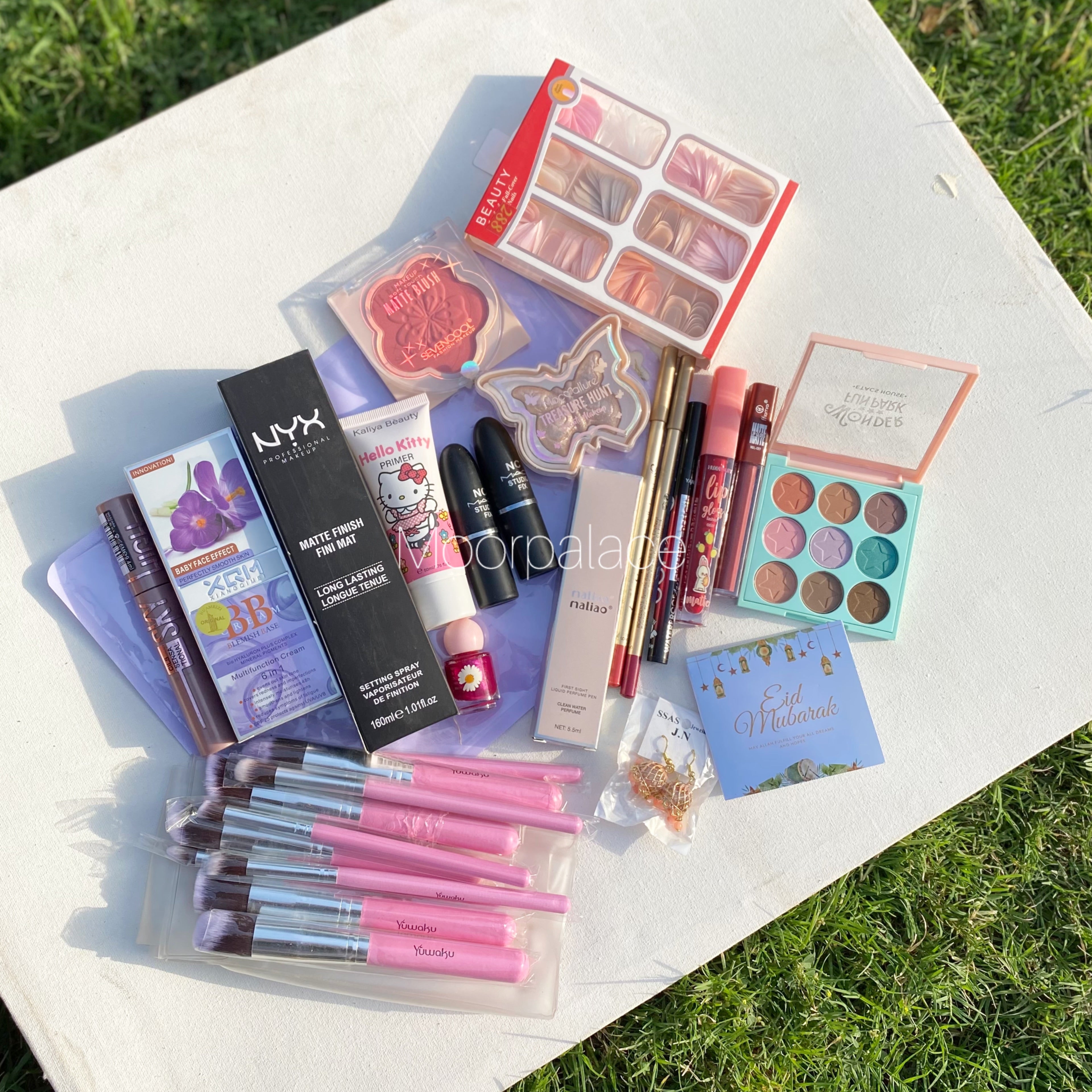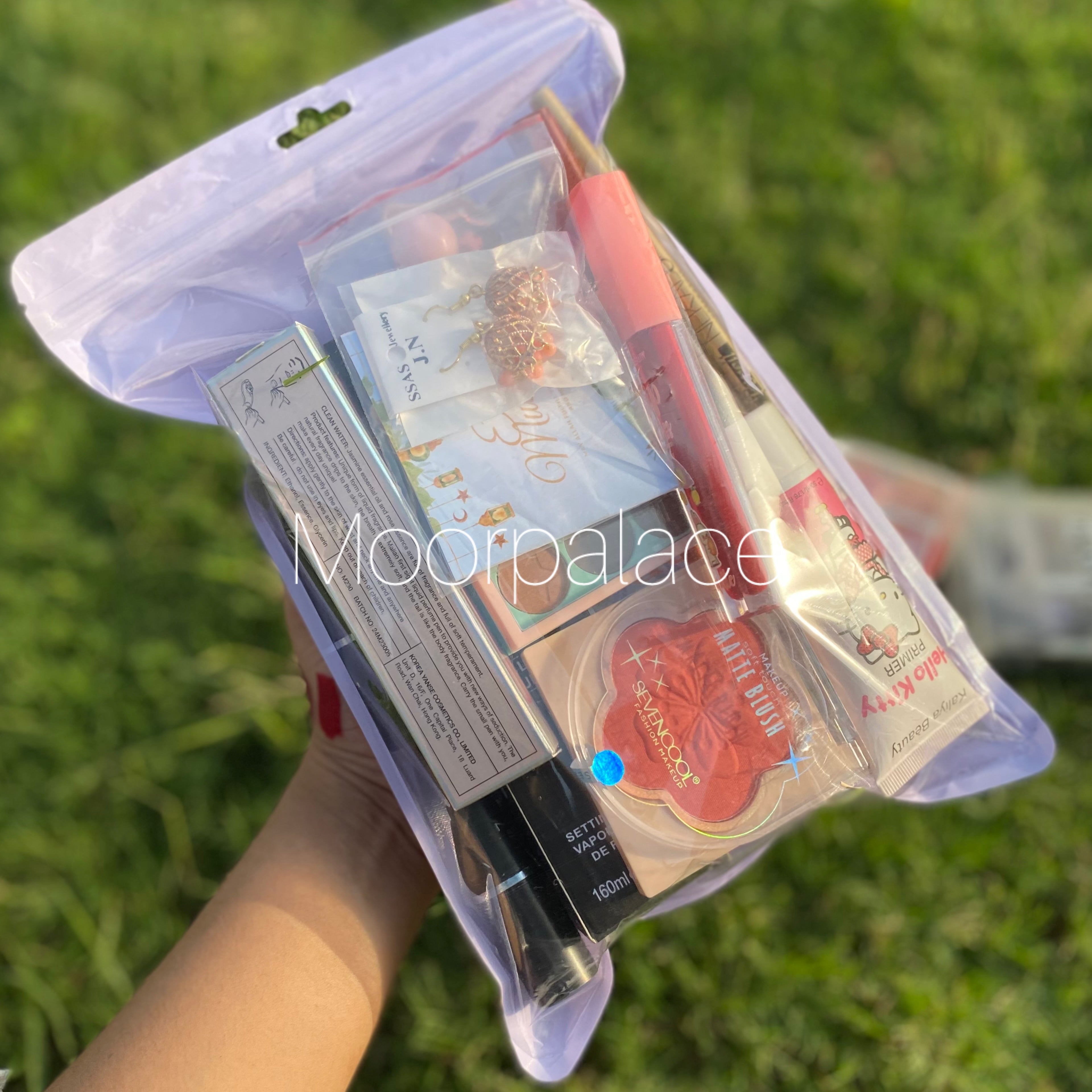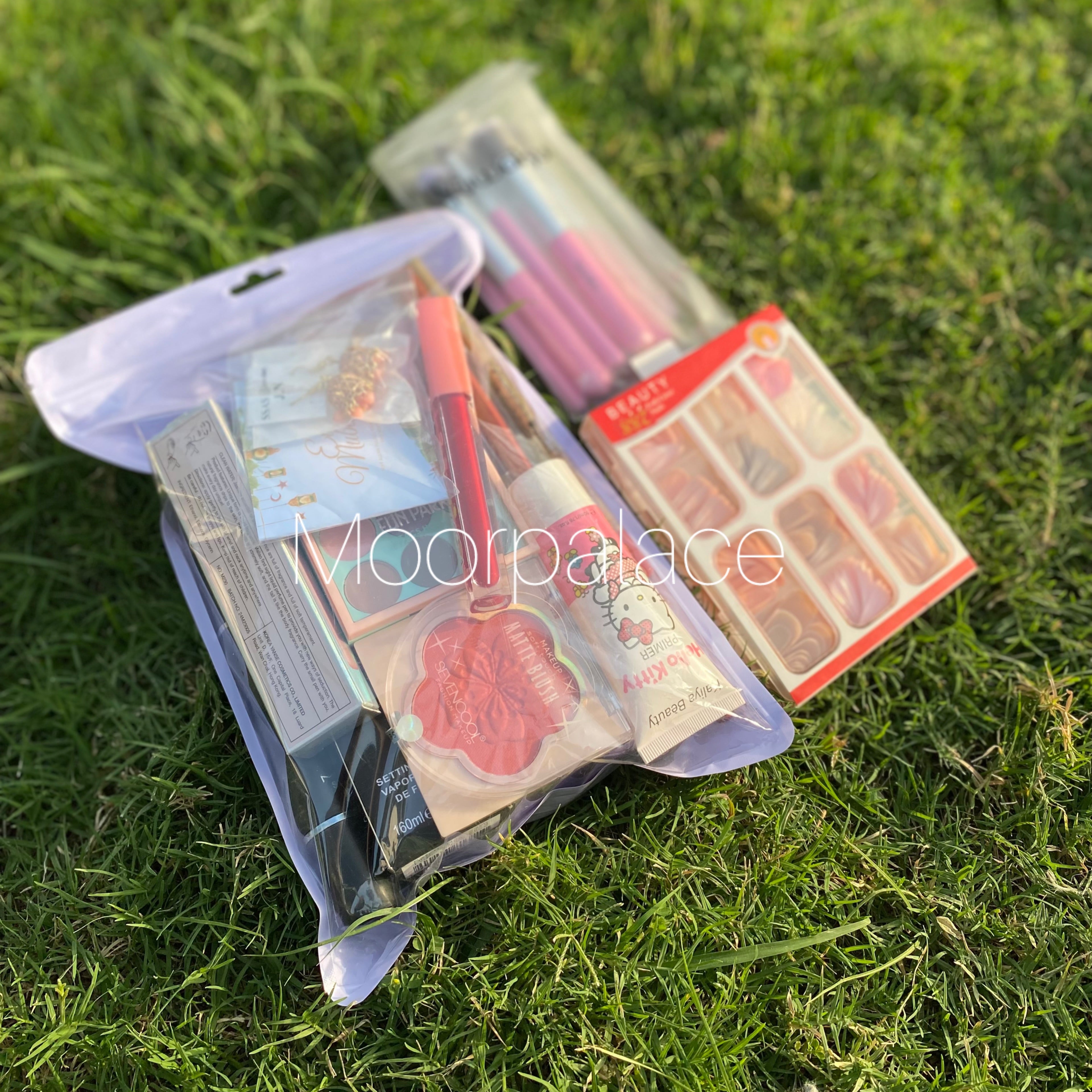 This deal includes full face brushes, French nail box, primer, foundation, fixer, eyeshadow pallete, blush, highlighter, lipsticks, matte glosses, lip liners, pen perfume, eyeliner, mascara and eid special gift.