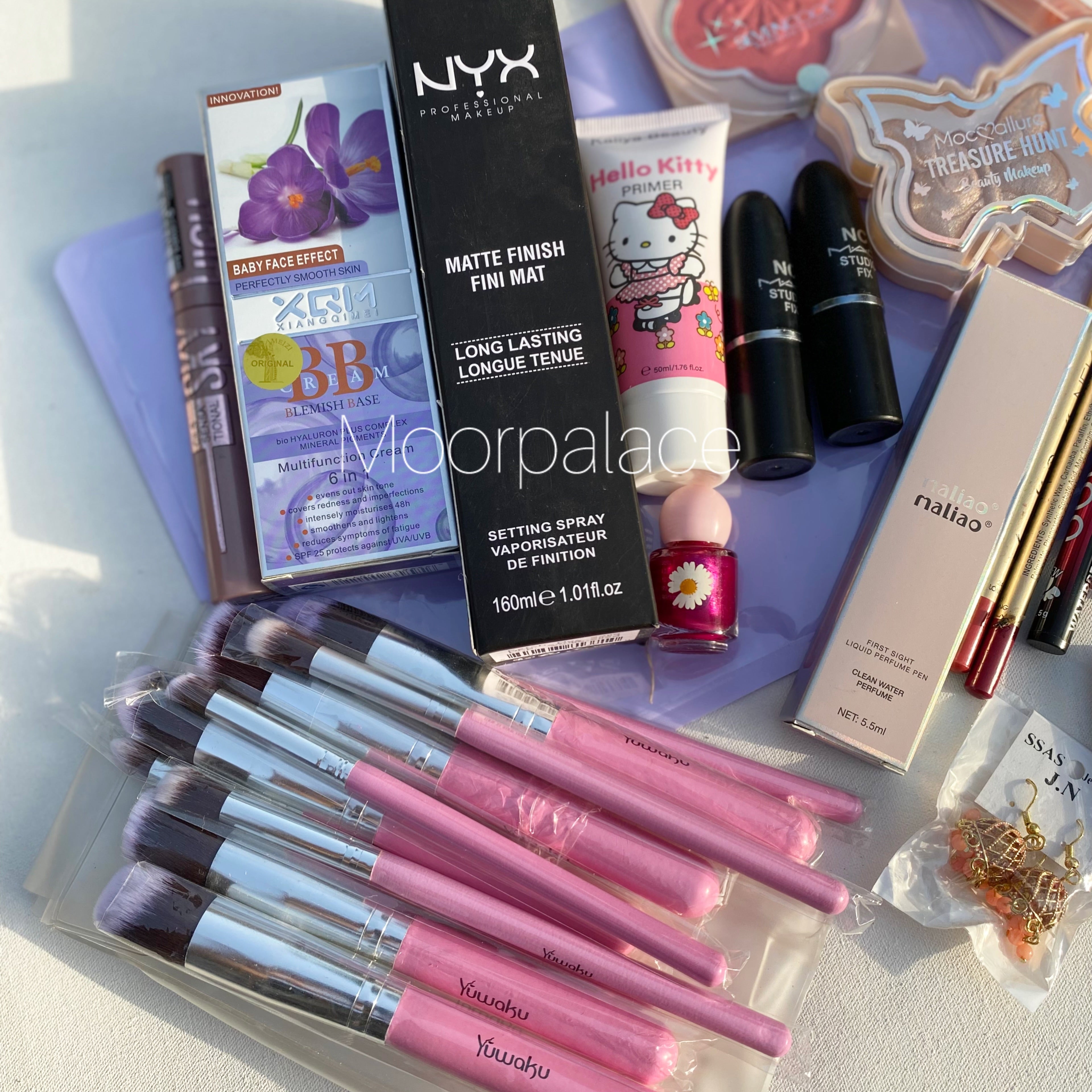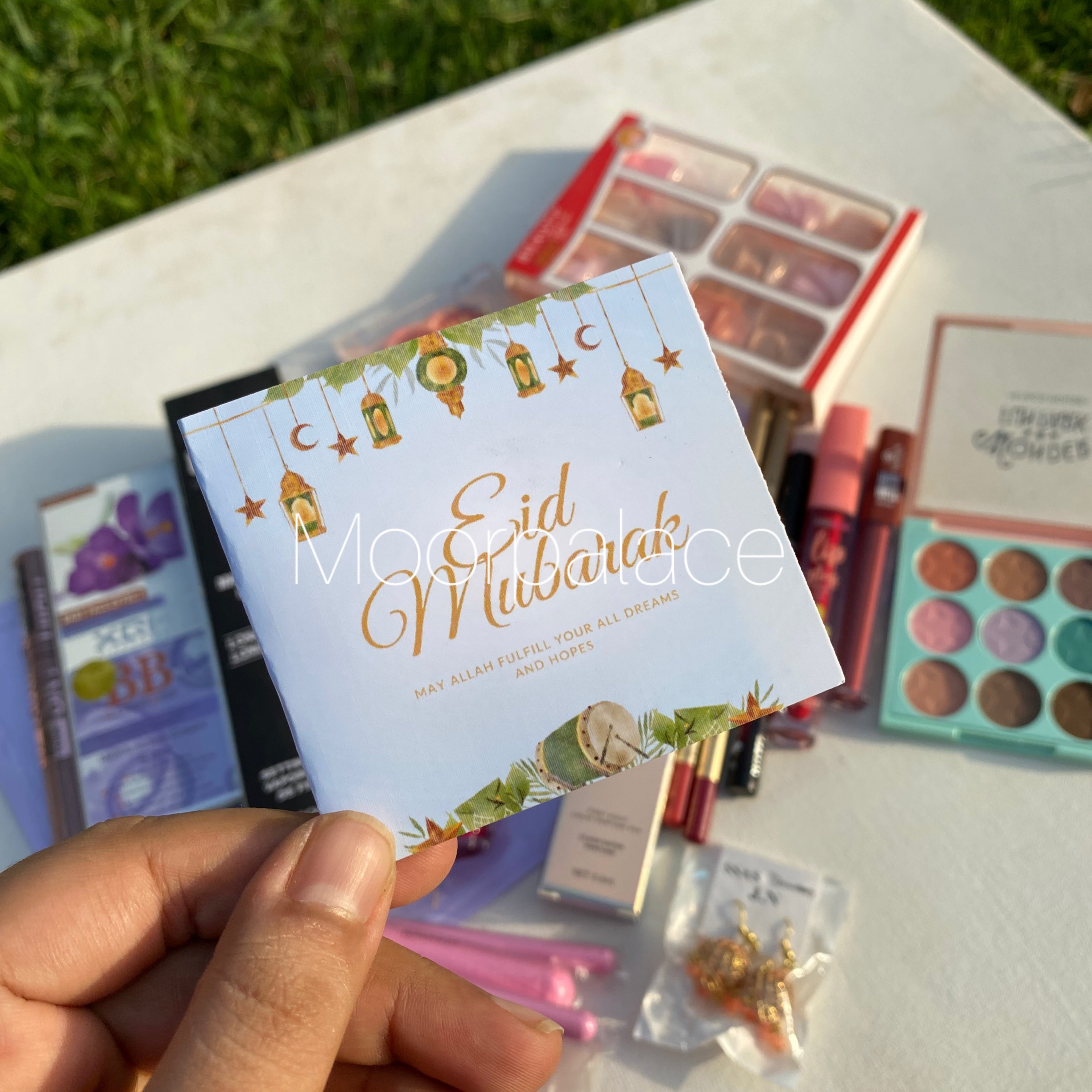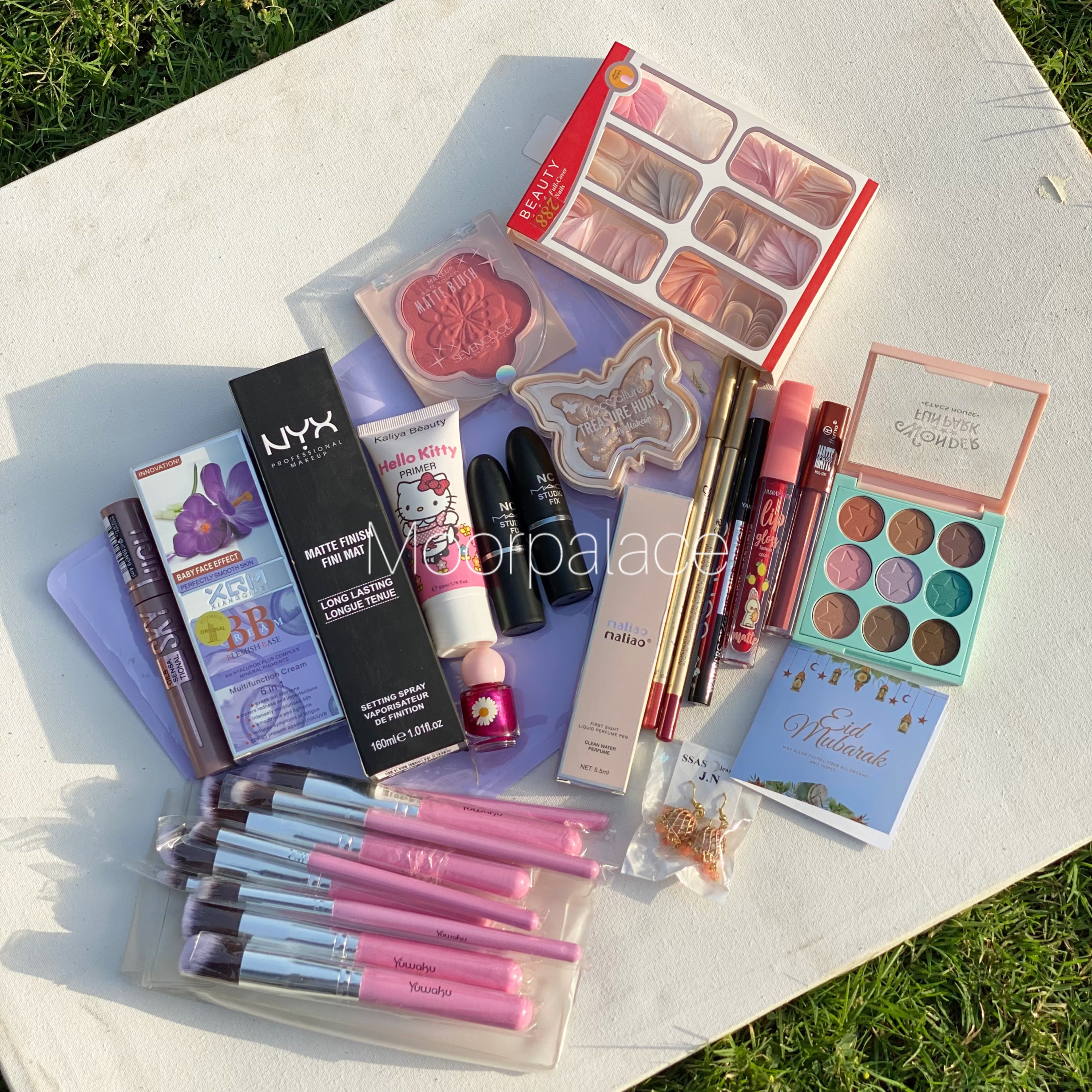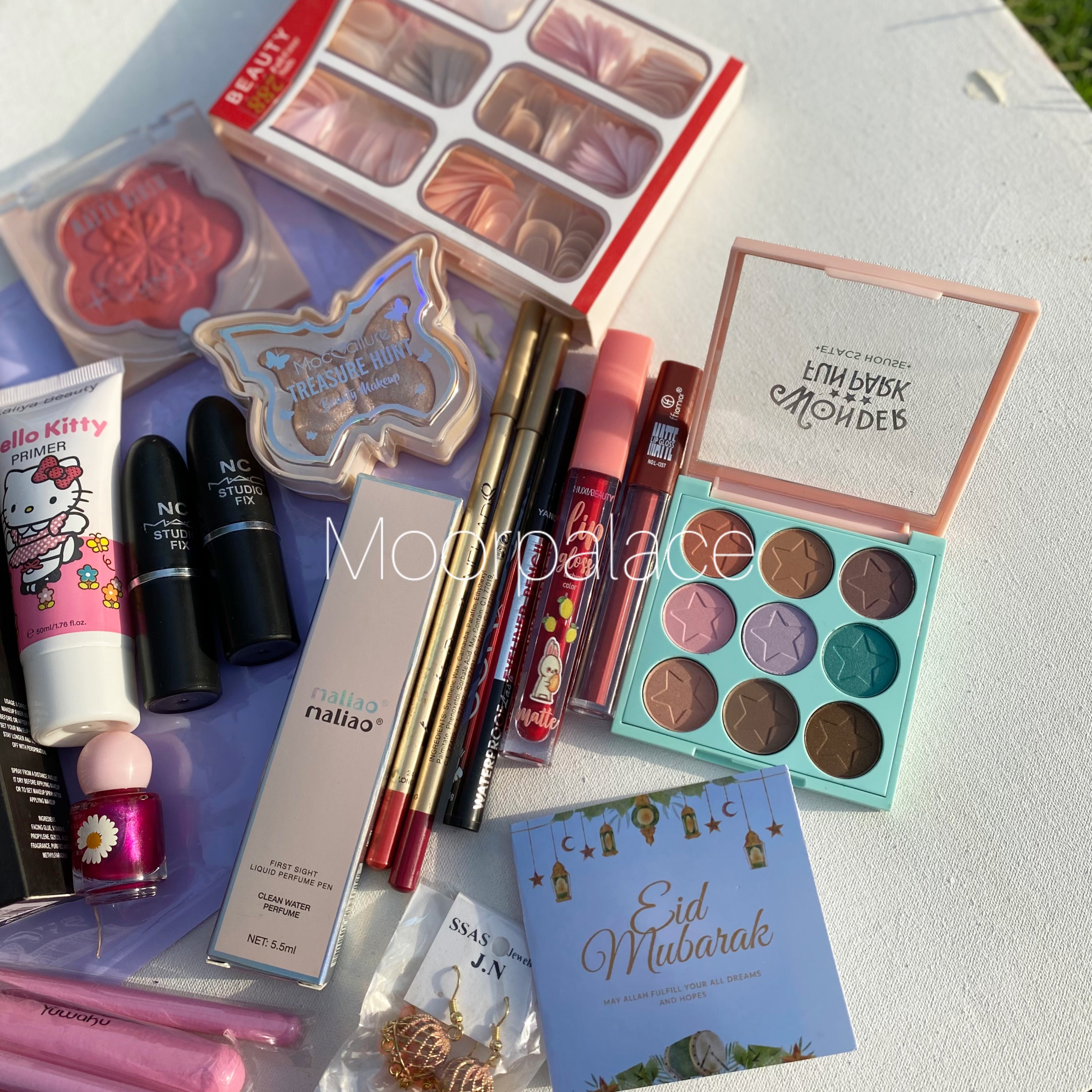 This deal includes full face brushes, French nail box, primer, foundation, fixer, eyeshadow pallete, blush, highlighter, lipsticks, matte glosses, lip liners, pen perfume, eyeliner, mascara and eid special gift.