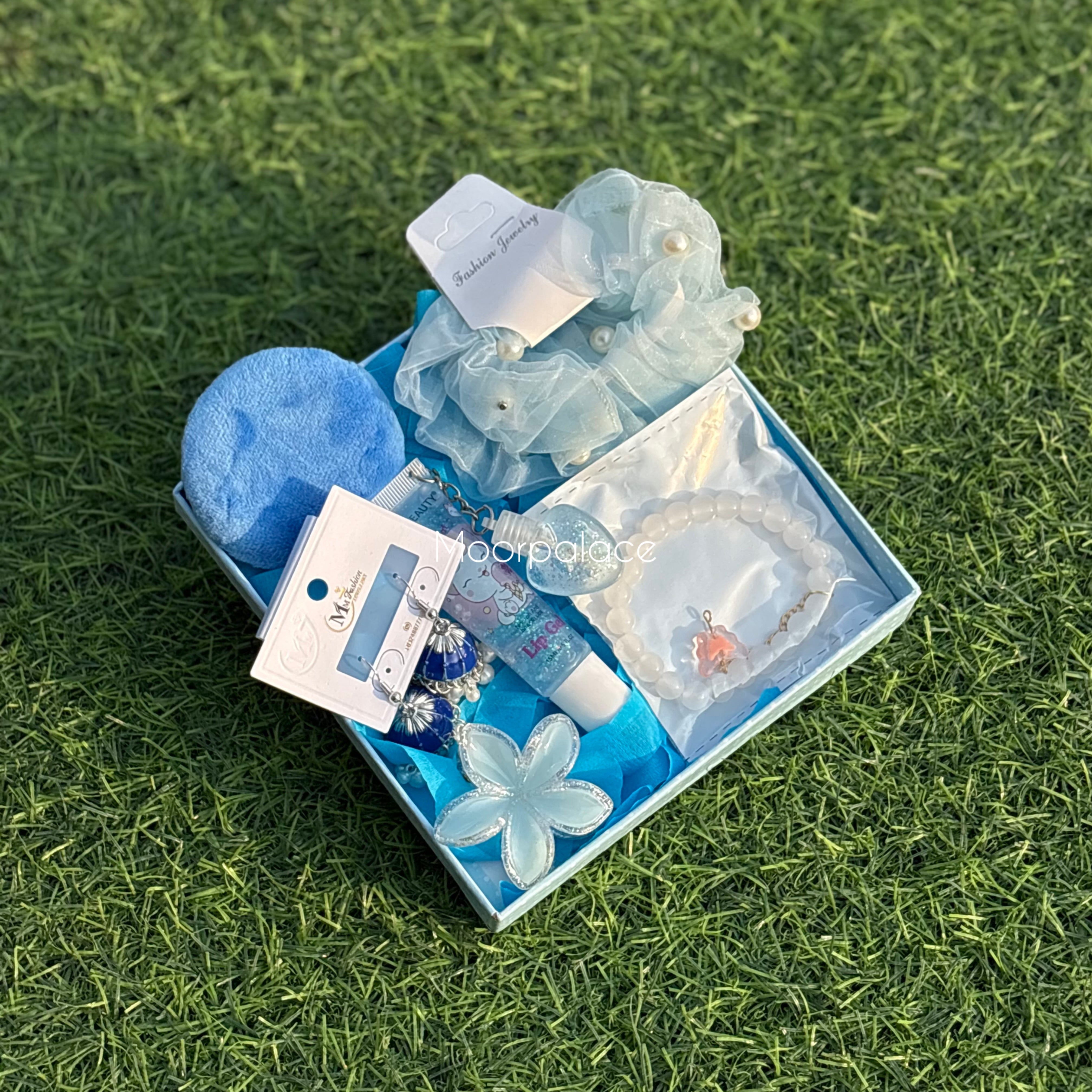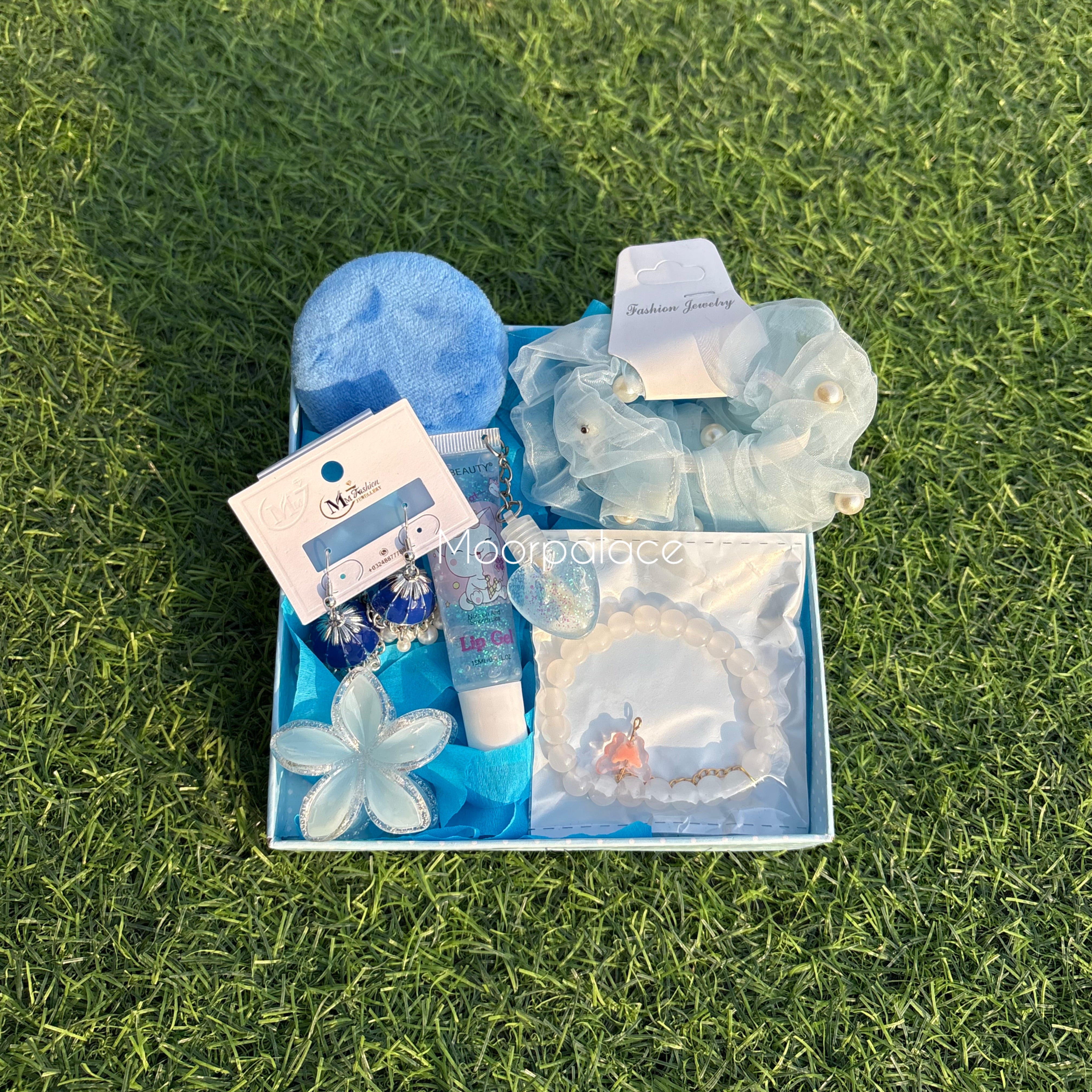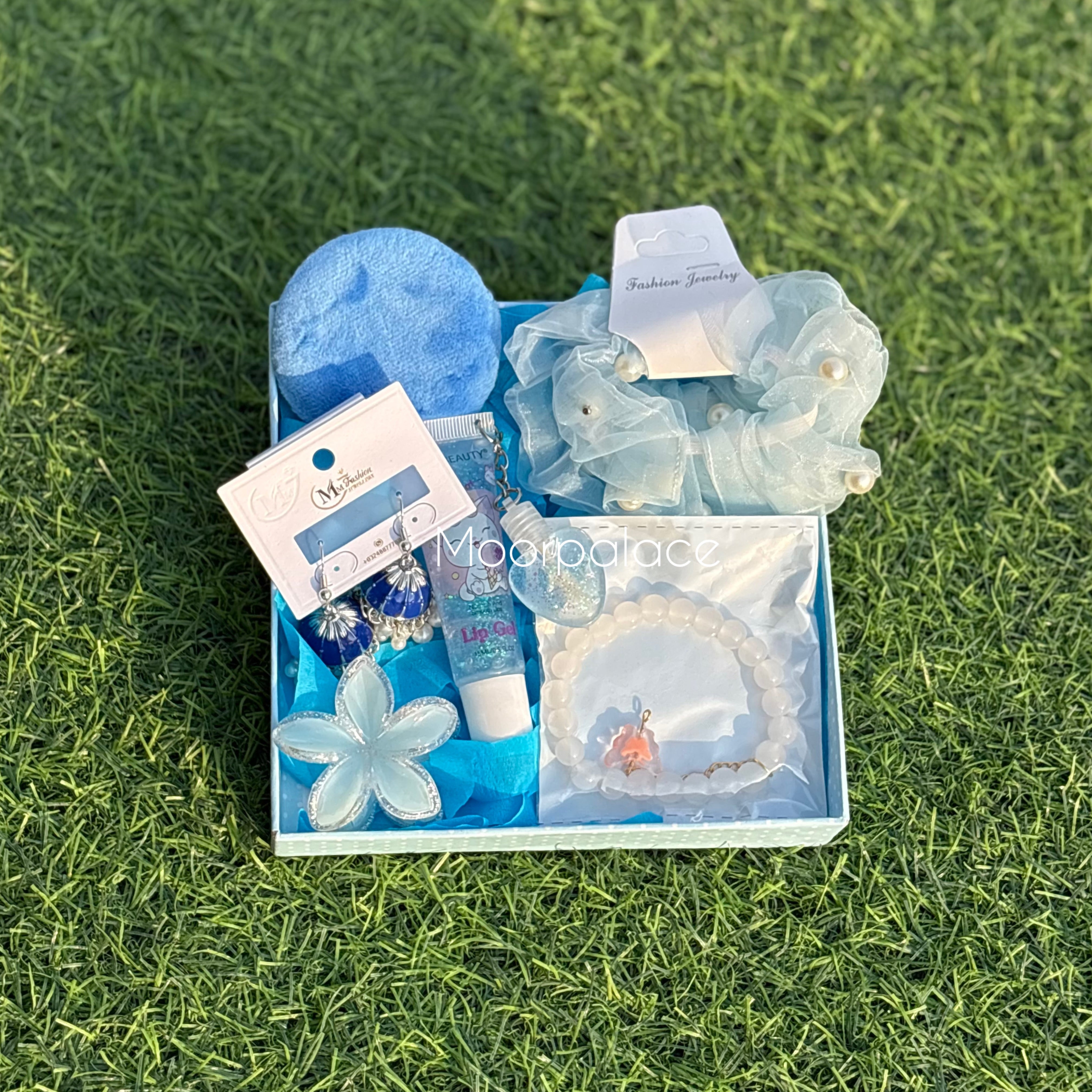This bundle of essentials is perfect for any glamour enthusiast. Included in the Glam Box are a face puff, scrunchie, jhumki earrings, lip gloss, hair catcher, and bracelet. All beautifully packaged and ready to elevate your glam game.