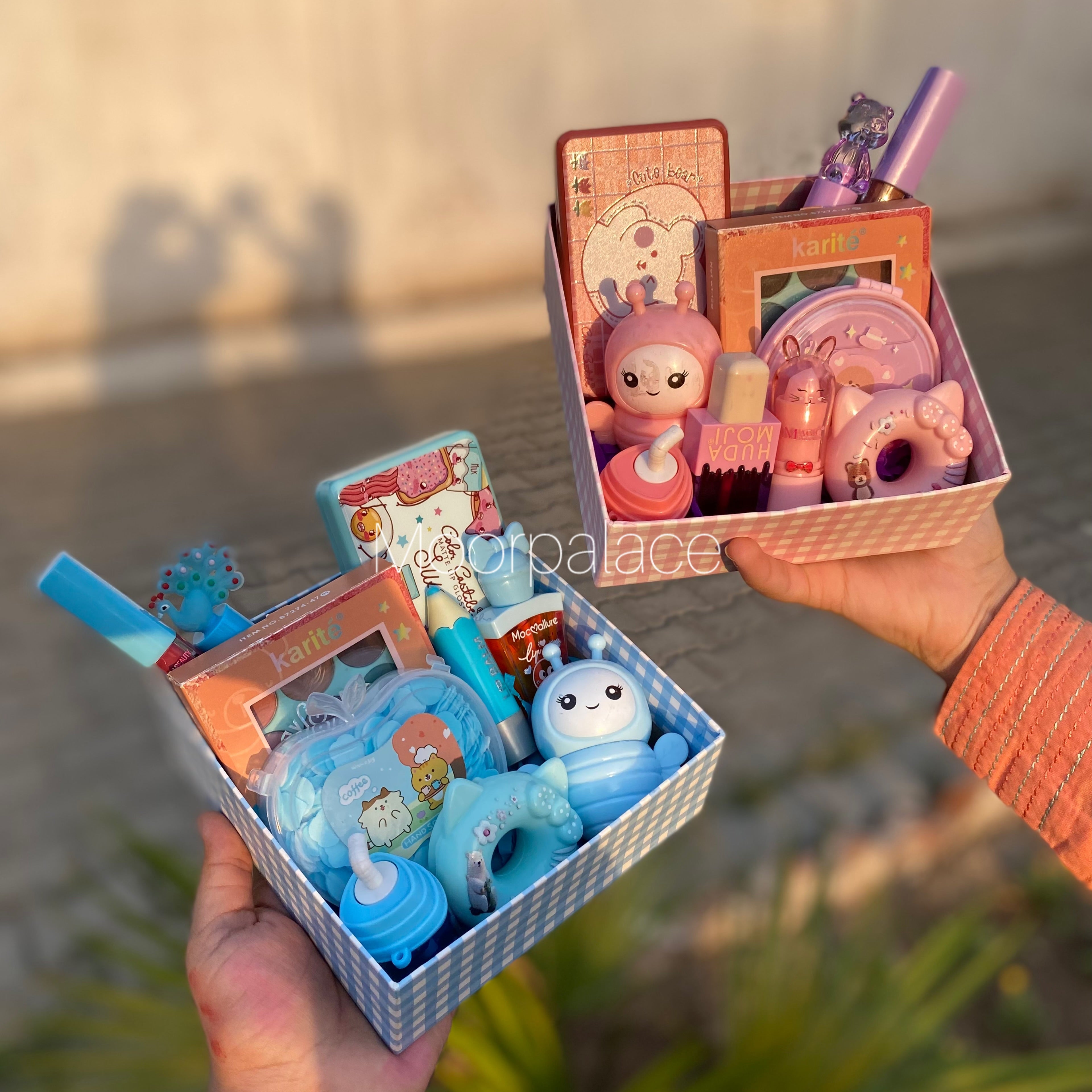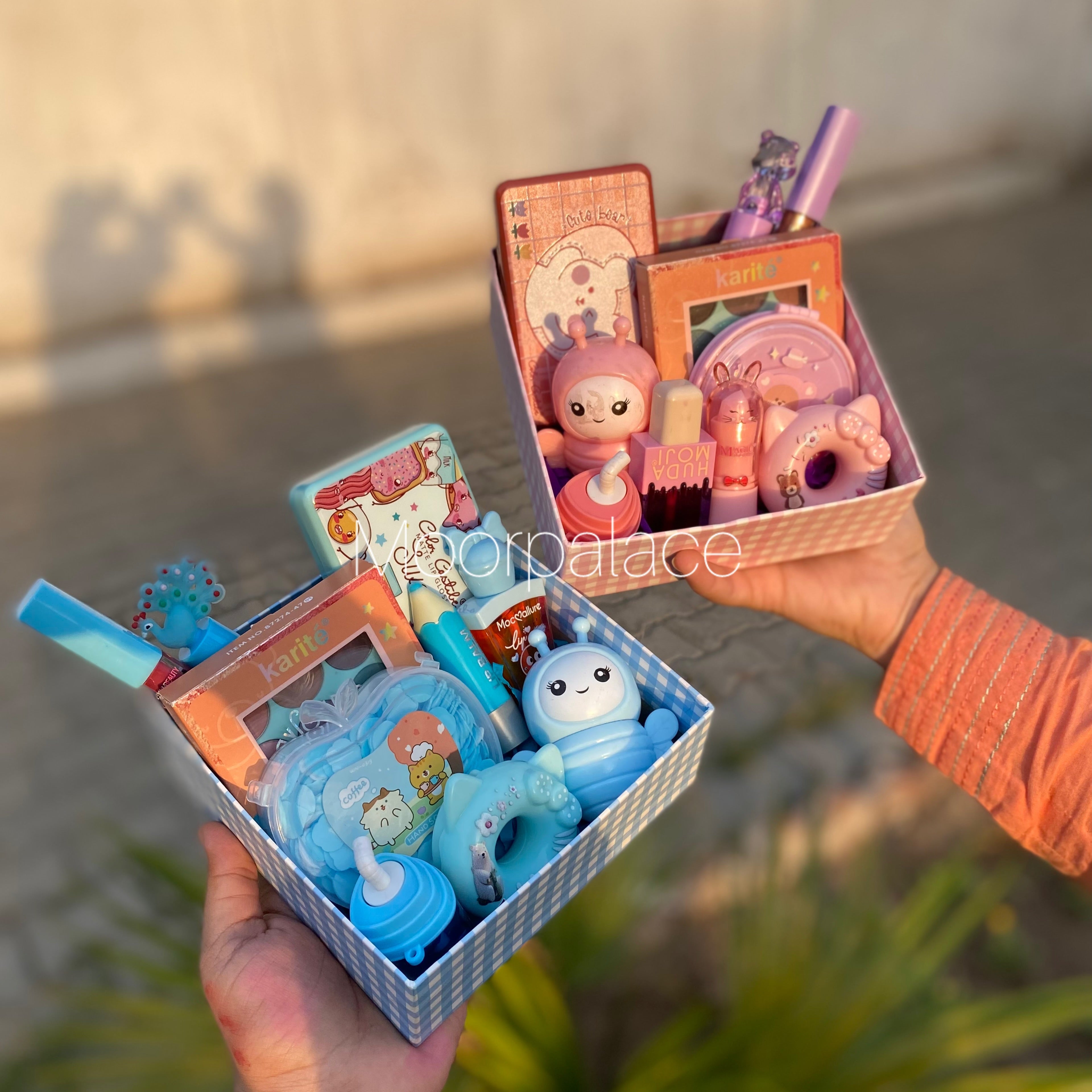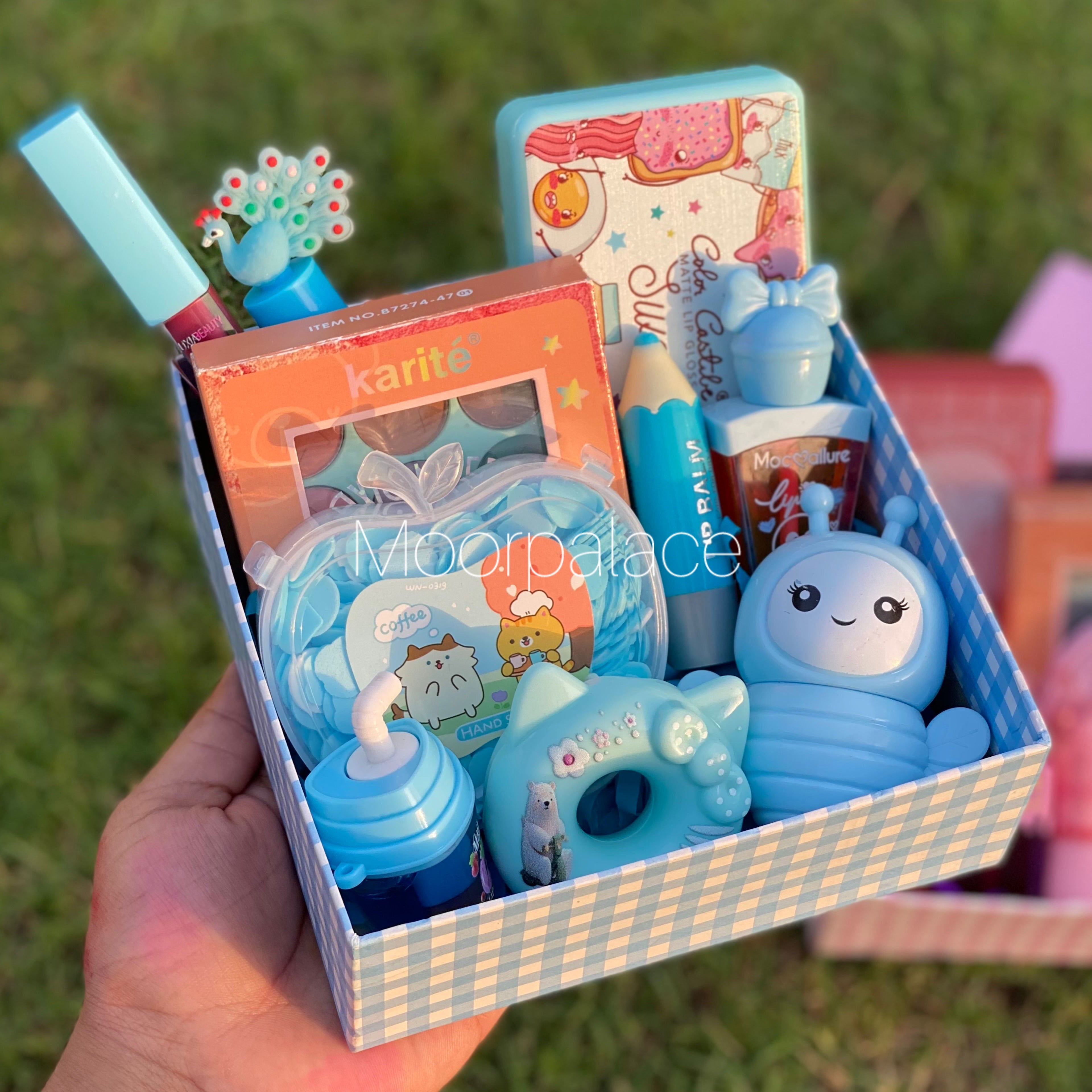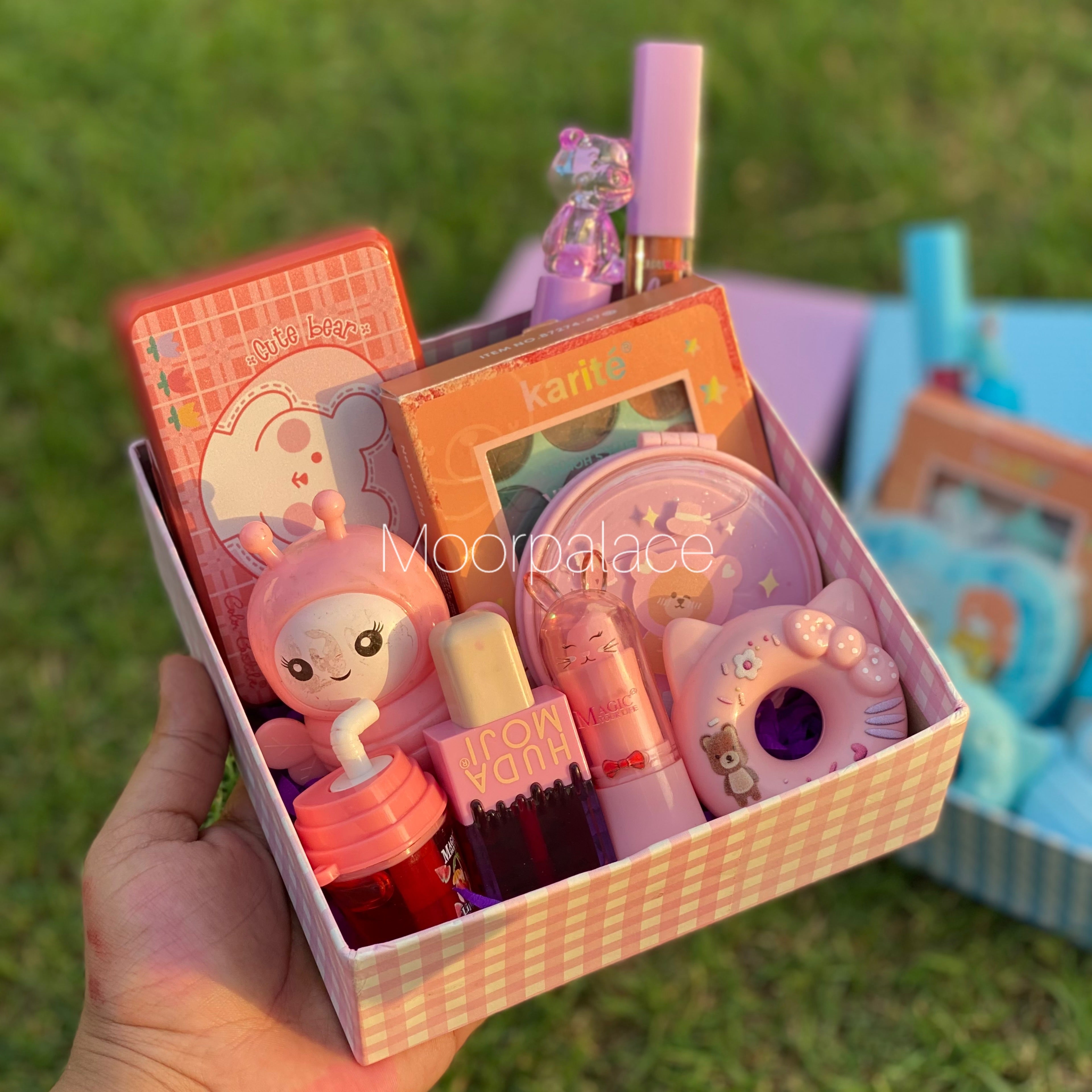 Make someone feel special with our amazing box. It has set of 6 glosses, cute balms, transparent and tinted gloss, eyeshadow pallete, handsoap or mirror , lip and cheek tint and a single matte gloss.