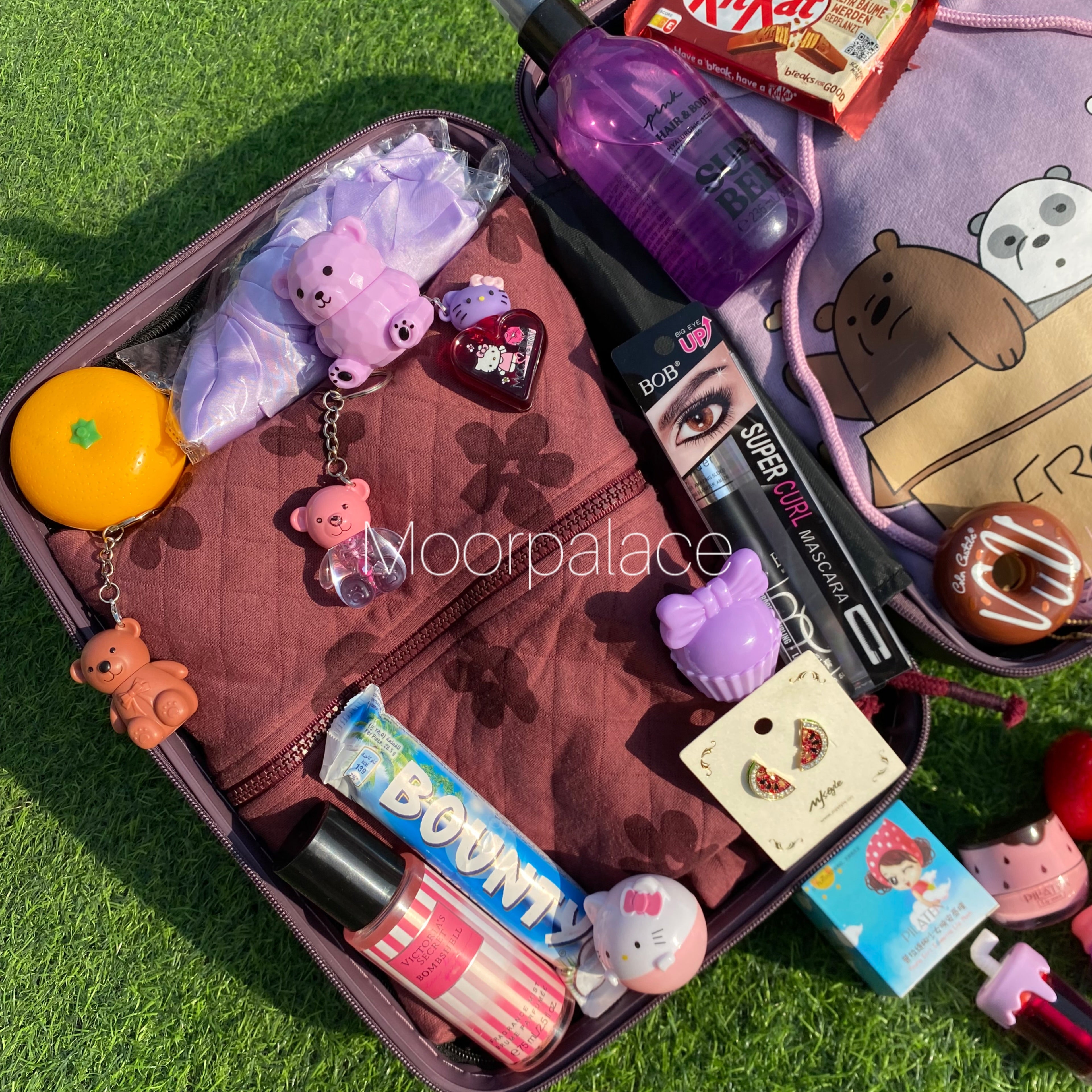 This amazing deal includes a small size suitcase (perfect for your short trips), one set of hoodie and trouser, one single hoodie, 3 glossy gloss, 6 cute shape balms, one orange shape hand cream, 2 tint, honey lip mask, mist, bow clip, berry lip mask, liquid blush, matte gloss, ear studs, mascara and 2 chocolates.