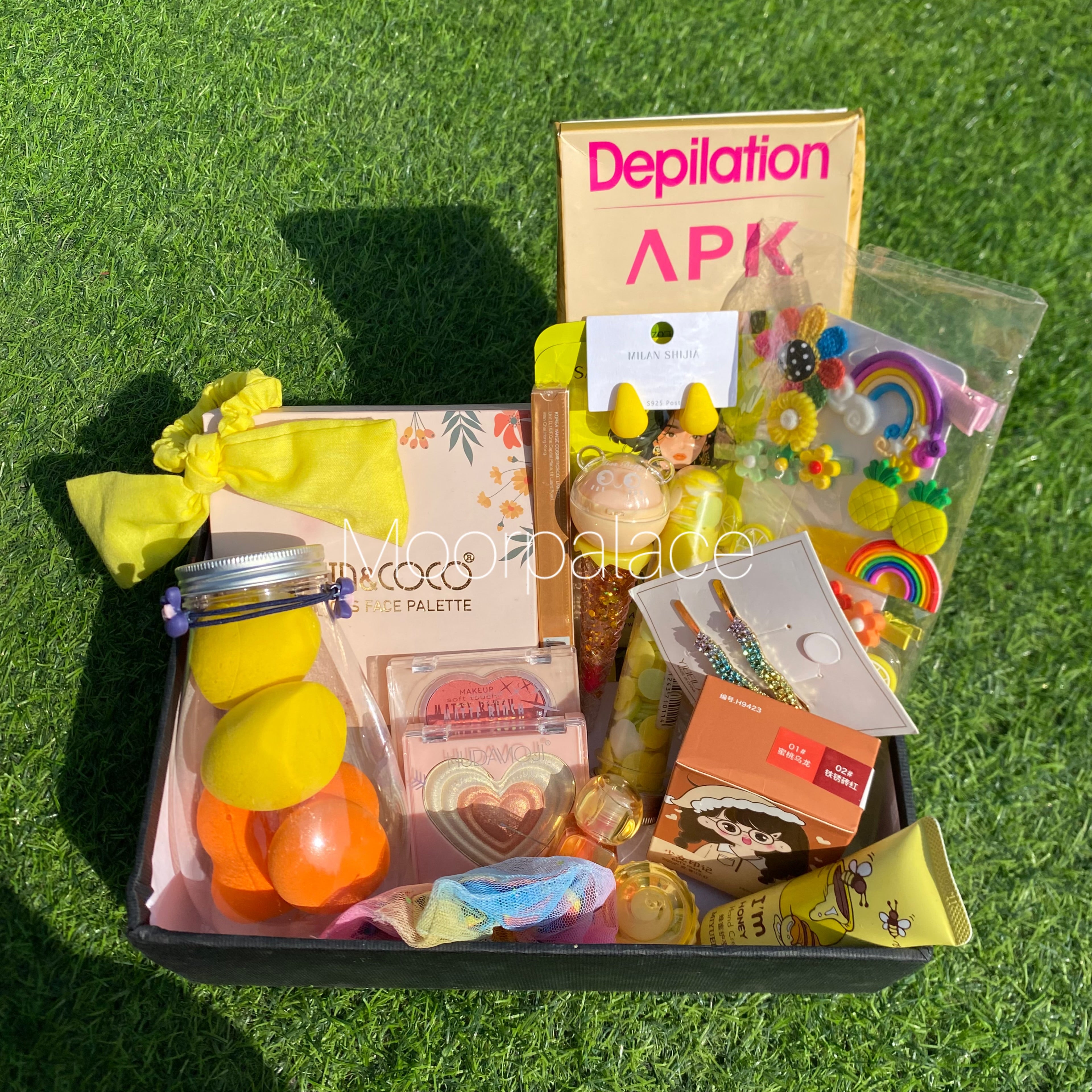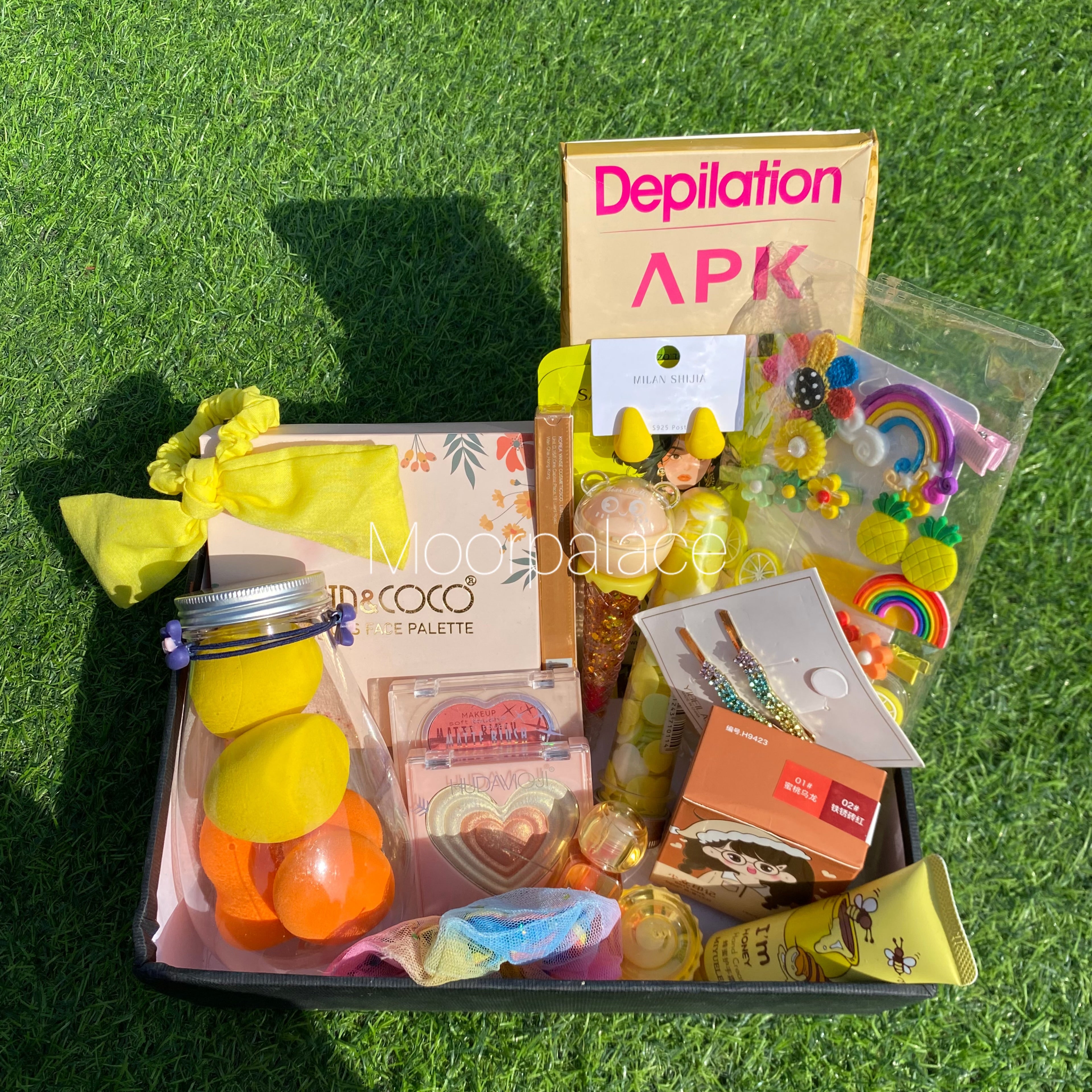 Deal includes All in one makeup pallete, air pod lipsticks, zaqoon hair clips, Korean hair clips, maliao golden liner, blender box, blush, 2 in 1 highlighter, tinted gloss, 2 in 1 gloss and lip balm, scrunchies, hand soap, wax strips, hand cream, cup cake lip balm and ear studs.