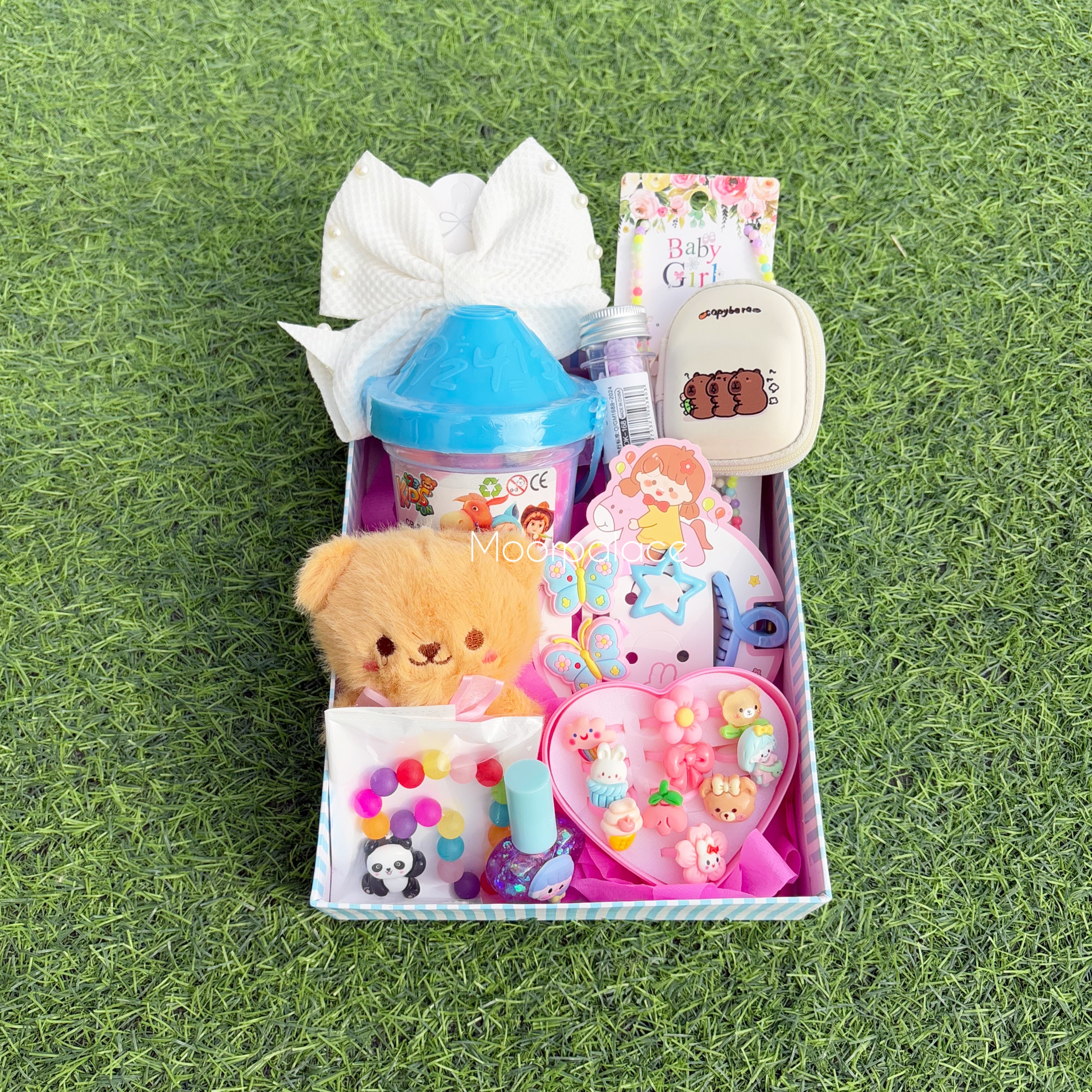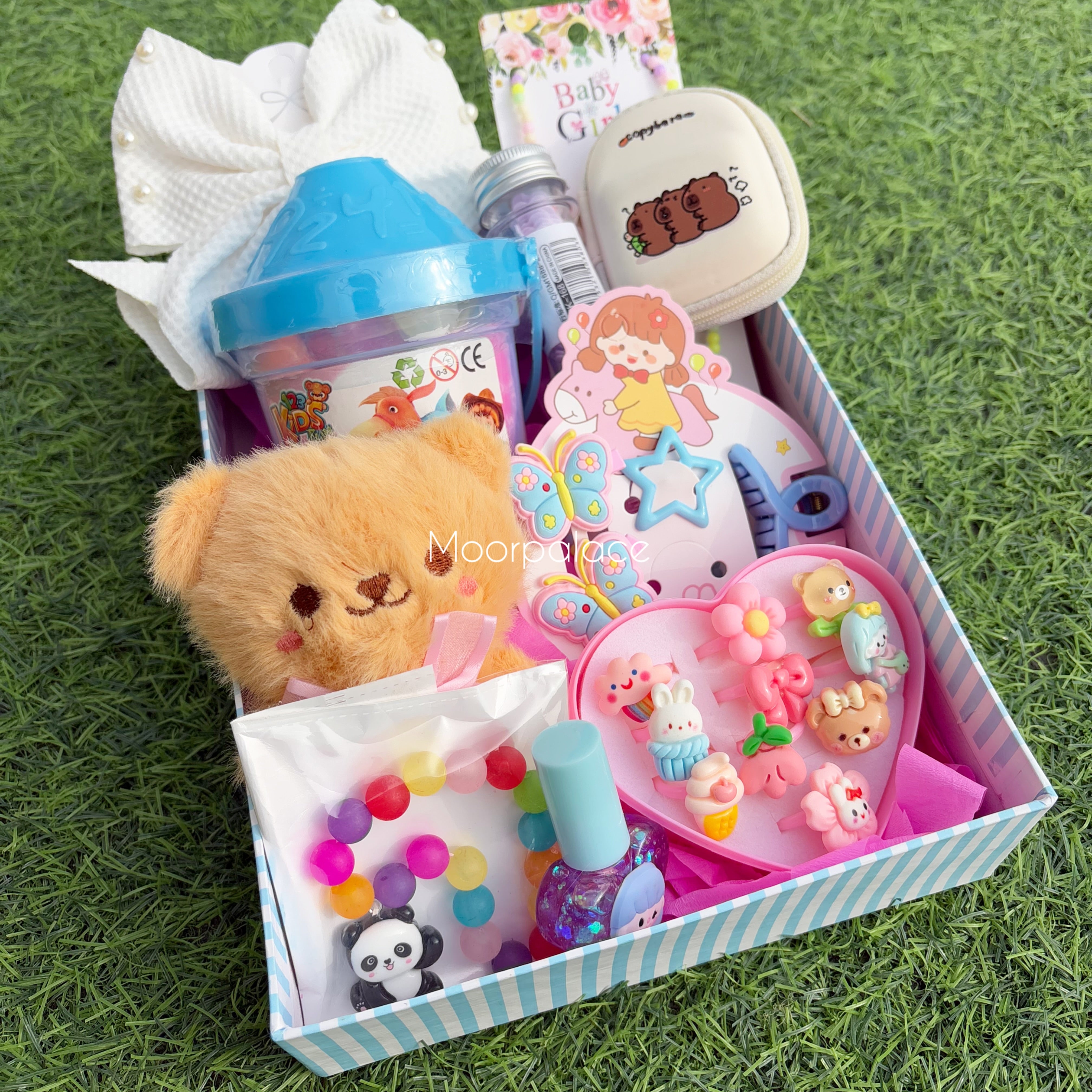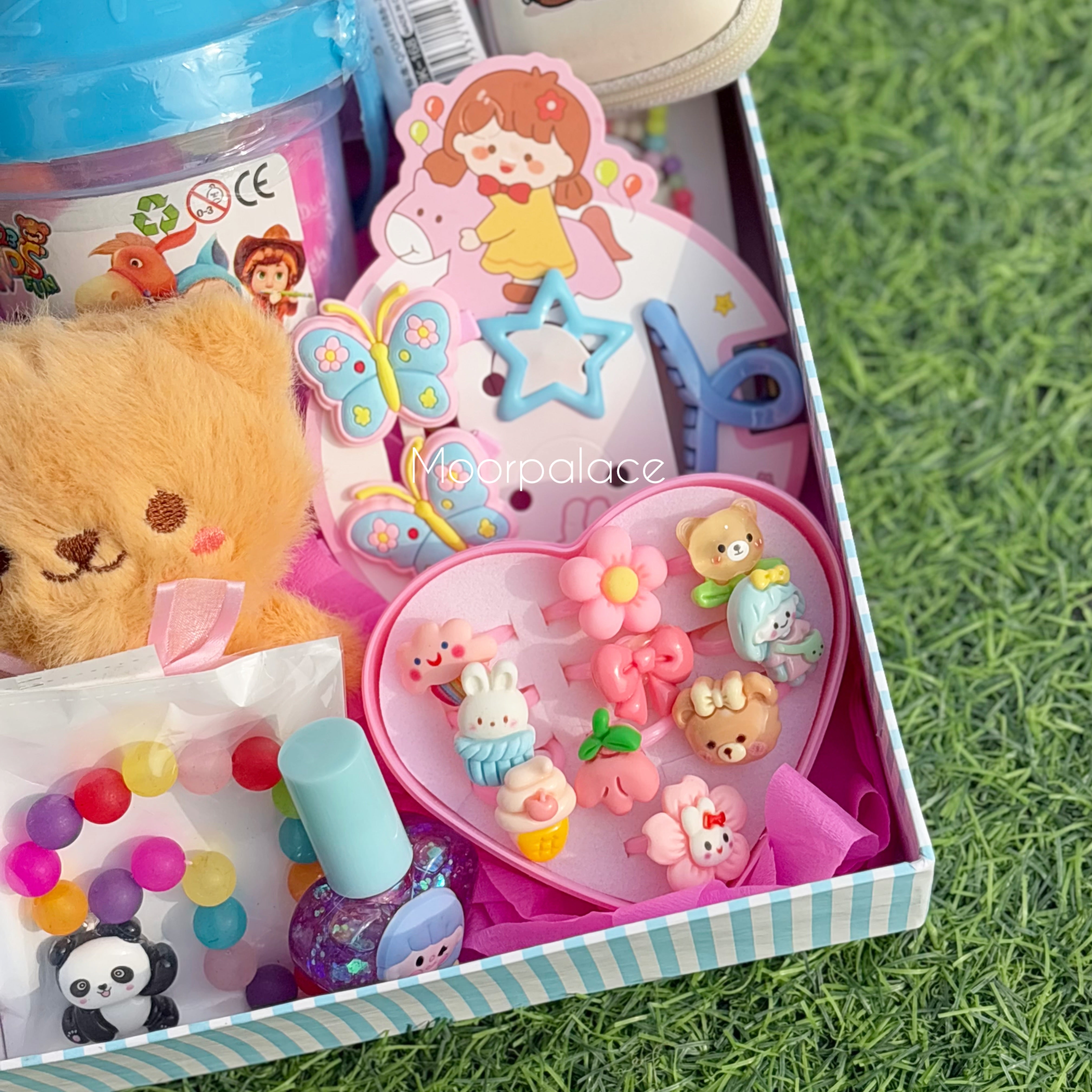 It includes hair accessories, tinted gloss, play dough, coin pouch, teddy keychain, paper soap, cute bracelet and locket, ring box, bracelet along with the box.