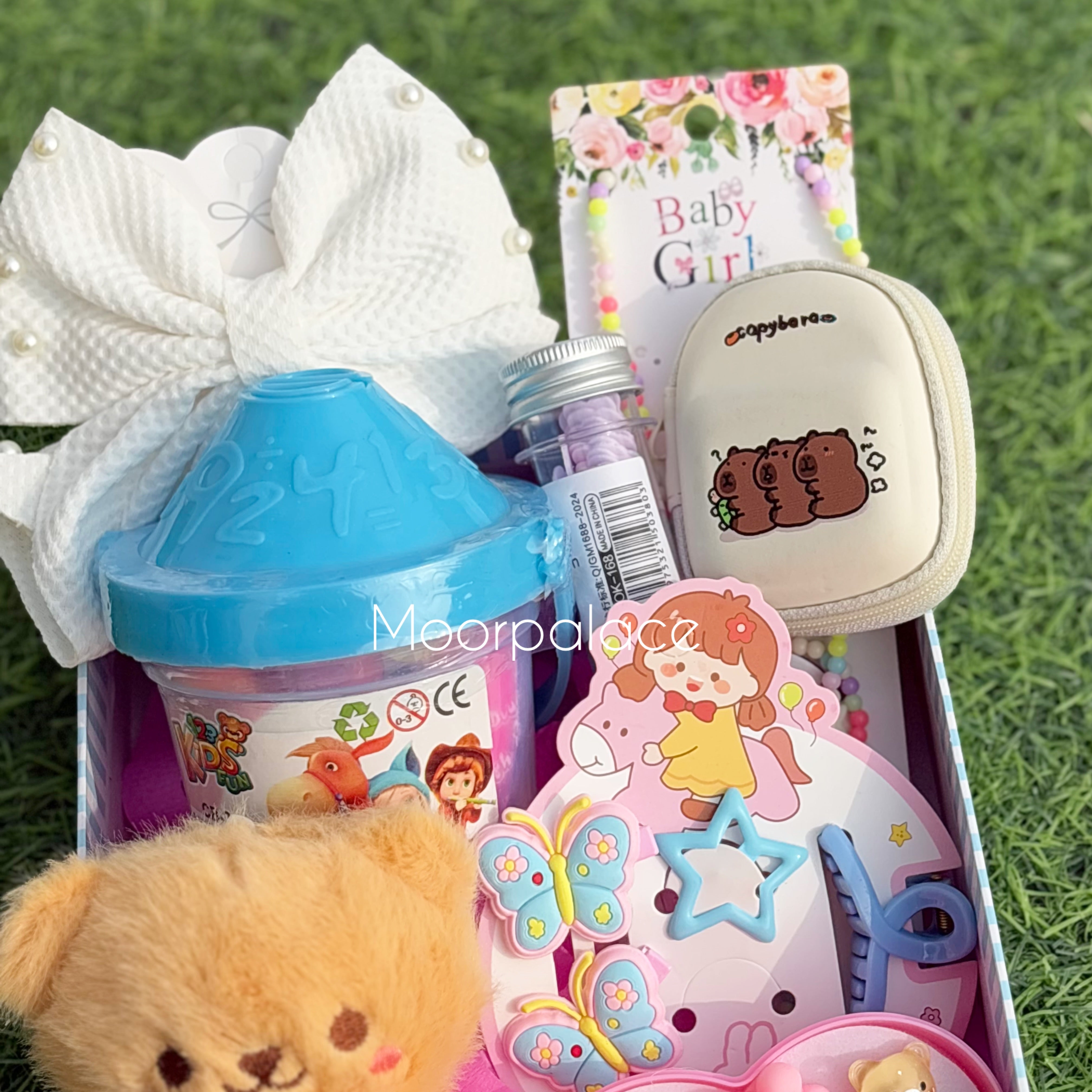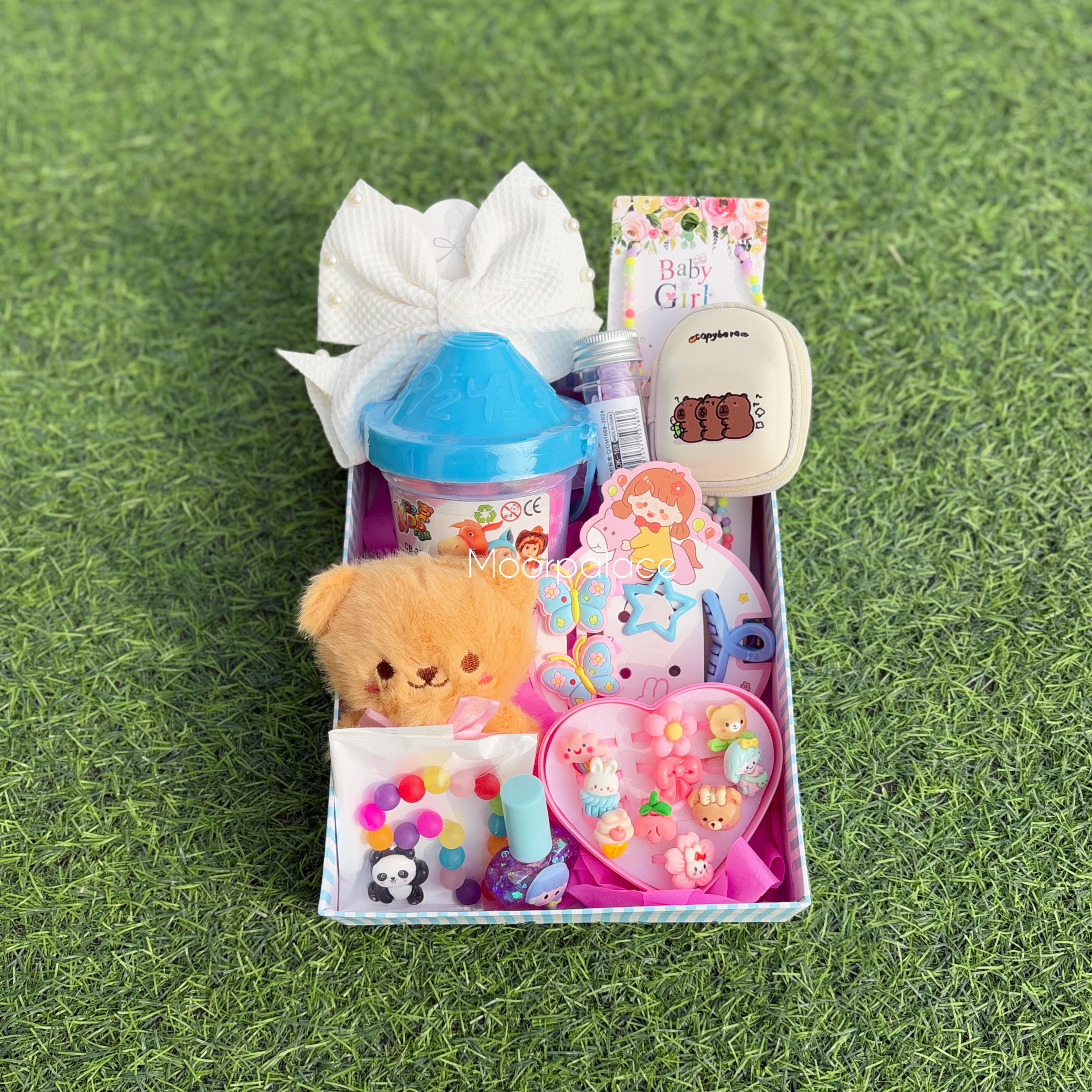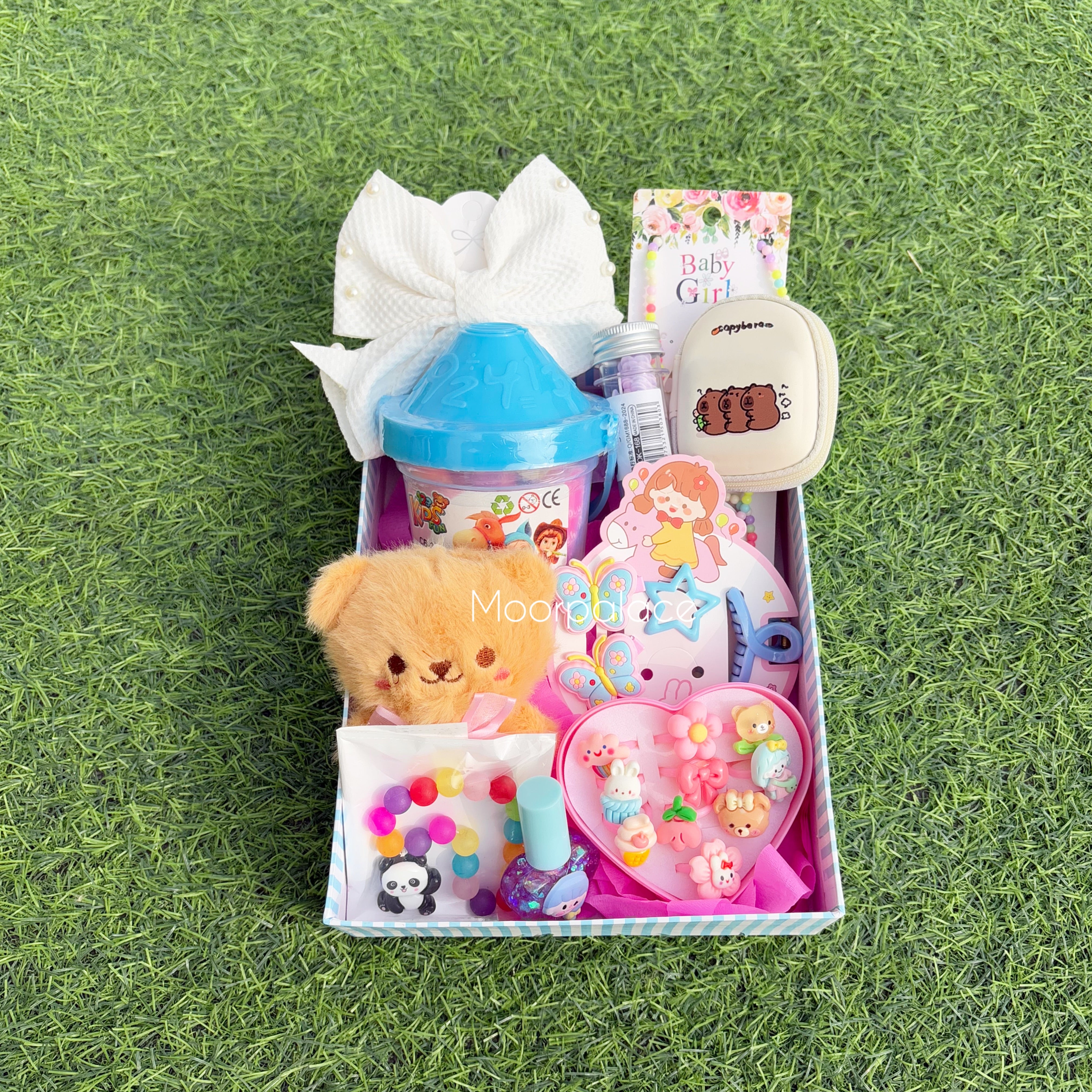 It includes hair accessories, tinted gloss, play dough, coin pouch, teddy keychain, paper soap, cute bracelet and locket, ring box, bracelet along with the box.