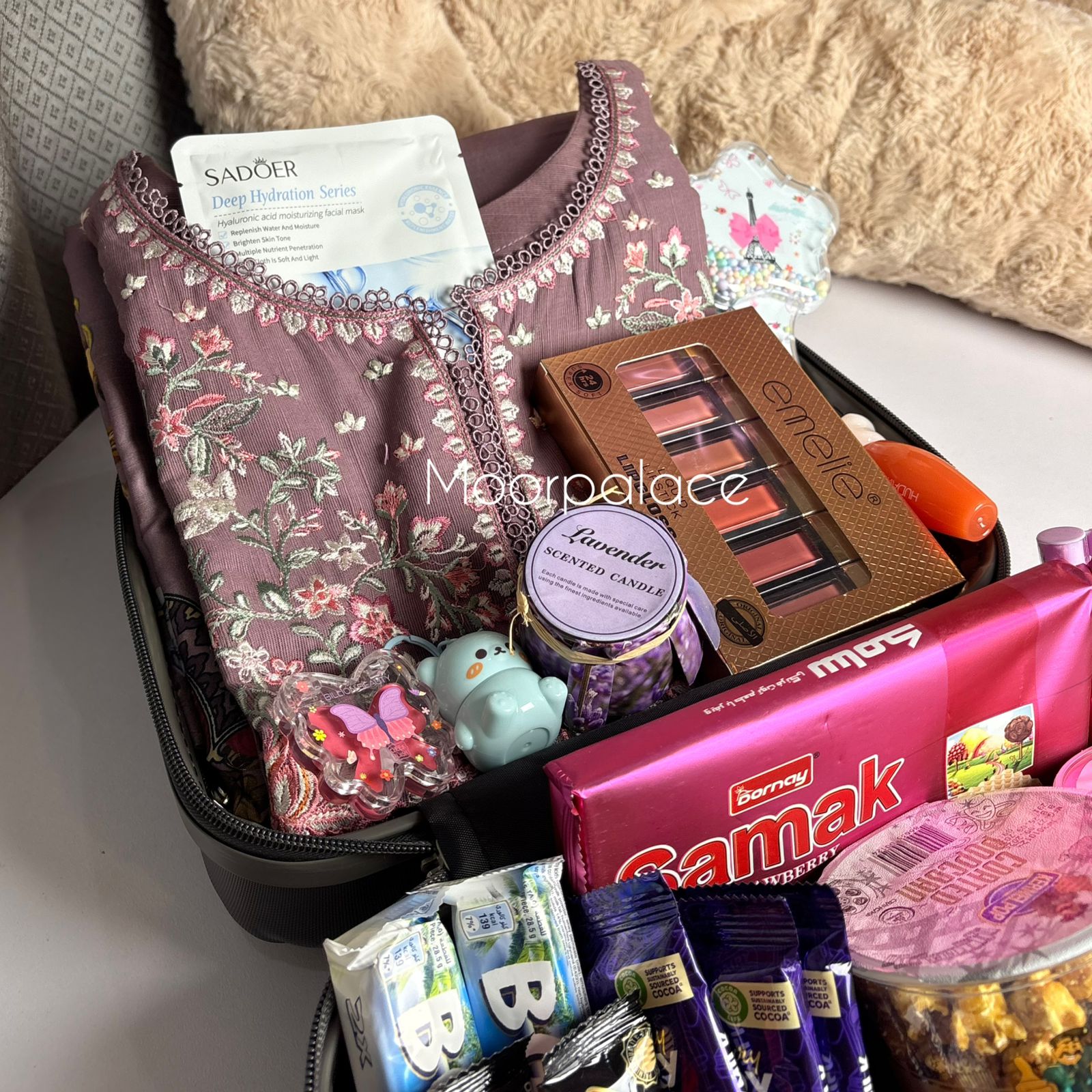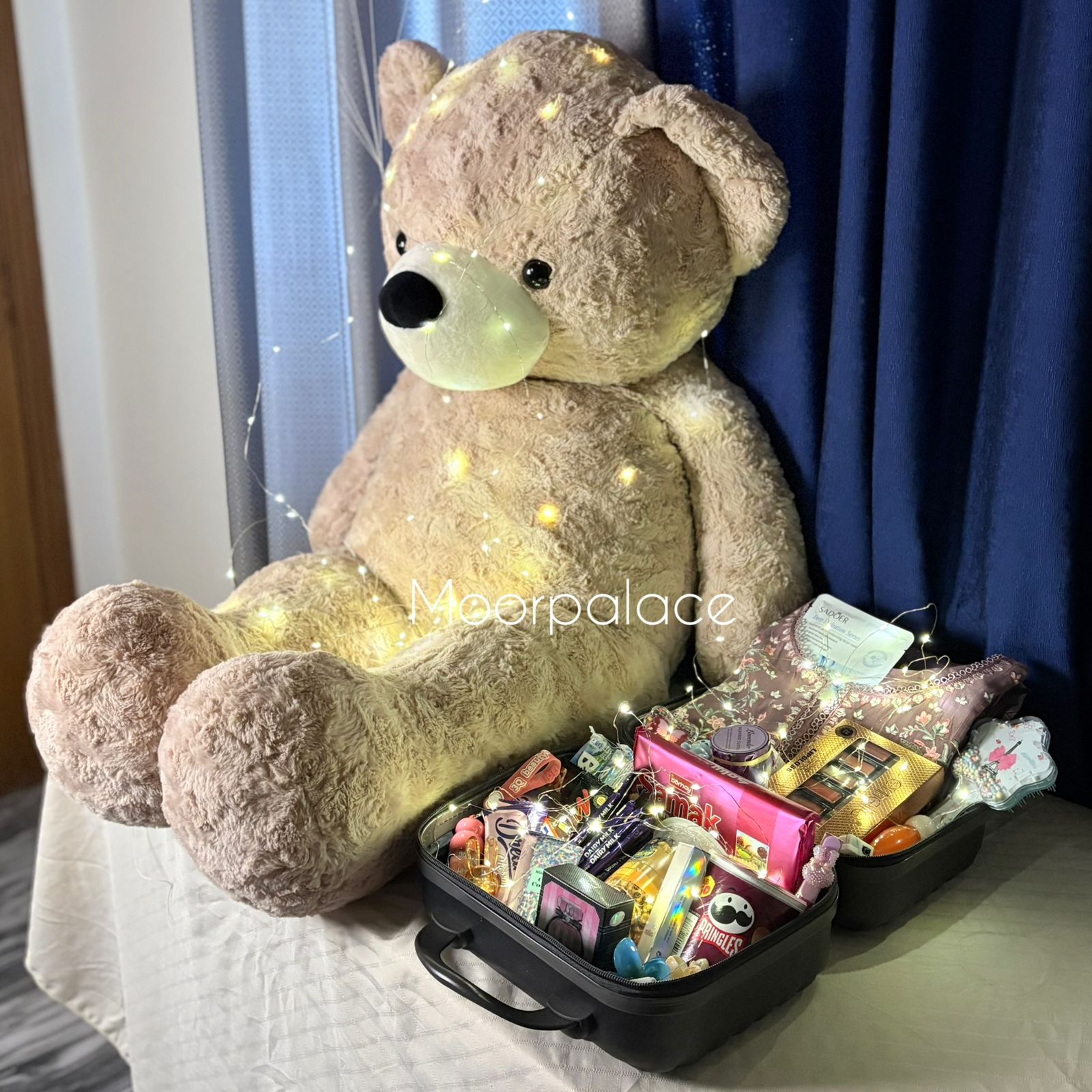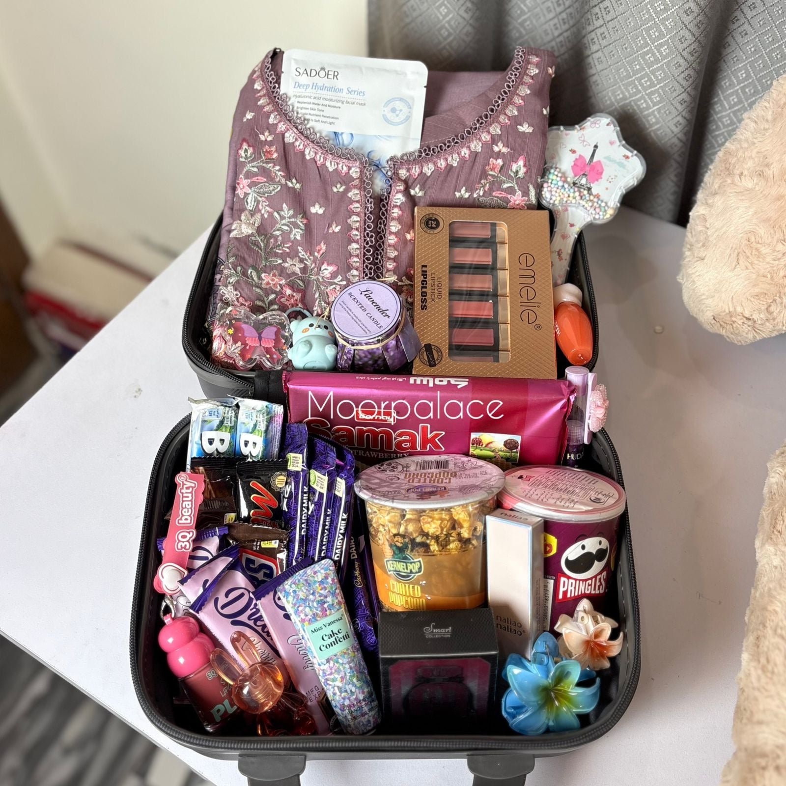 This beautiful hamper has a giant teddy bear, 2 pound cake, 6 balloons, beautiful stitched dress, matte gloss box, tint, pen perfume, gloss, glossy gloss, perfume, balm, blush, hand-cream, wafers, coated popcorn, pringles, mix chocolates packed in a beautiful suitcase.