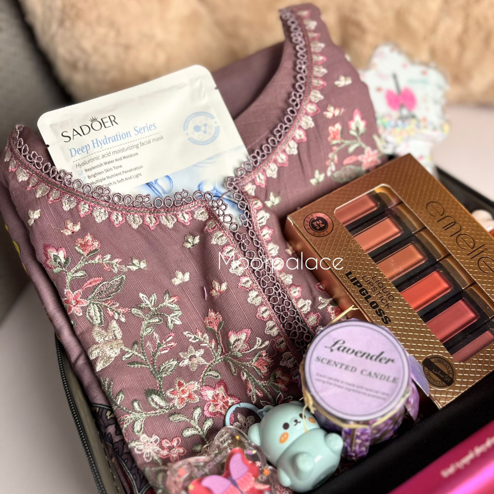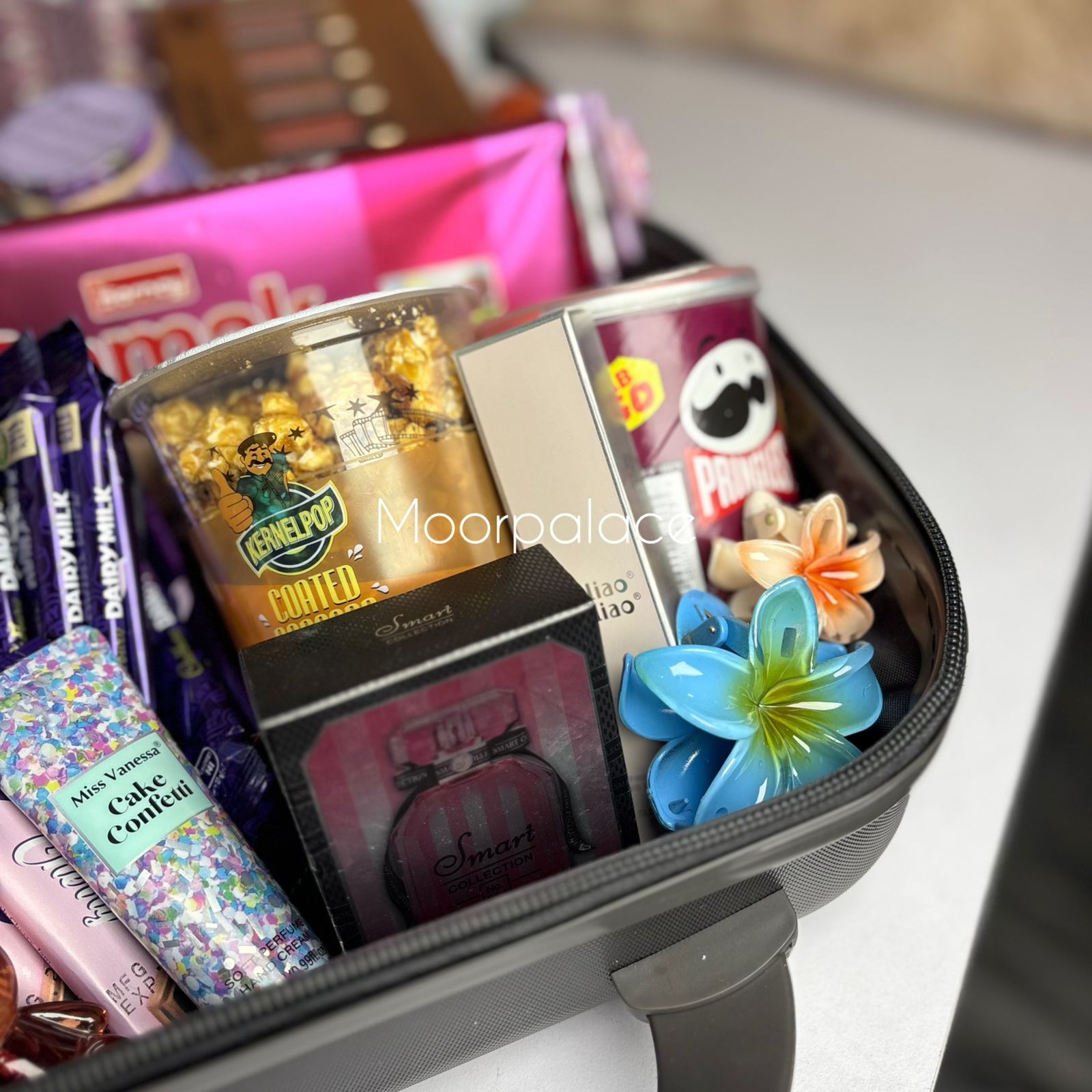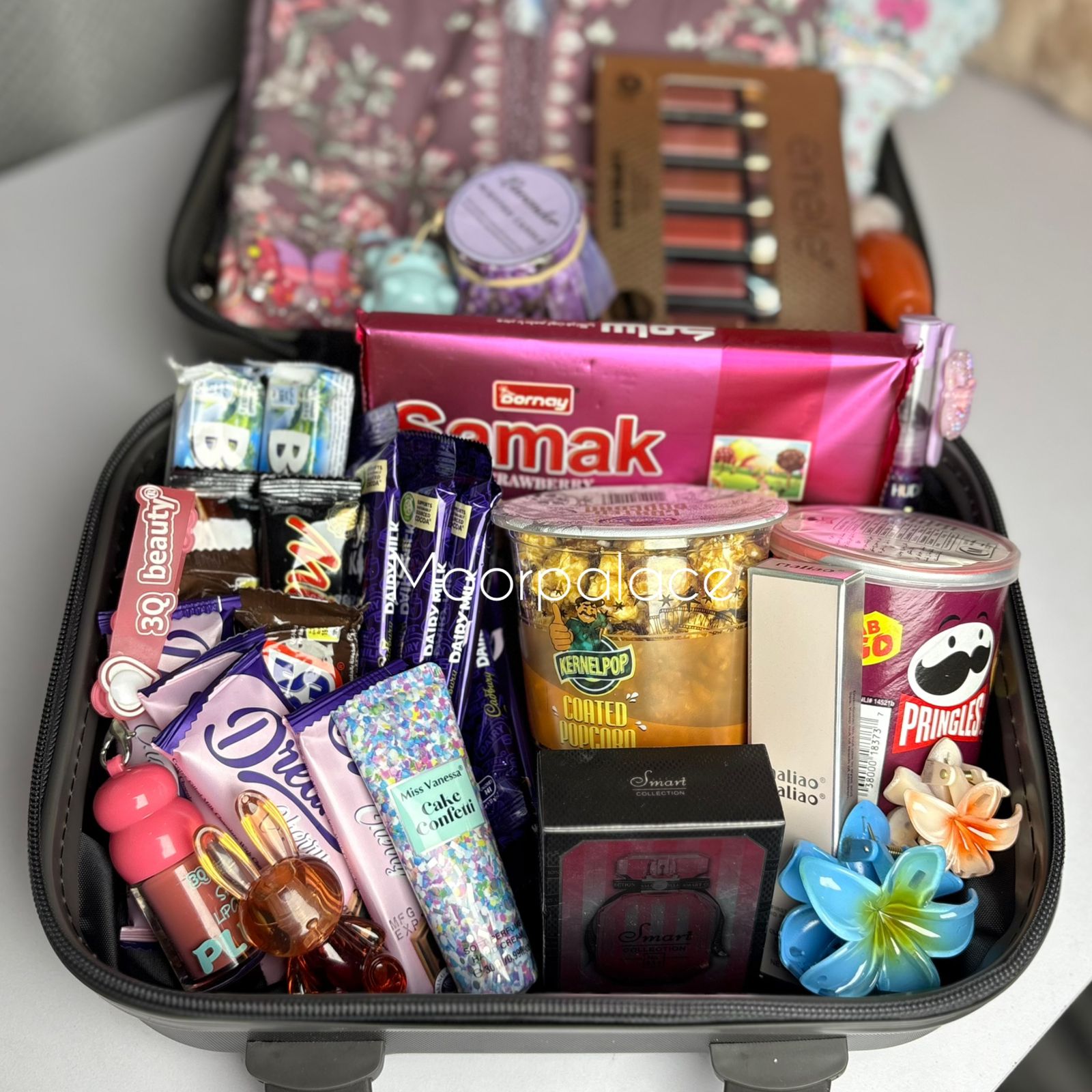 This beautiful hamper has a giant teddy bear, 2 pound cake, 6 balloons, beautiful stitched dress, matte gloss box, tint, pen perfume, gloss, glossy gloss, perfume, balm, blush, hand-cream, wafers, coated popcorn, pringles, mix chocolates packed in a beautiful suitcase.