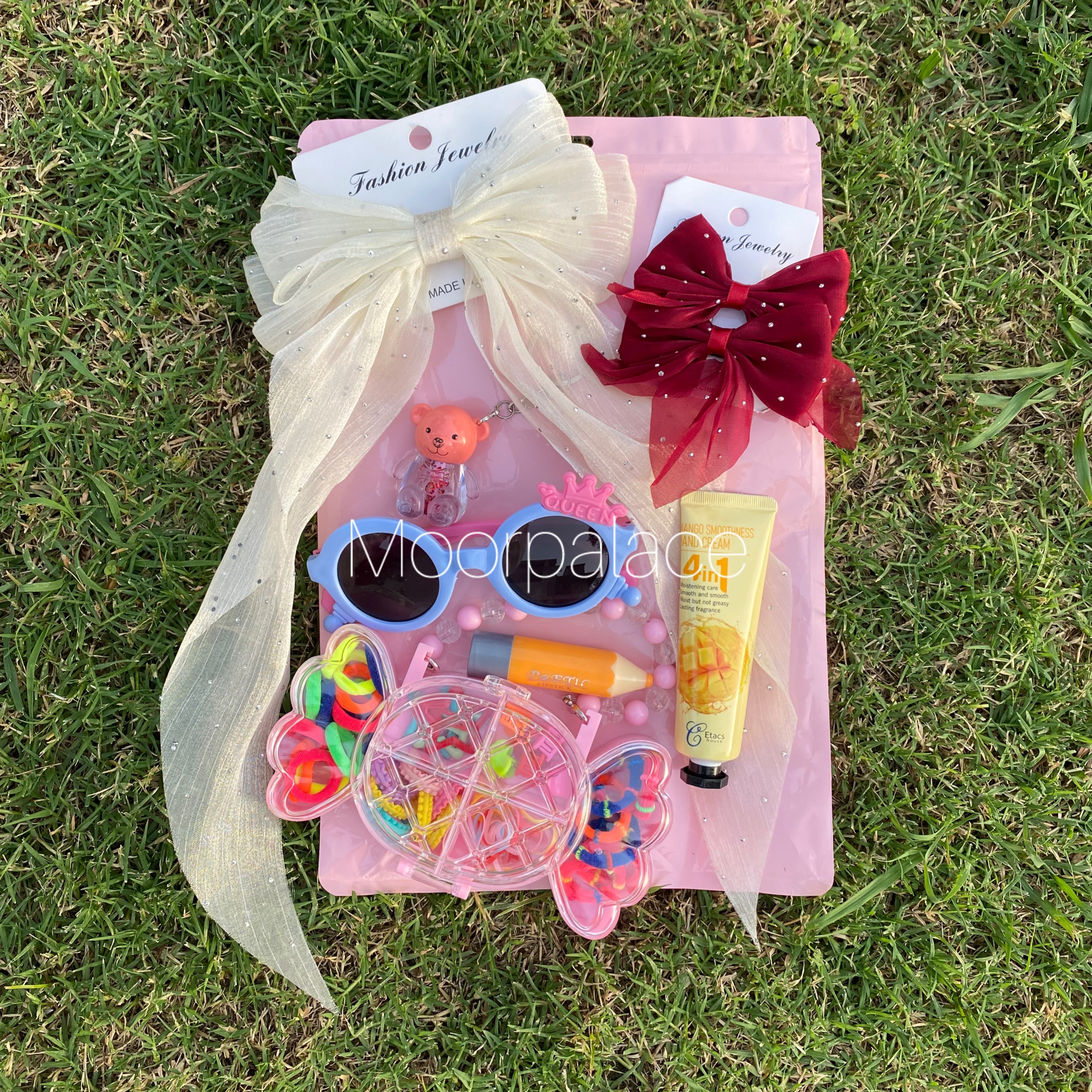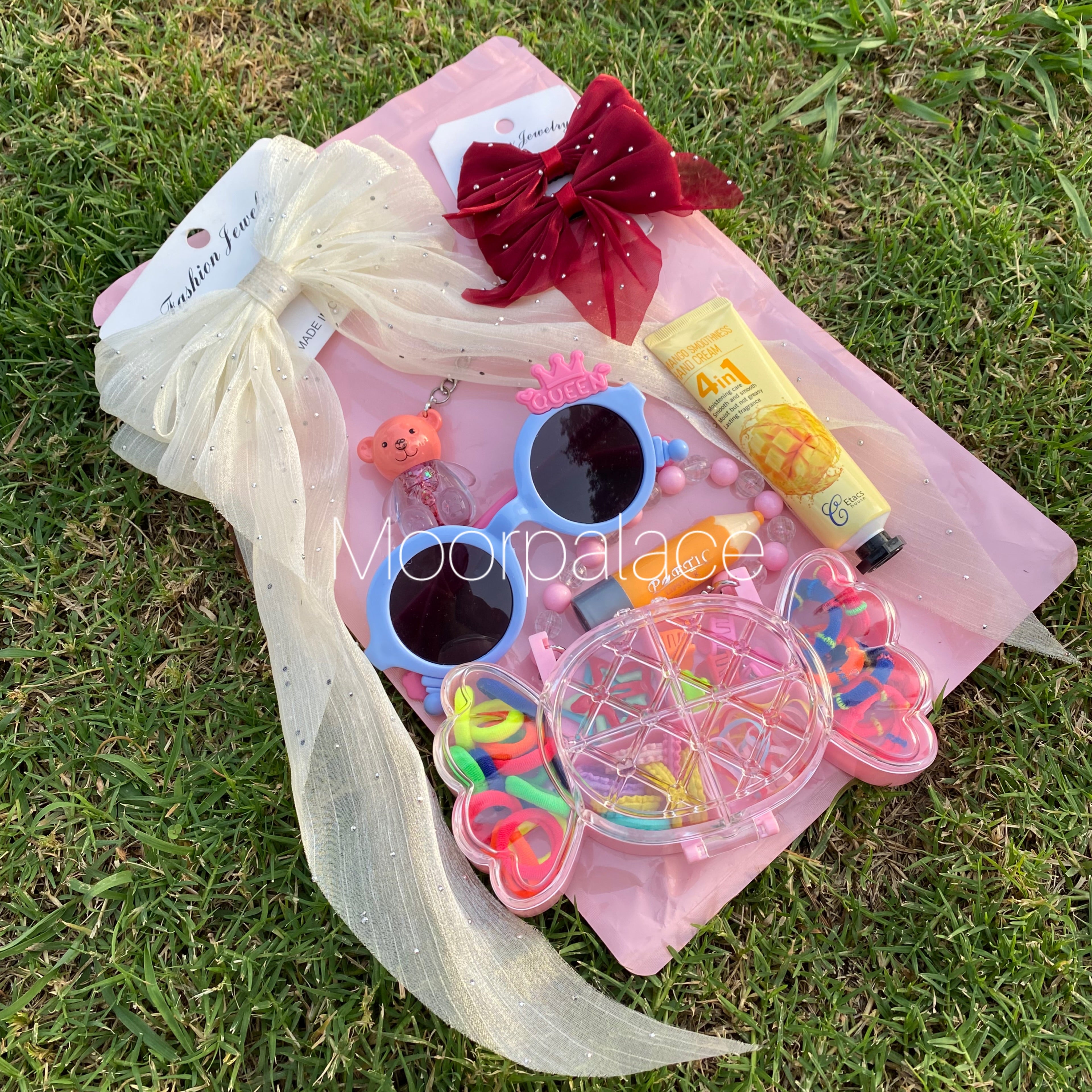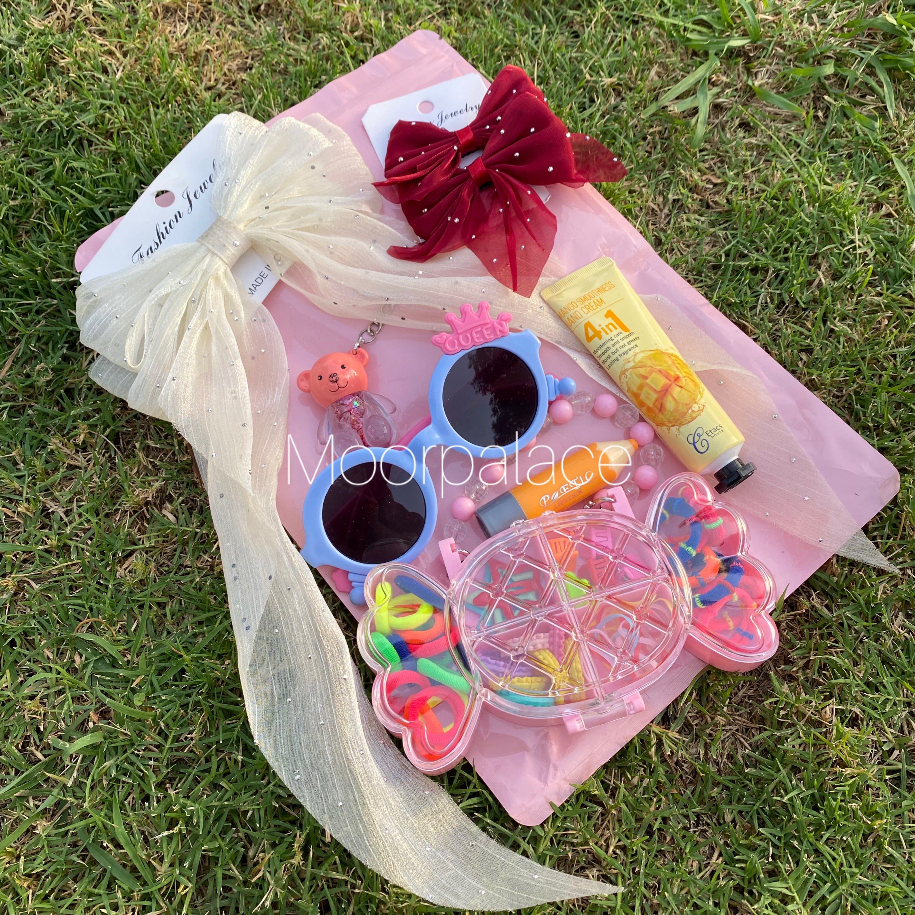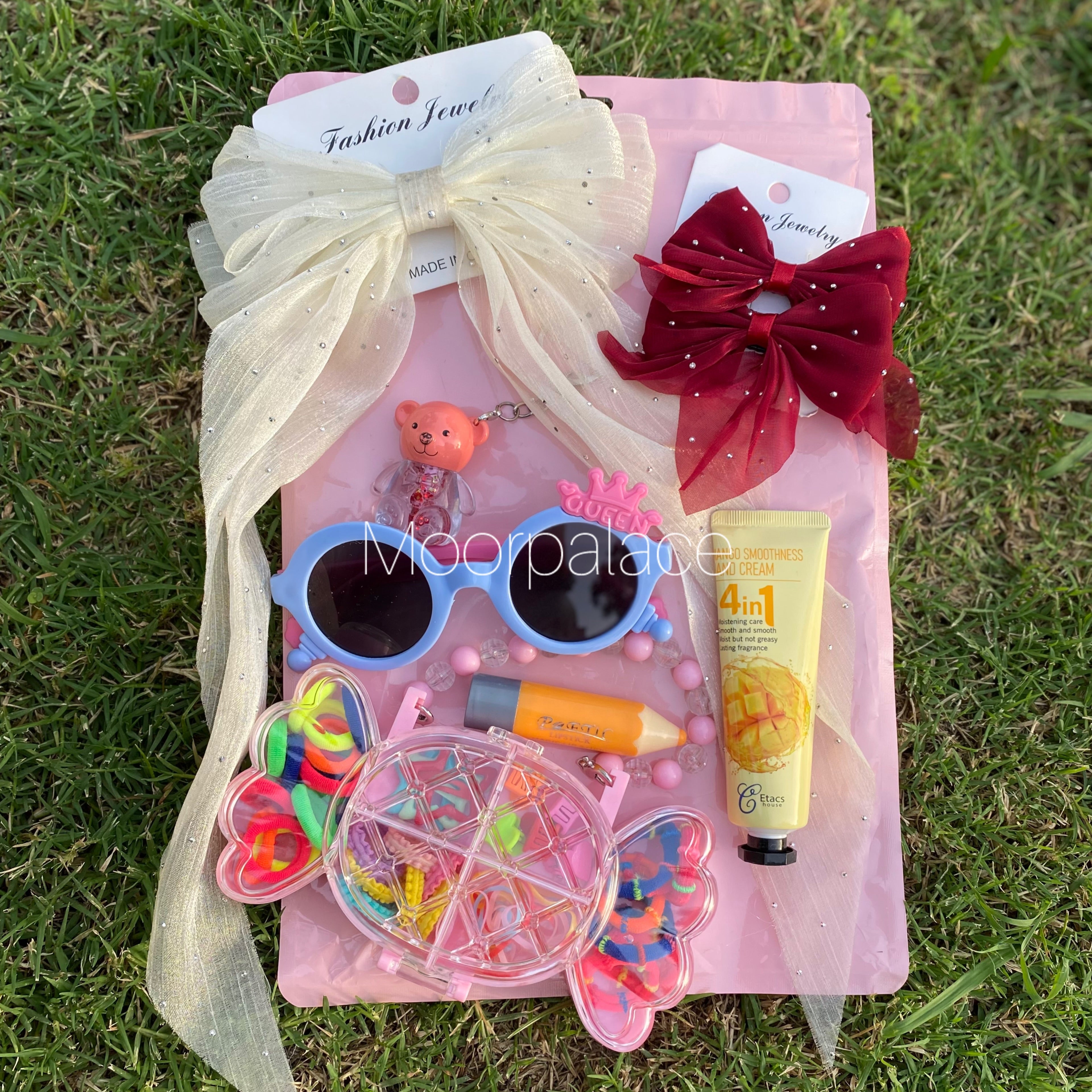 This cute deal is enough to make your little one the happiest. It includes one big bow, one small bow clip, one cute glasses, hand cream, lip balm, bear gloss and big size hair accessories cute candy box.