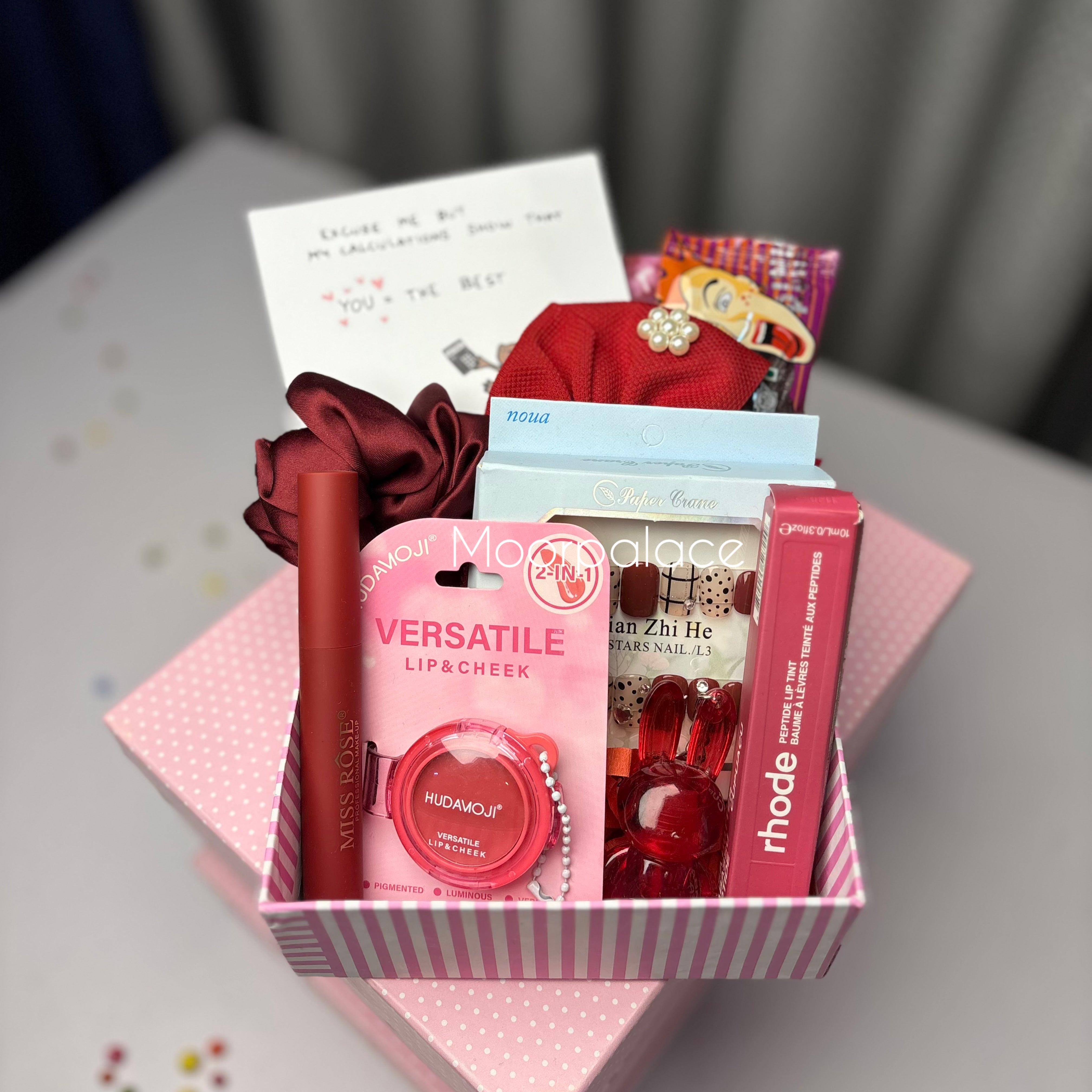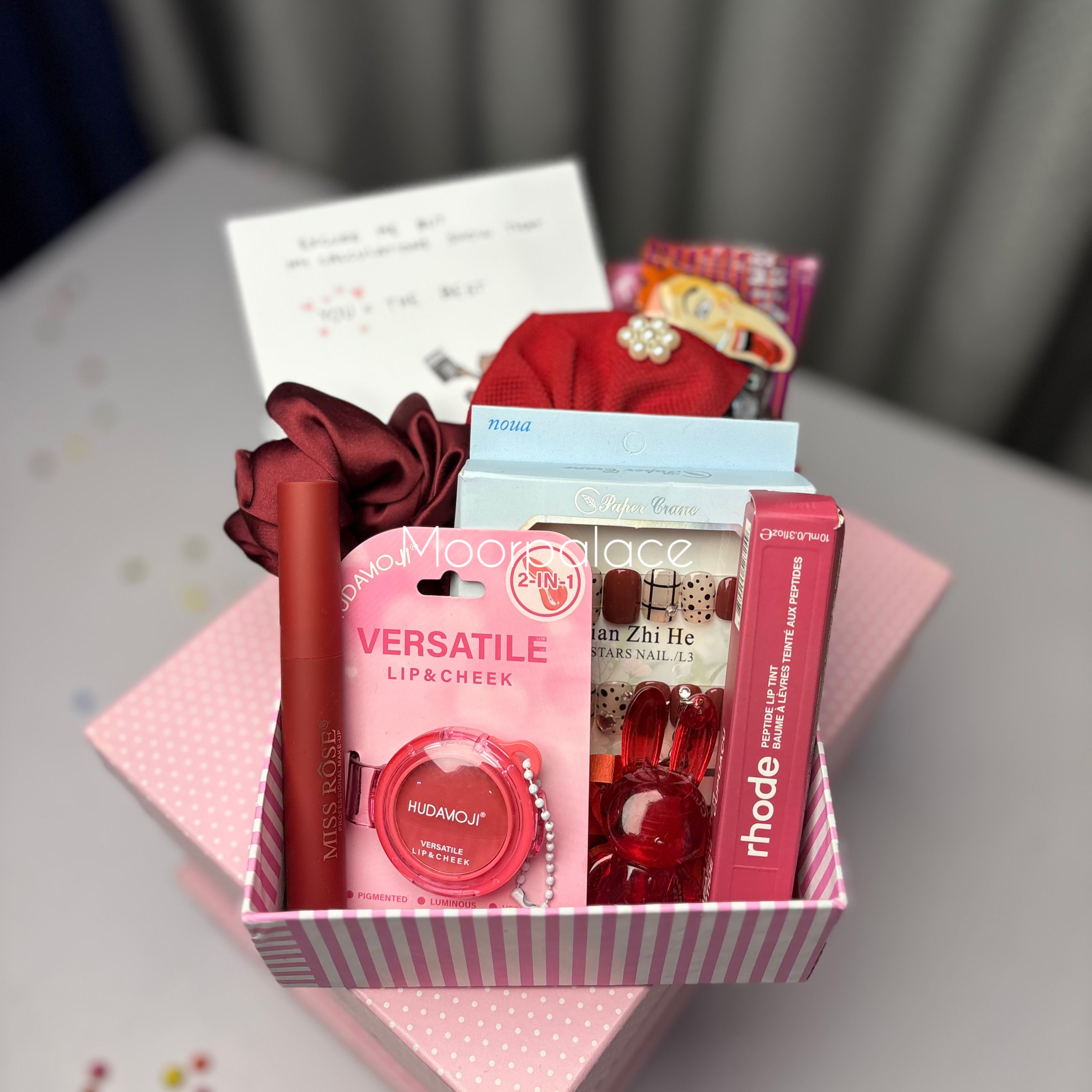 This cutest yet luxury box has nail box, hair bow, tint, lip and cheek blush, matte gloss, scrunchies, lip peptide and jelly wrapped in a beautiful box.