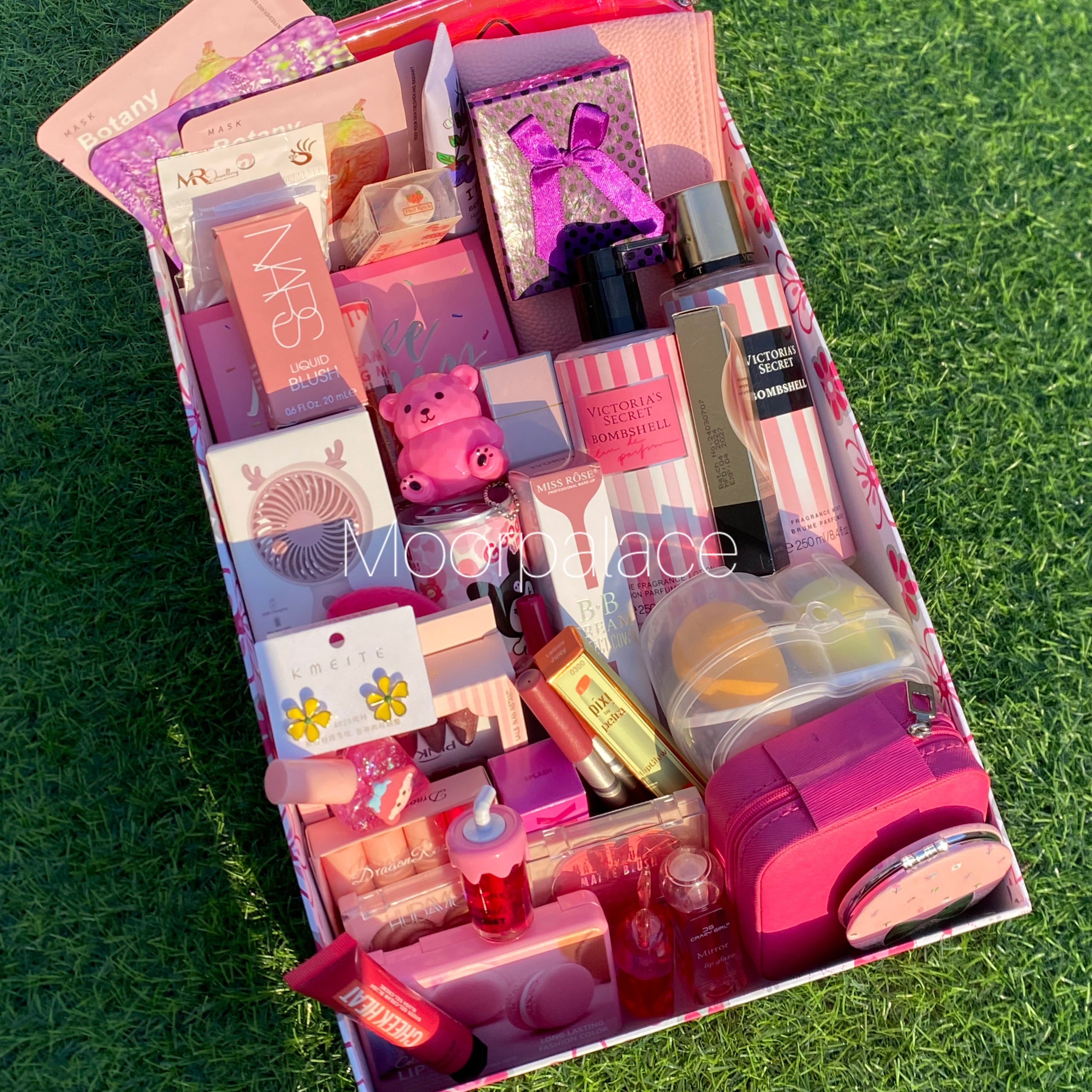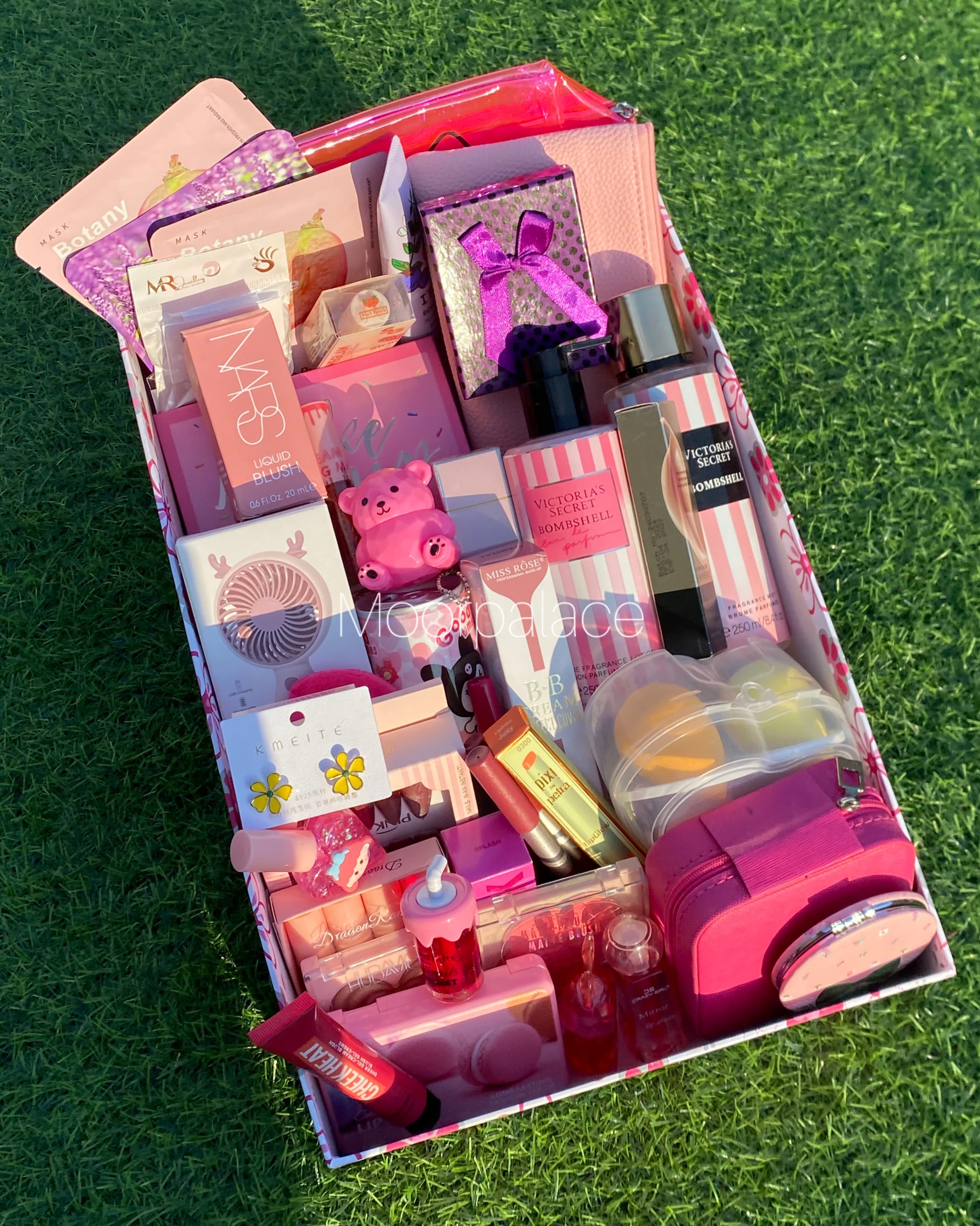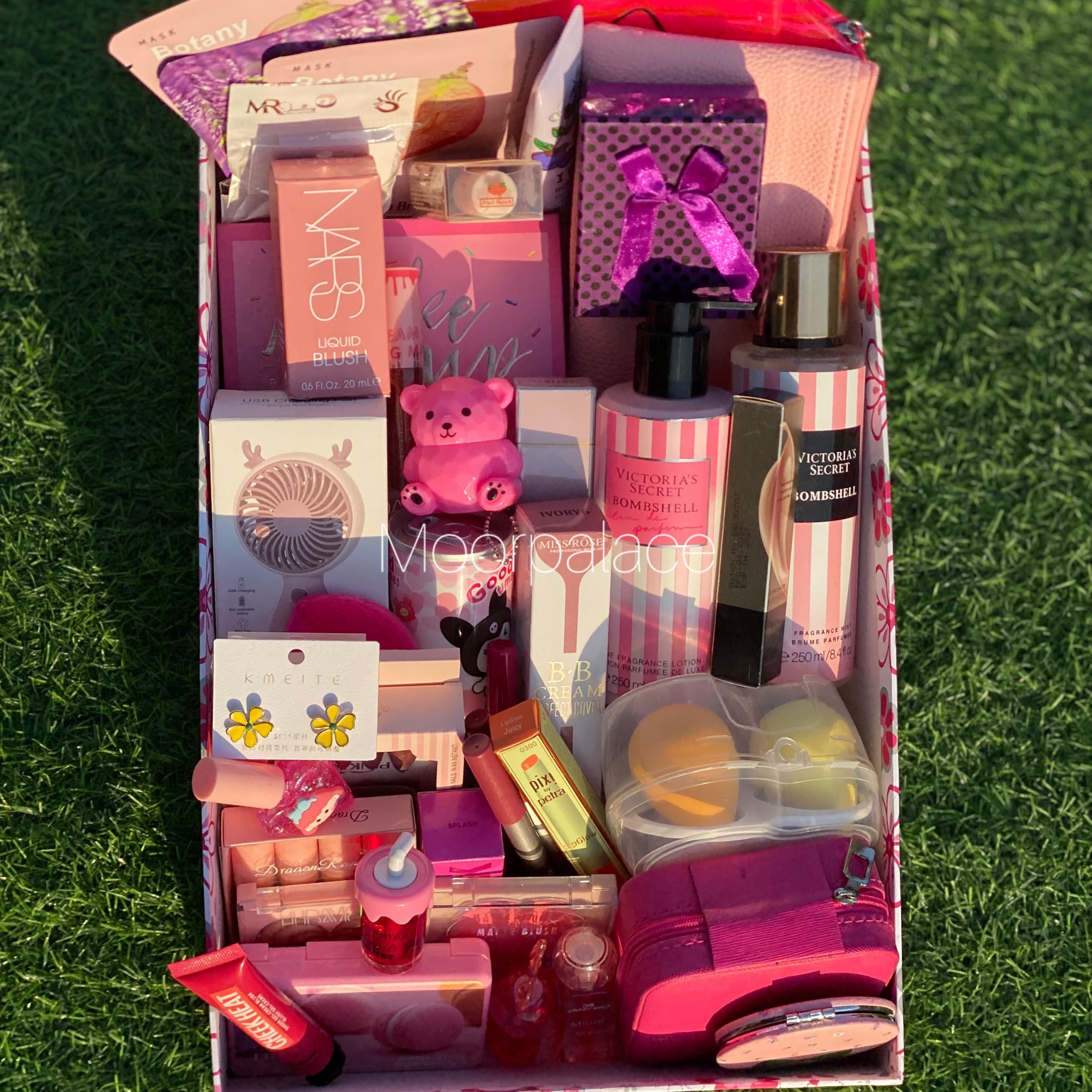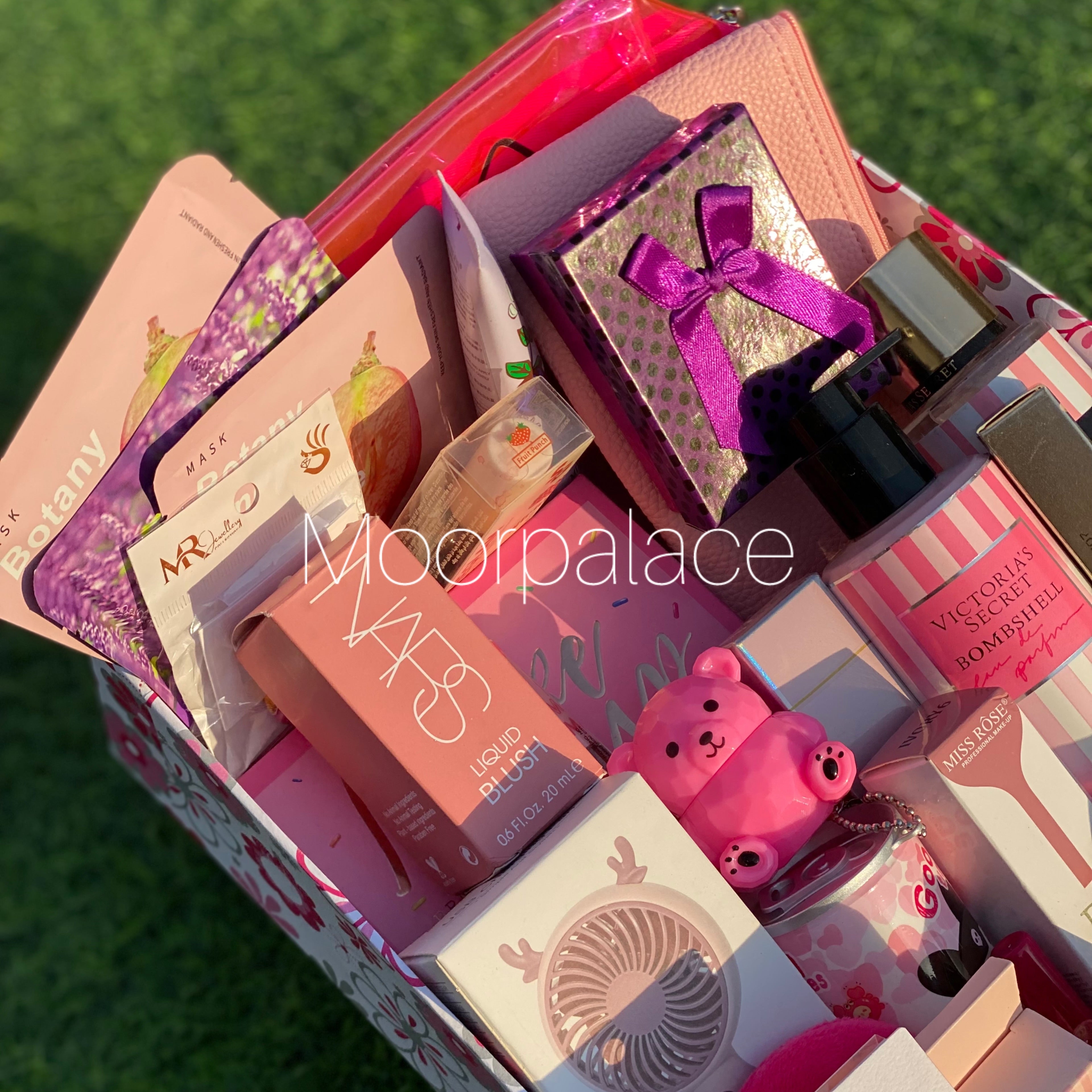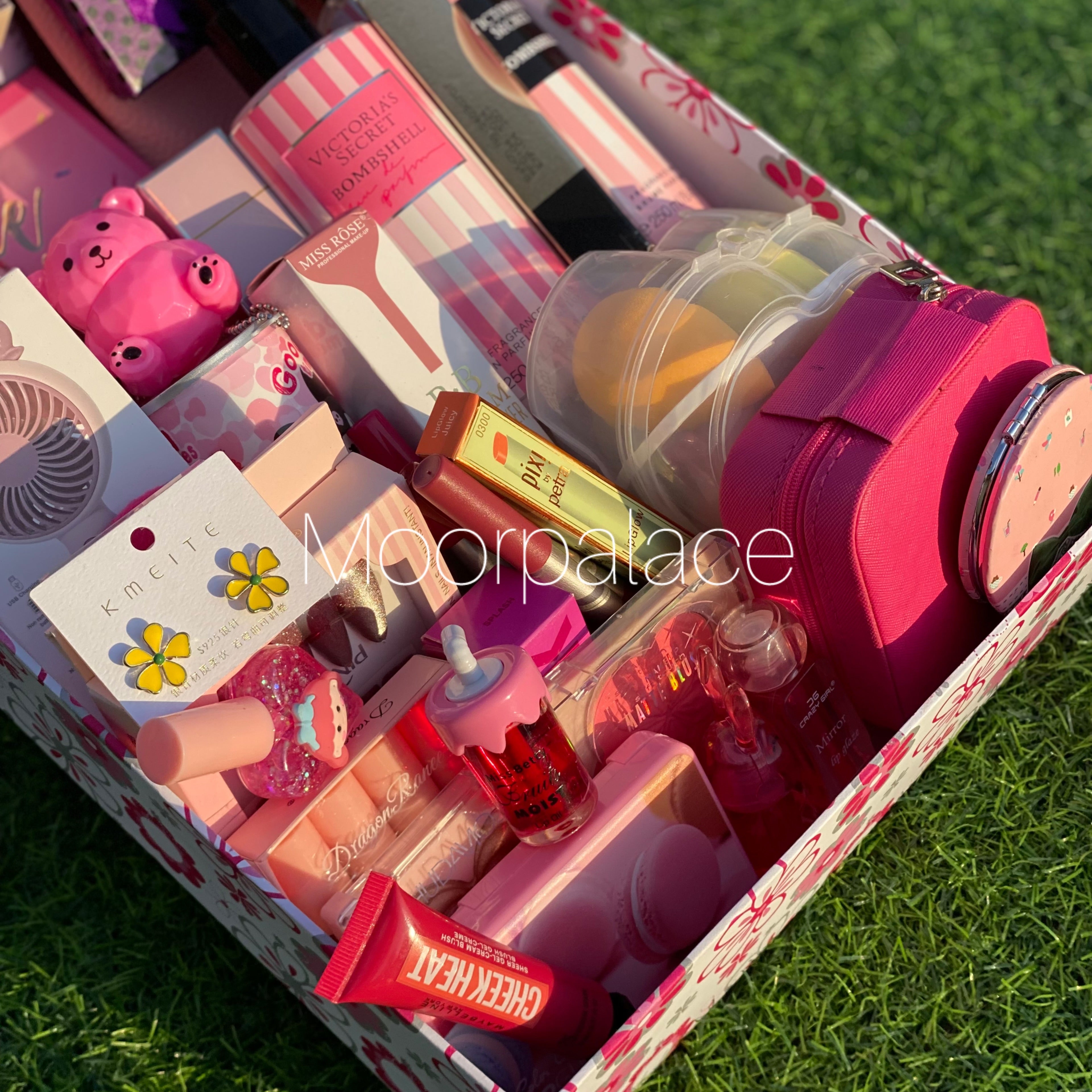 Strawberry deal includes cutest product for our cutest girlies. It includes mirror, jewellery organizer, matte gloss box, branded mist and lotion, BB cream, 3 sheet mask, makeup pouch, jewellery pieces, all in one makeup pallete, 2 liquid blush, bear balm, pen perfume, fan, can wipes, ear studs, artificial nails, 2 lip liners, tinted gloss, set of glossy glosses, tint, blush, highlighter and concealer
