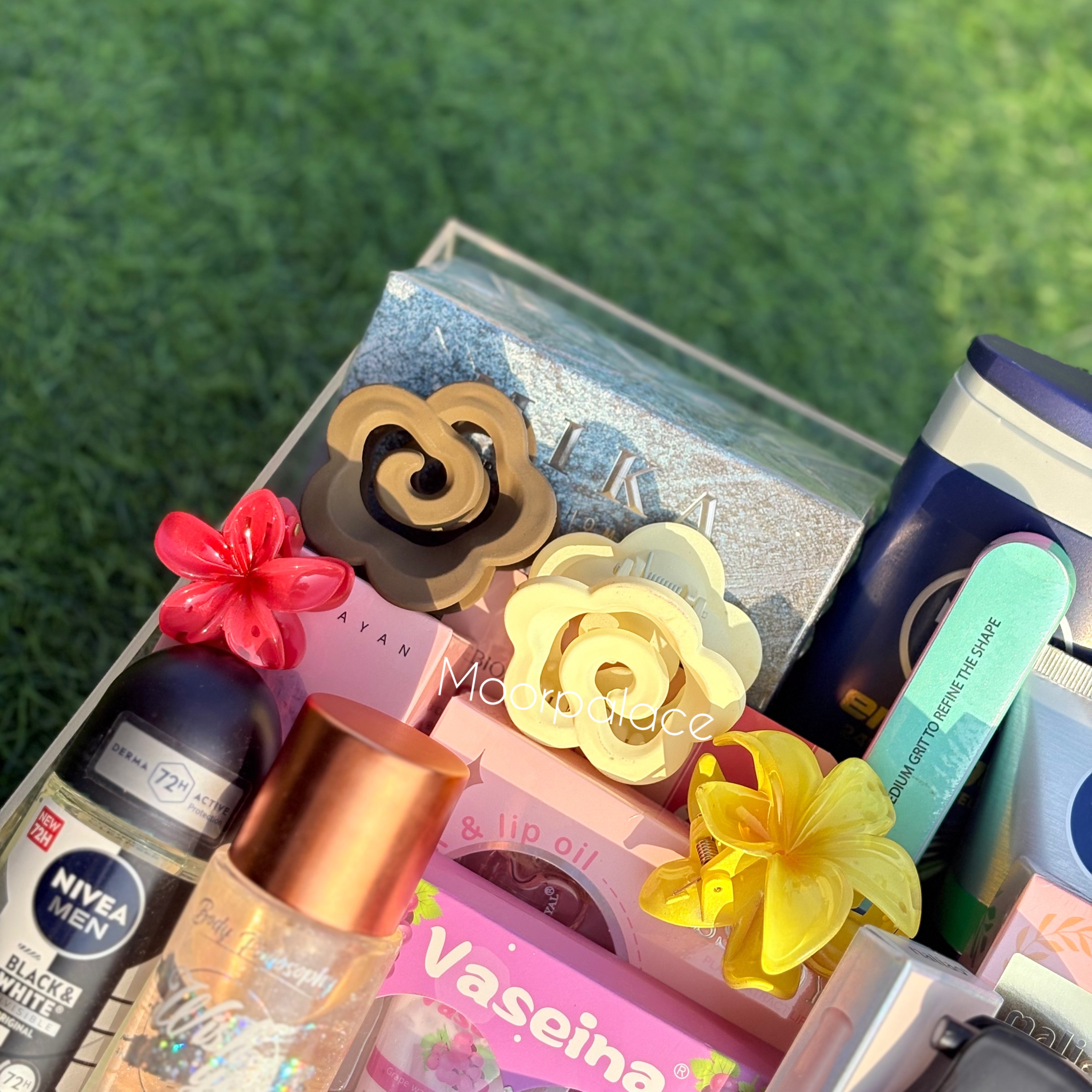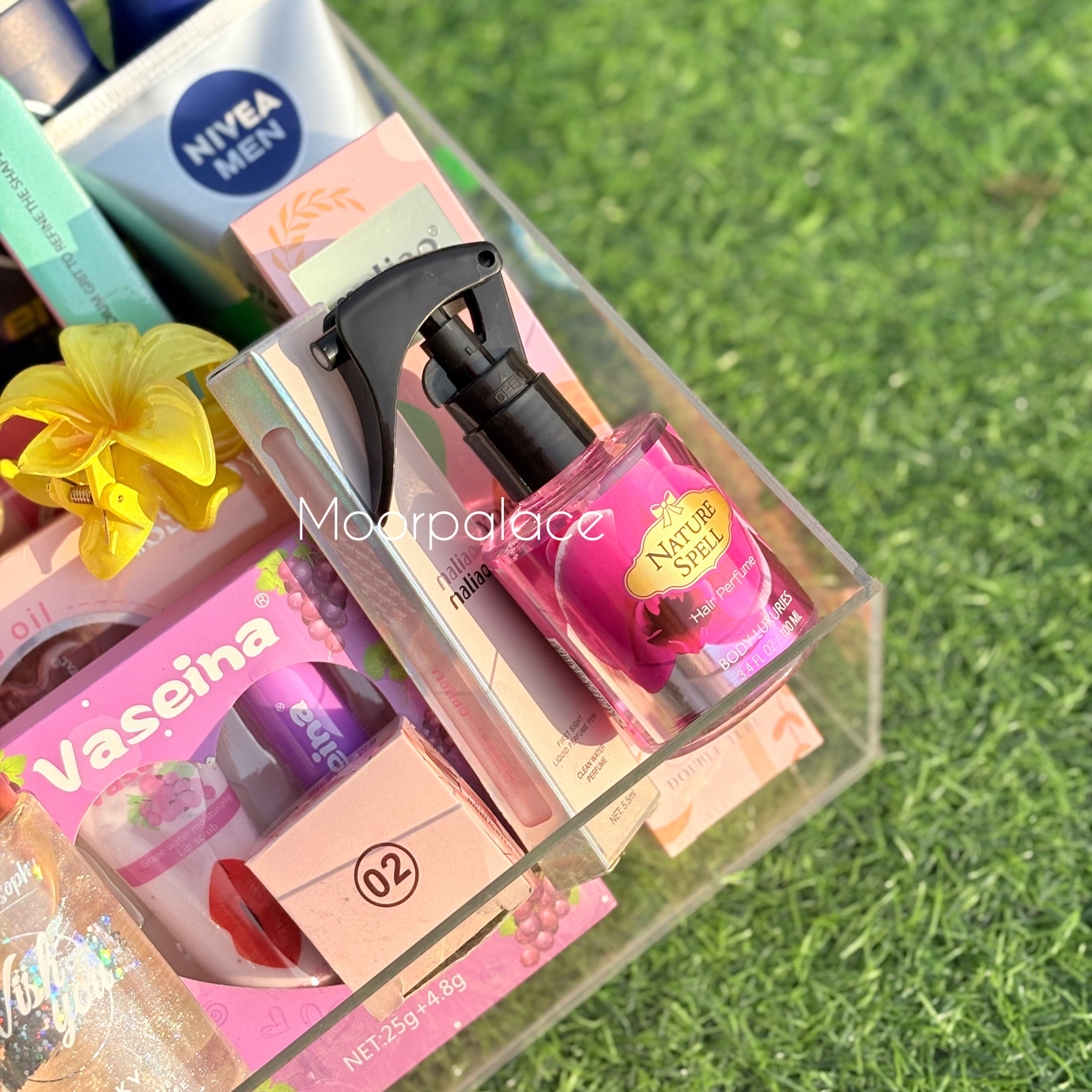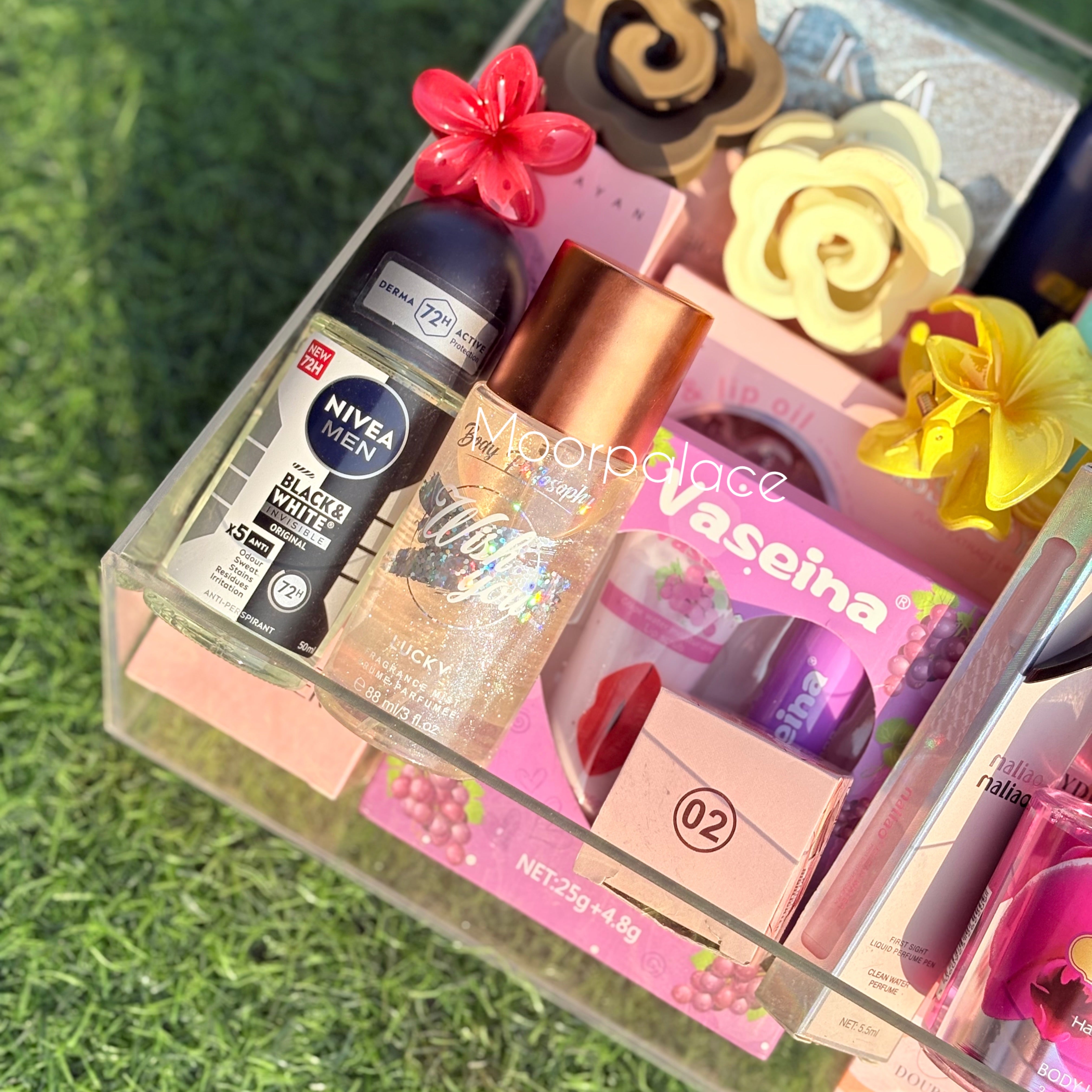 It includes claw catchers, lip scrub and balm, highlighter and blush, mist, pen perfume, hair mist, cleanser and body cream.