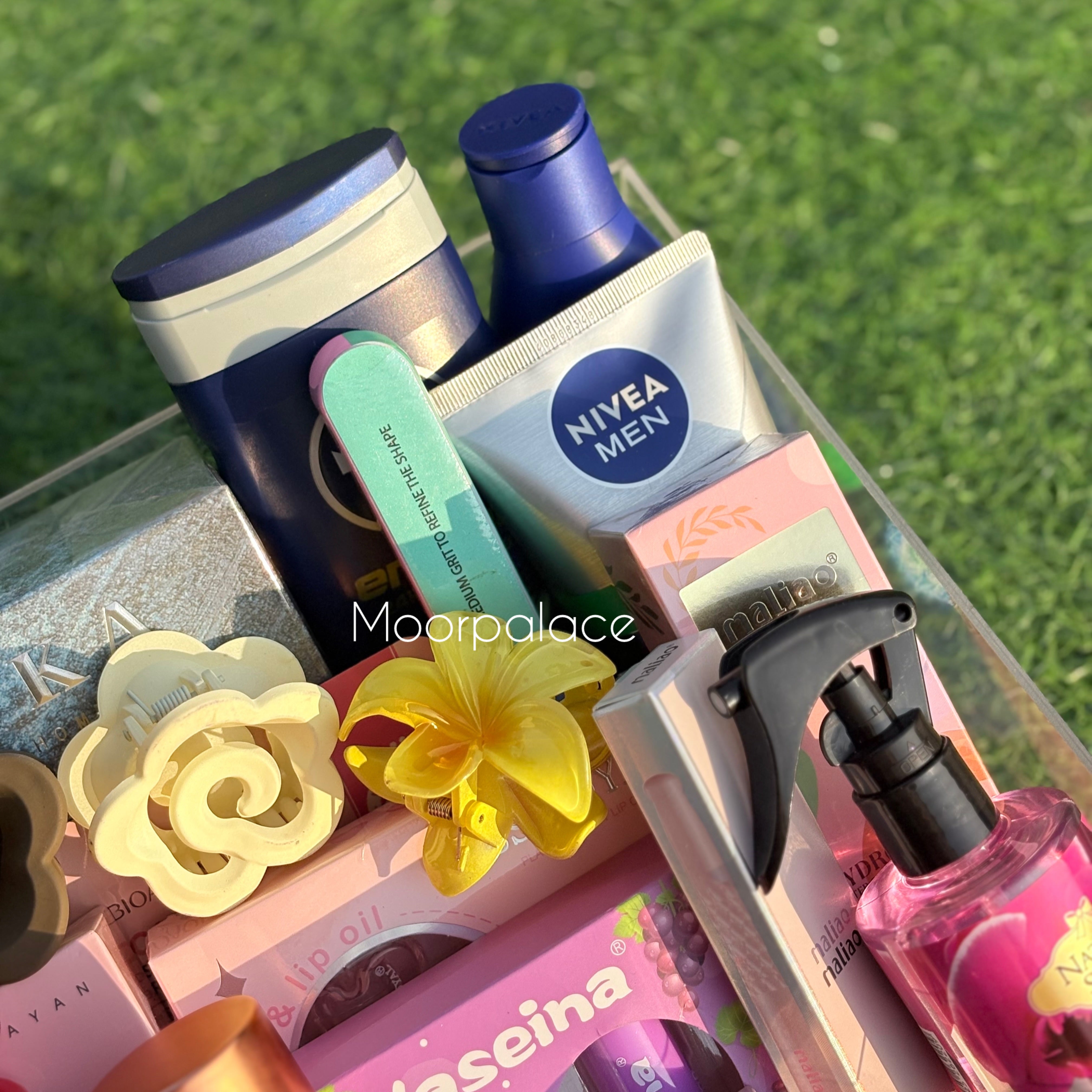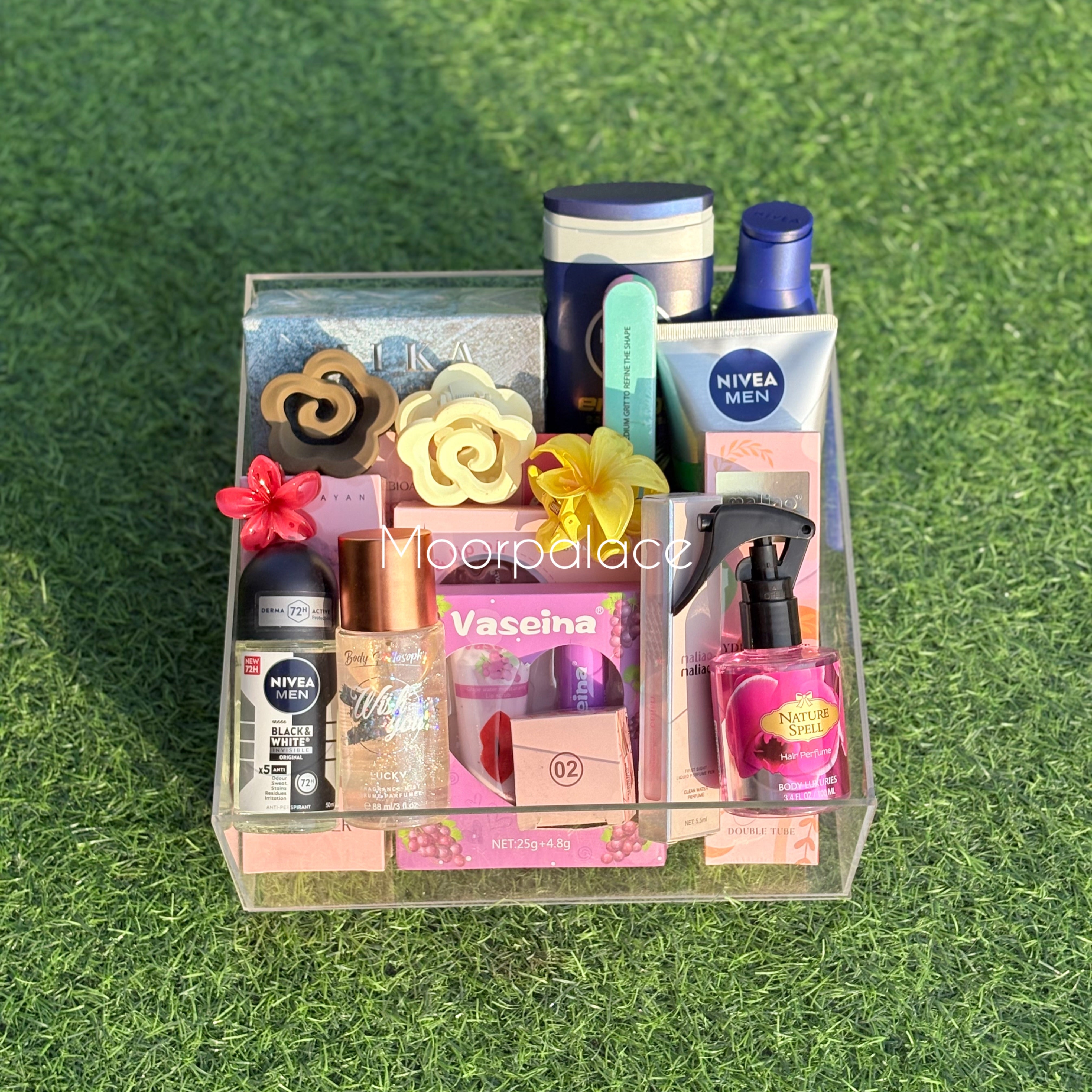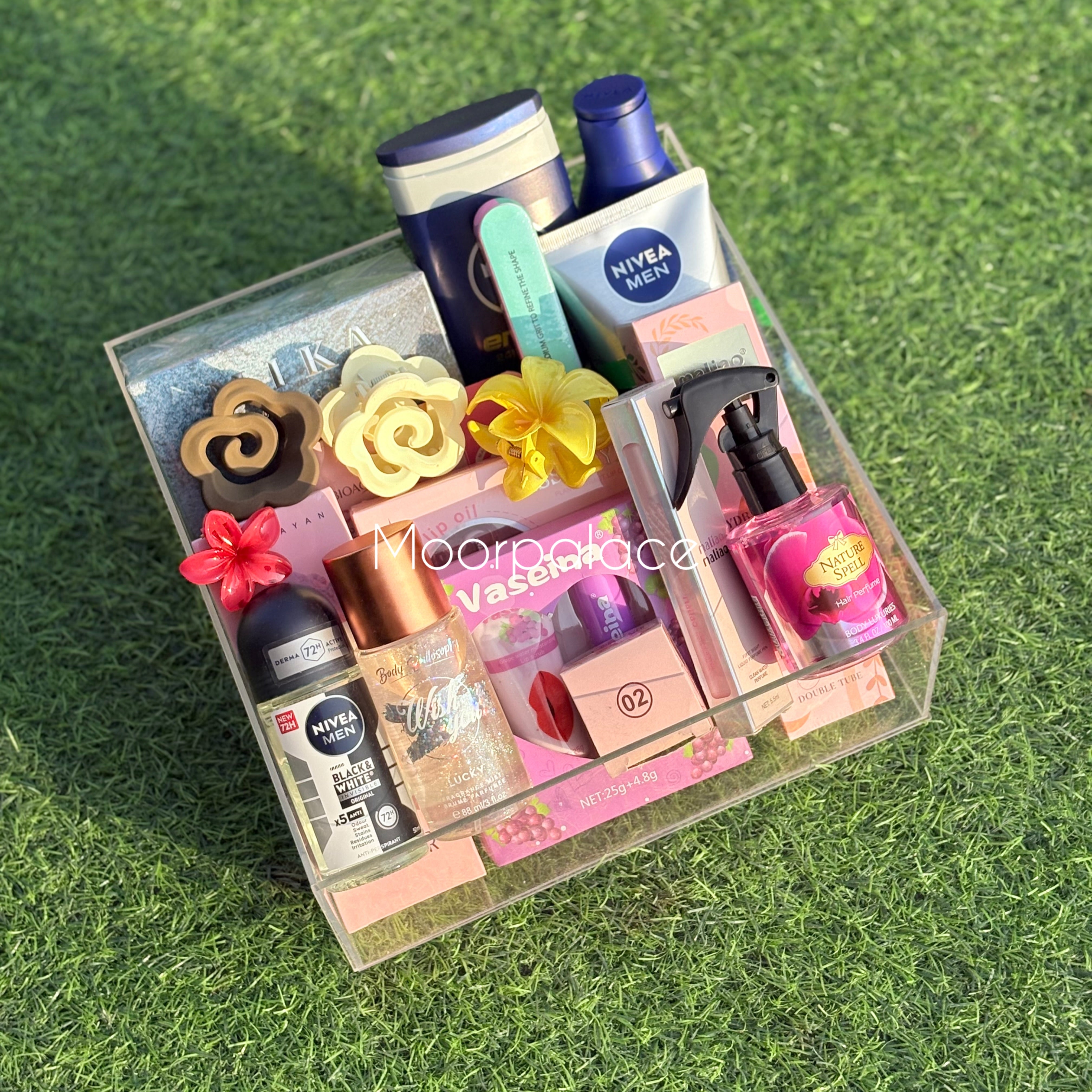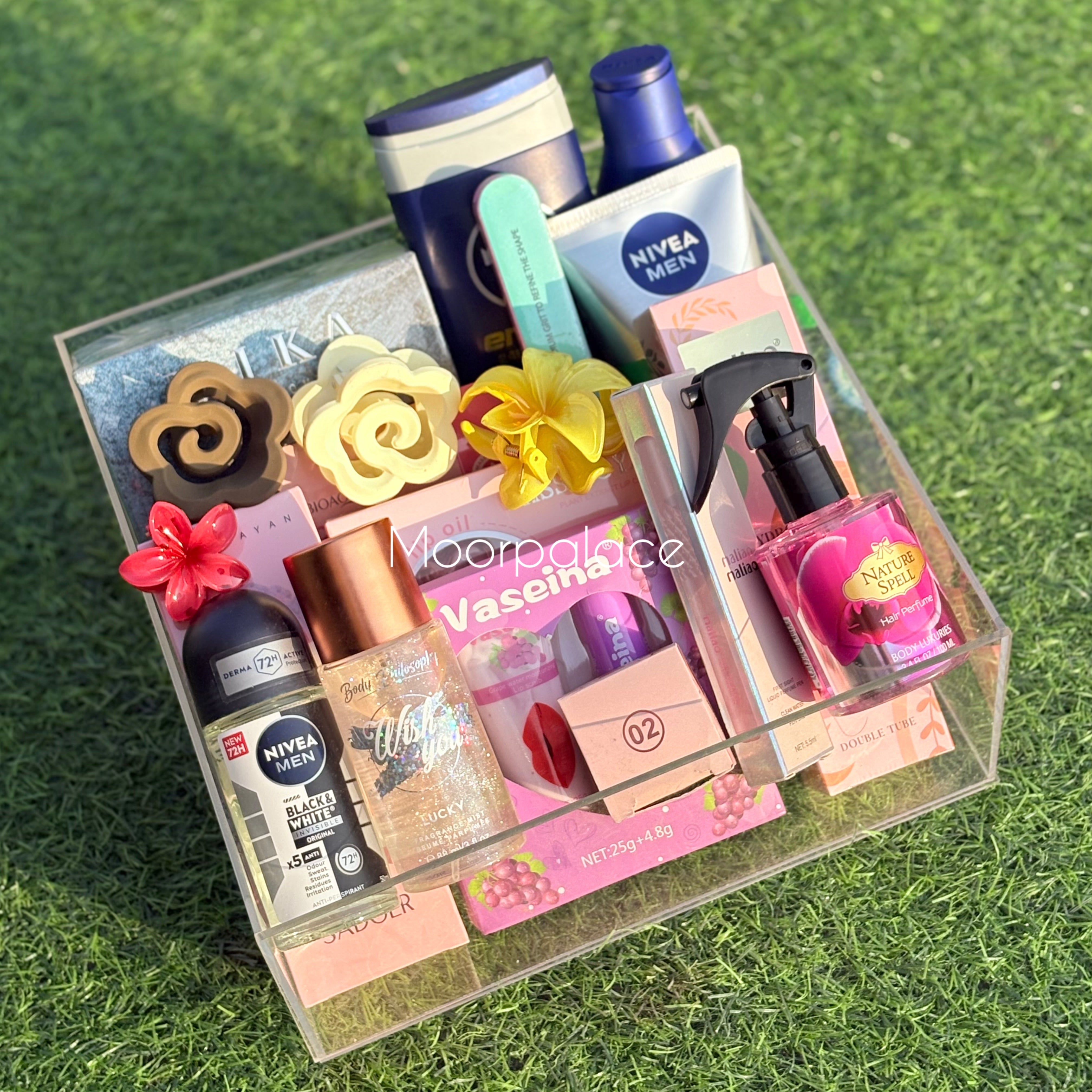 It includes claw catchers, lip scrub and balm, highlighter and blush, mist, pen perfume, hair mist, cleanser and body cream.