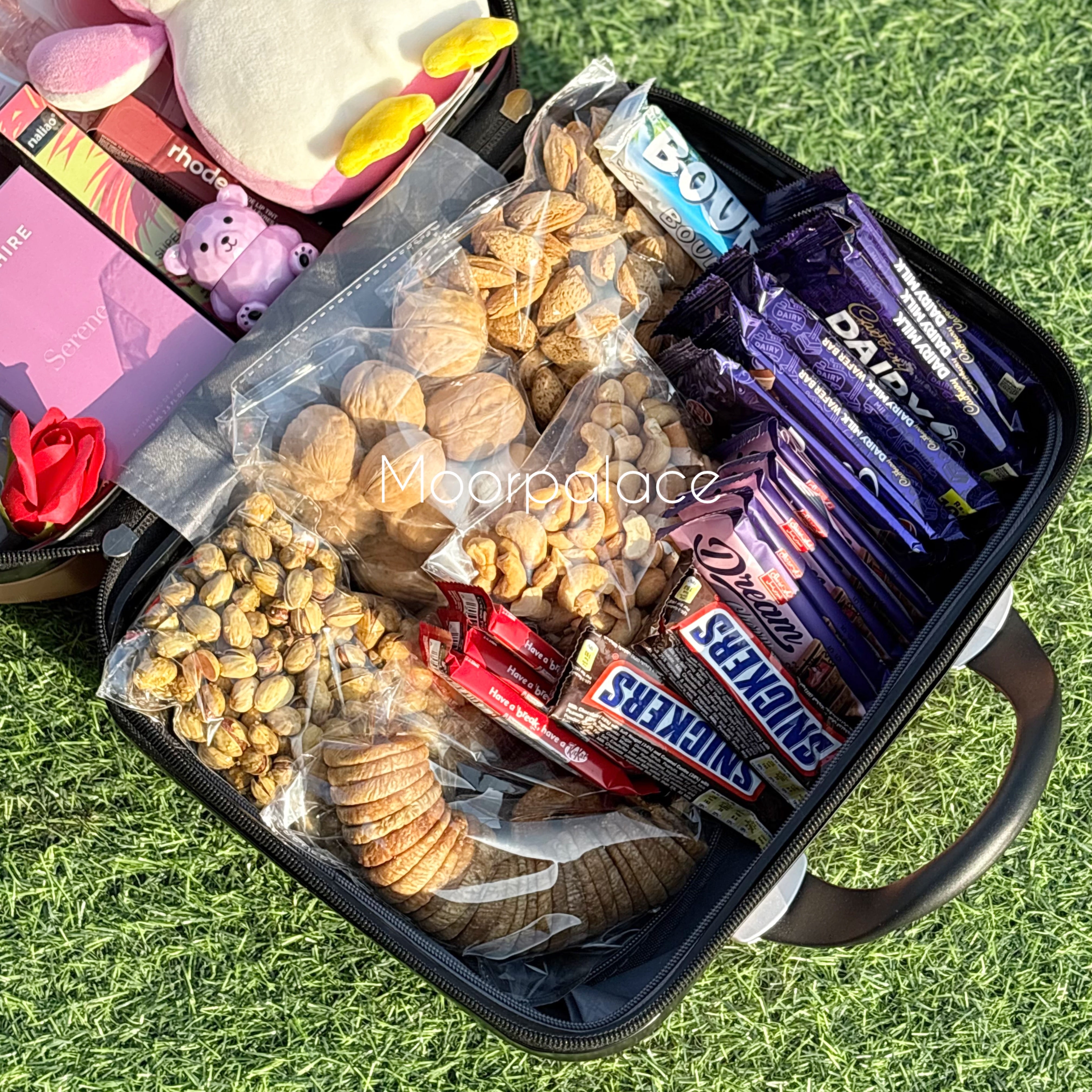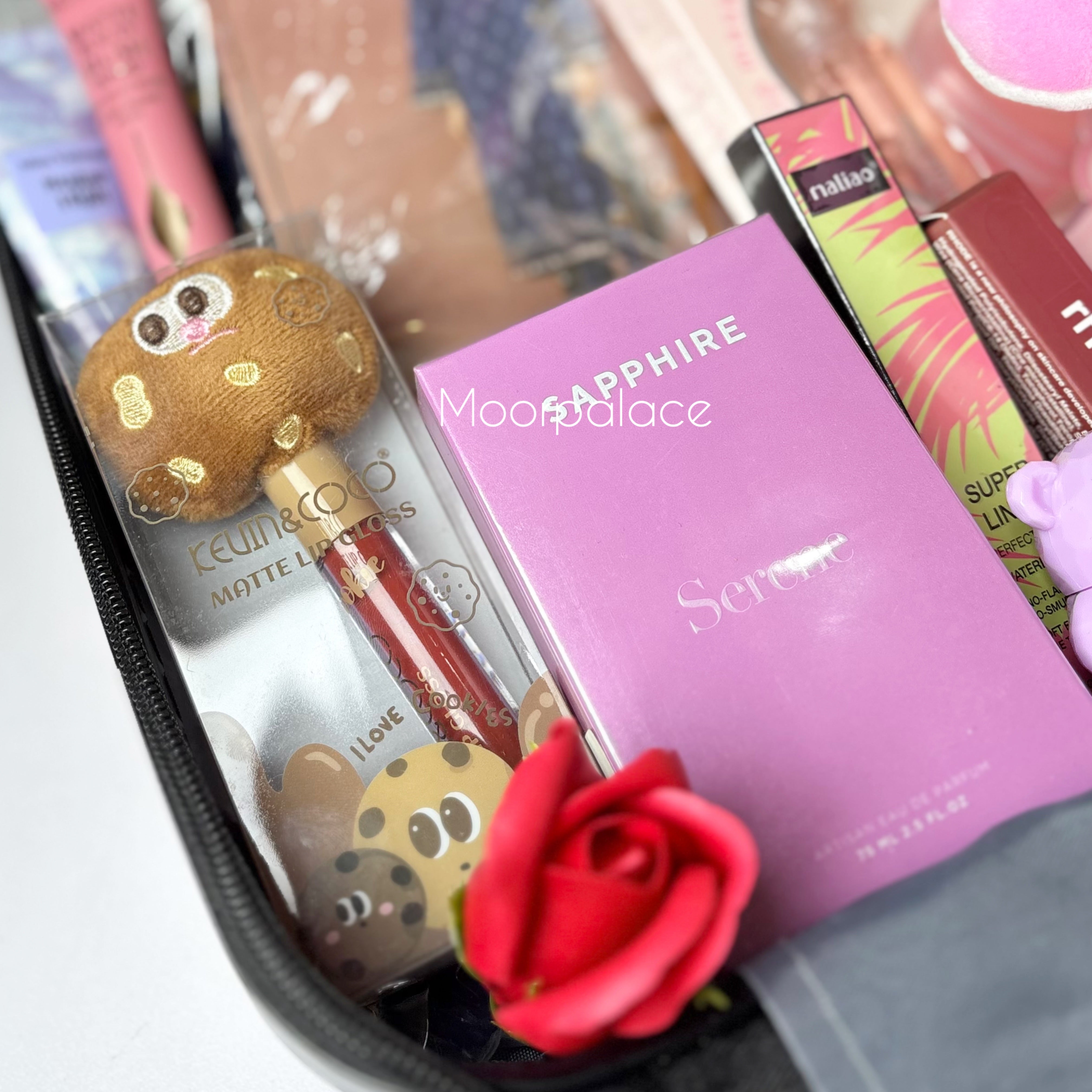 This cute suitcase is filled with treasures - dress sapphire perfume, lip care set, hand cream, plush penguin, dry fruits, and more! Perfect as a gift, it's sure to delight with a variety of adorable items.
