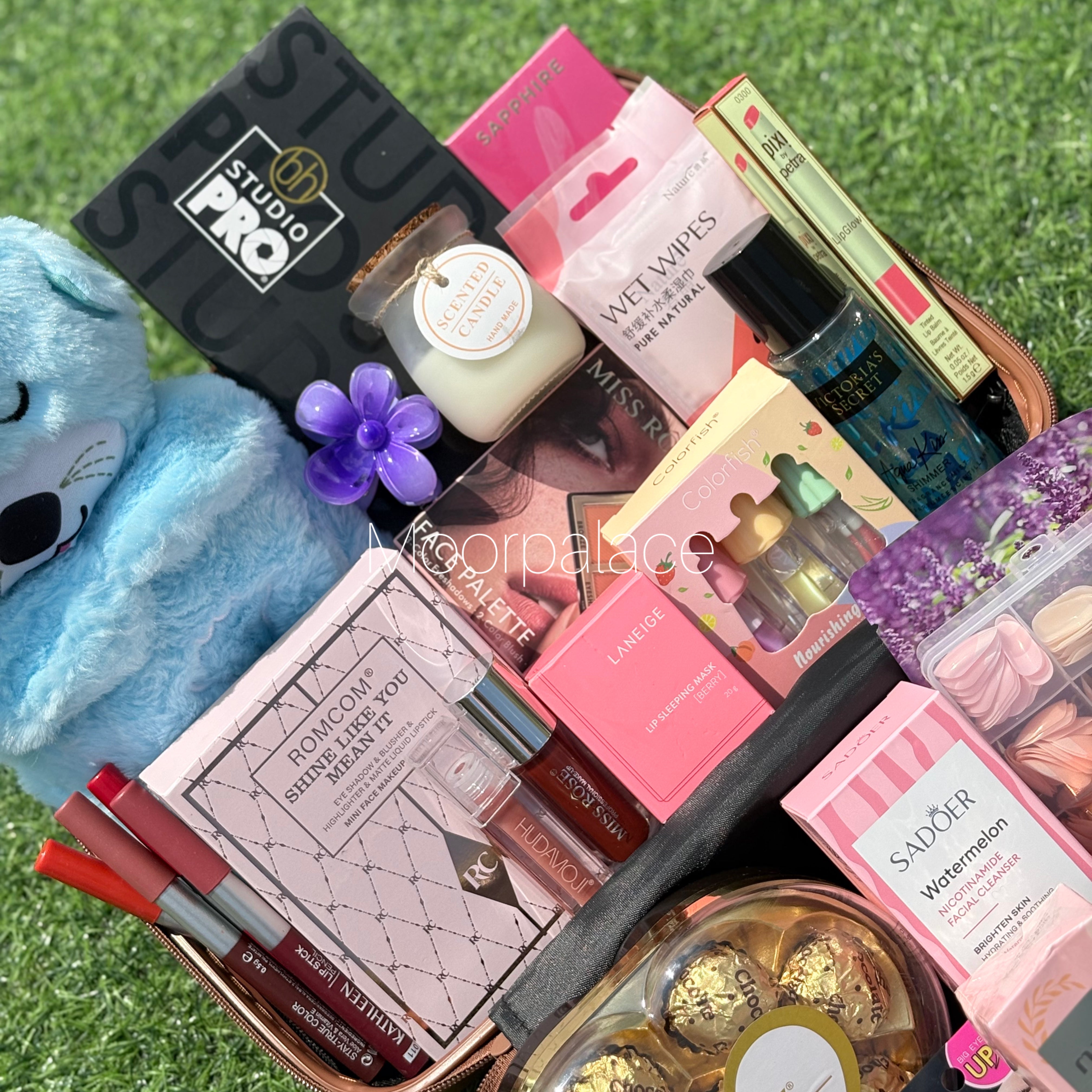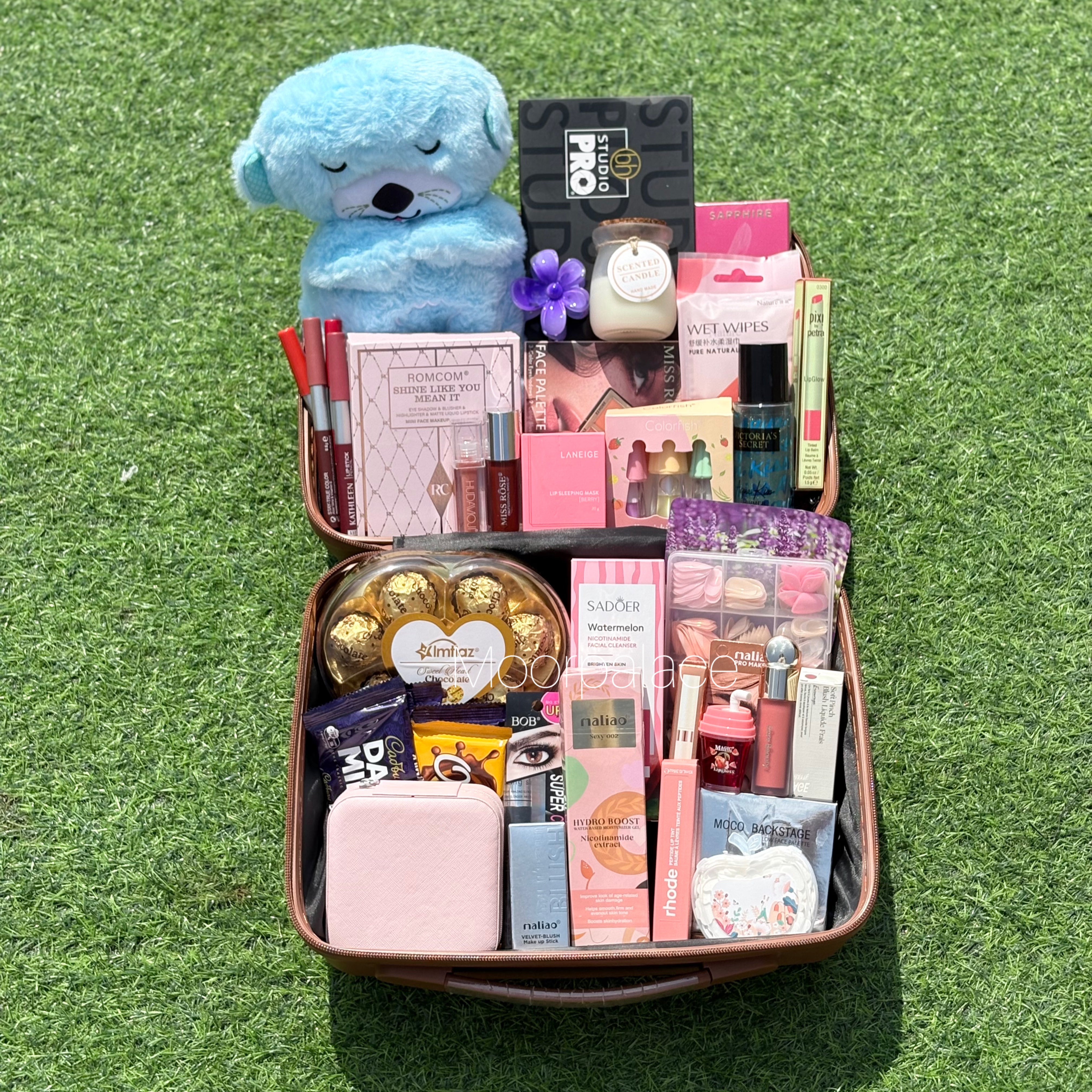 Introducing the Wow Suitcase Deal. A beautiful and practical suitcase that's perfect for traveling and gifting. This suitcase has a cutest breathing teddy, a set of full face makeup brushes, all in one eyeshadow palette, cleanser, 6 in 1 blush palette, pack of 3 lip oils, nail-box, jewellery organiser, tint, liner, paper soap, lip mask, lip gloss, tinted gloss, highlighter palette, stick blush, lip liners, hair accessories, mascara, wet wipes, sapphire perfume, rare liquid blush along with some delicious chocolates.